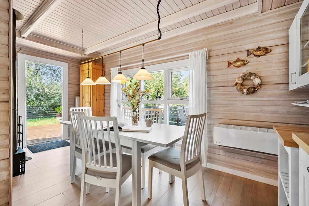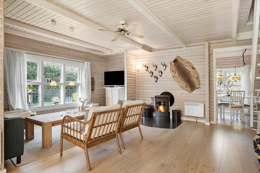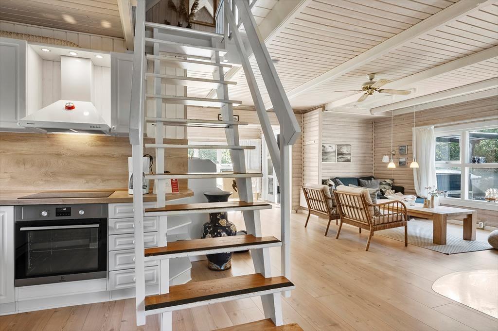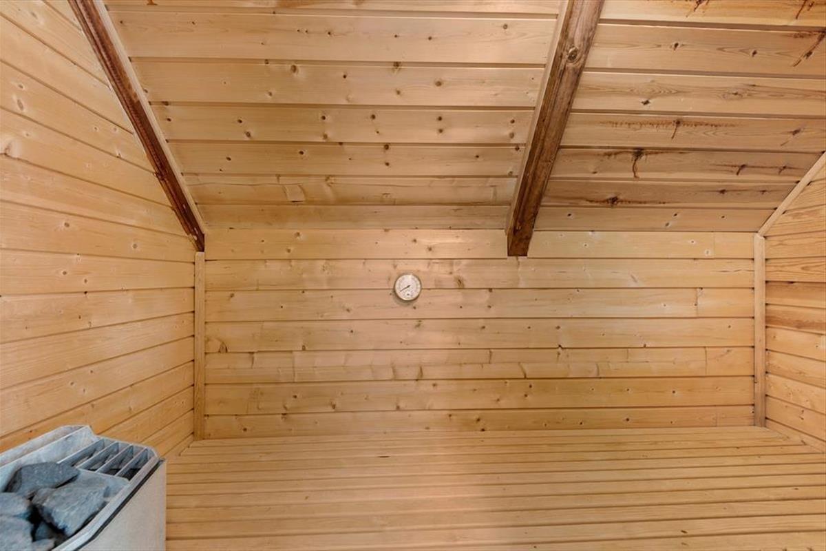 Trete ein und genieße die warme und einladende Atmosphäre, die dich erwartet. Mit rustikaler Holzverkleidung an den Wänden, einem Kamin und Blick auf das grüne Grundstück ist alles bereit für deine entspannte Zeit in diesem charmanten Wohnzimmer. Hier findest du auch verschiedene gemütliche Ecken, je nachdem, ob du lesen, Filme schauen, Brettspiele spielen oder einfach nur ein leckeres Essen genießen möchtest. Die offene, gut ausgestattete Küche lädt zum Kochen ein, und über eine Treppe gelangst du ins Obergeschoss, wo sich drei gemütliche Schlafzimmer befinden. Dort oben findest du sogar eine Sauna neben einem Toilettenraum, während sich das Badezimmer mit Dusche im Erdgeschoss befindet.