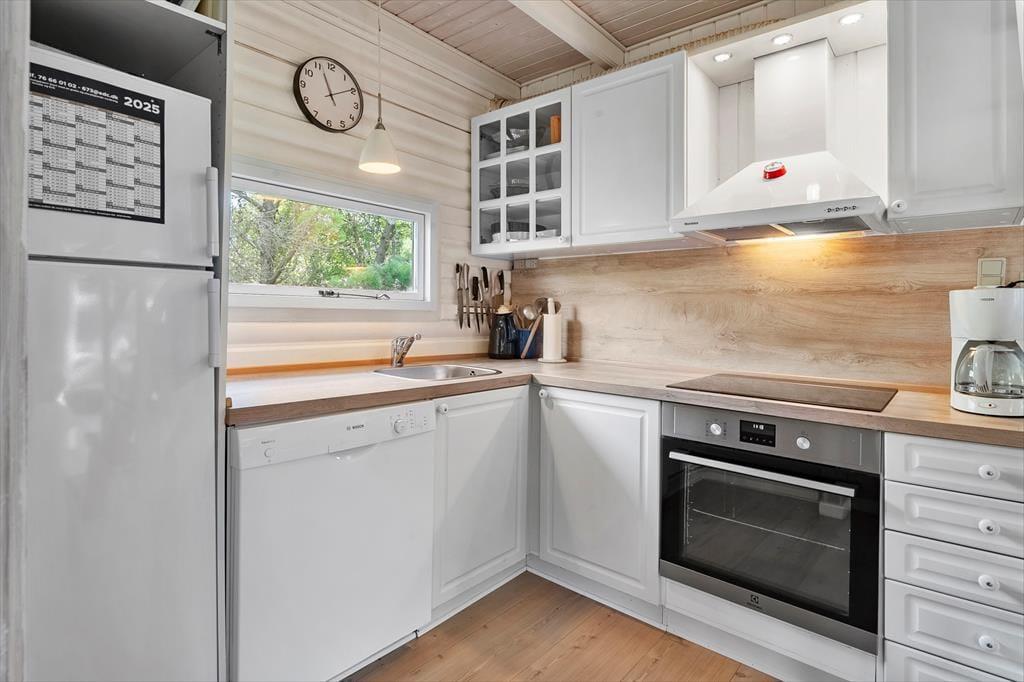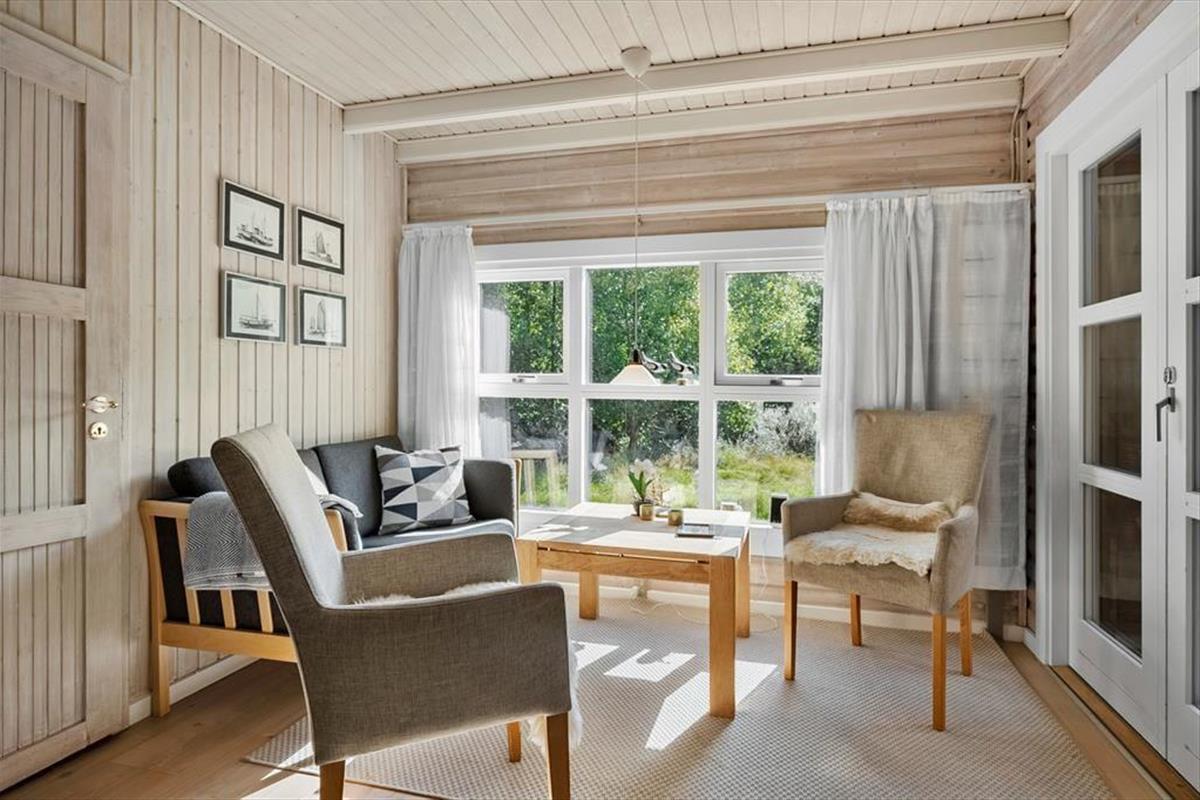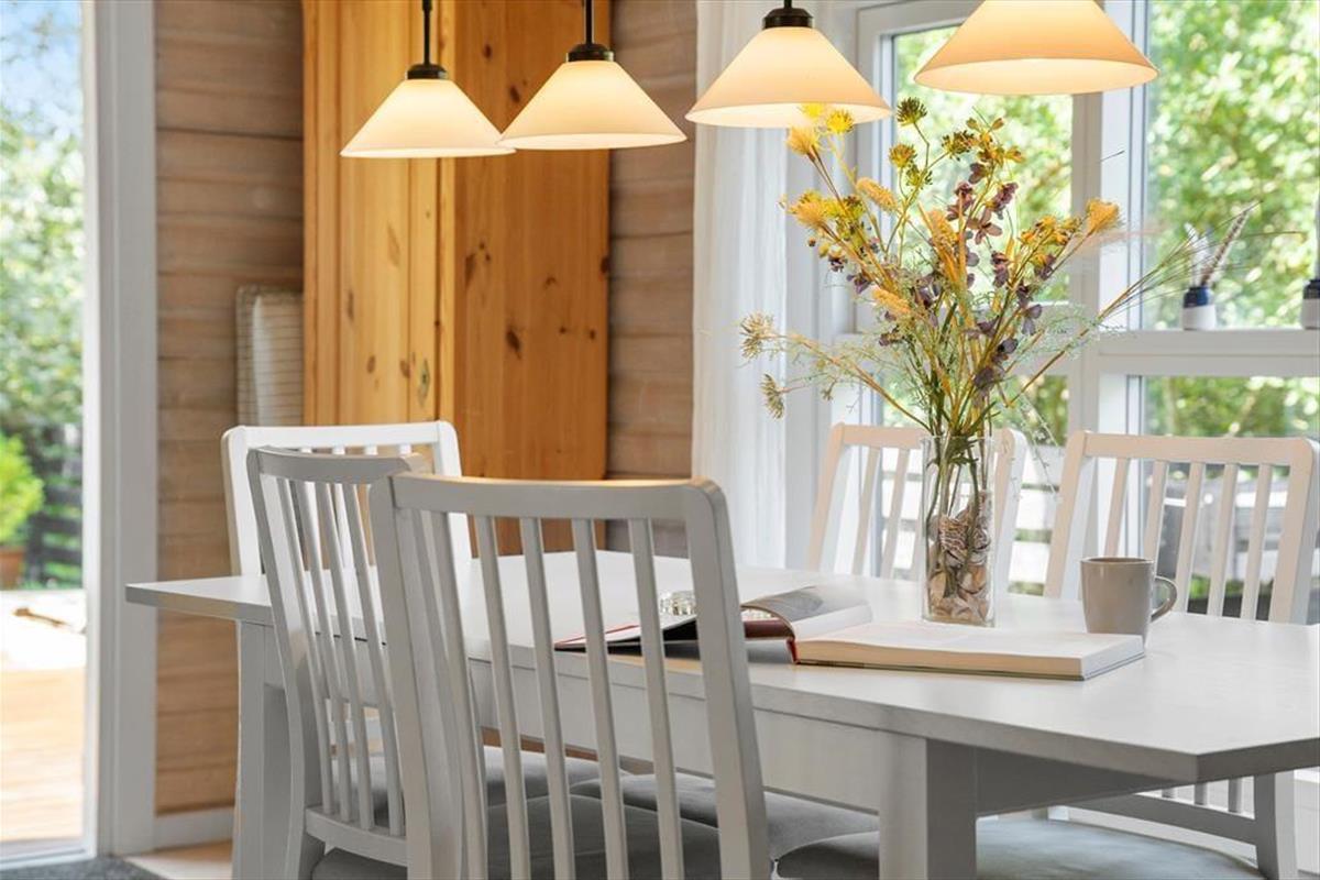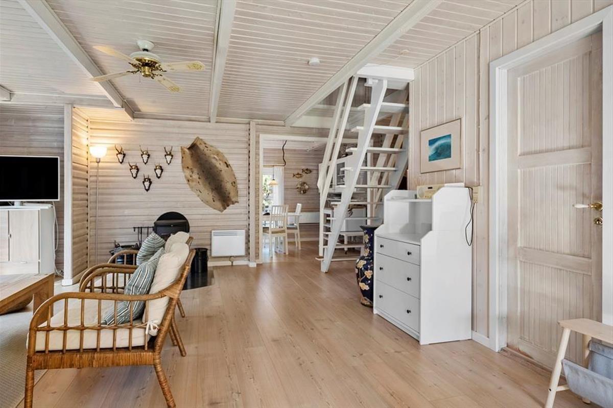 Trete ein und genieße die warme und einladende Atmosphäre, die dich erwartet. Mit rustikaler Holzverkleidung an den Wänden, einem Kamin und Blick auf das grüne Grundstück ist alles bereit für deine entspannte Zeit in diesem charmanten Wohnzimmer. Hier findest du auch verschiedene gemütliche Ecken, je nachdem, ob du lesen, Filme schauen, Brettspiele spielen oder einfach nur ein leckeres Essen genießen möchtest. Die offene, gut ausgestattete Küche lädt zum Kochen ein, und über eine Treppe gelangst du ins Obergeschoss, wo sich drei gemütliche Schlafzimmer befinden. Dort oben findest du sogar eine Sauna neben einem Toilettenraum, während sich das Badezimmer mit Dusche im Erdgeschoss befindet.