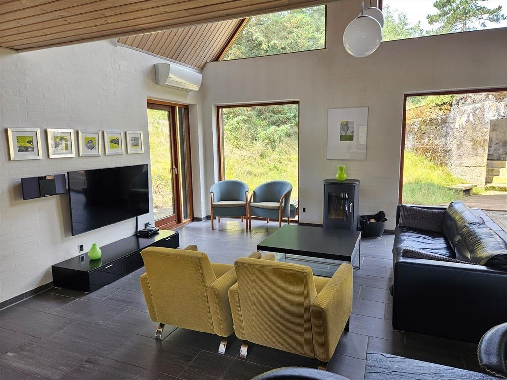 Die Außenbereiche sind etwas Besonderes, denn das bewaldete Grundstück ist hügelig, und ein alter Bunker ist sogar in das Gelände integriert. Wenn du die Aussicht über die Landschaft genießen möchtest, kannst du dich auf die Spitze setzen, und auch die nächsten Terrassen des Hauses sind schöne Plätze zum Verweilen - zum Beispiel auf dem nach Süden ausgerichteten Bereich, wo du in ungestörter Umgebung die Sonne genießen kannst. Es wird sicherlich spannend für die Kinder sein, zwischen den Pflanzen des Naturgrundstücks zu spielen und zu erkunden, und für die Kleinsten gibt es sowohl eine Schaukel als auch einen Sandkasten, damit sie sich vergnügen können.