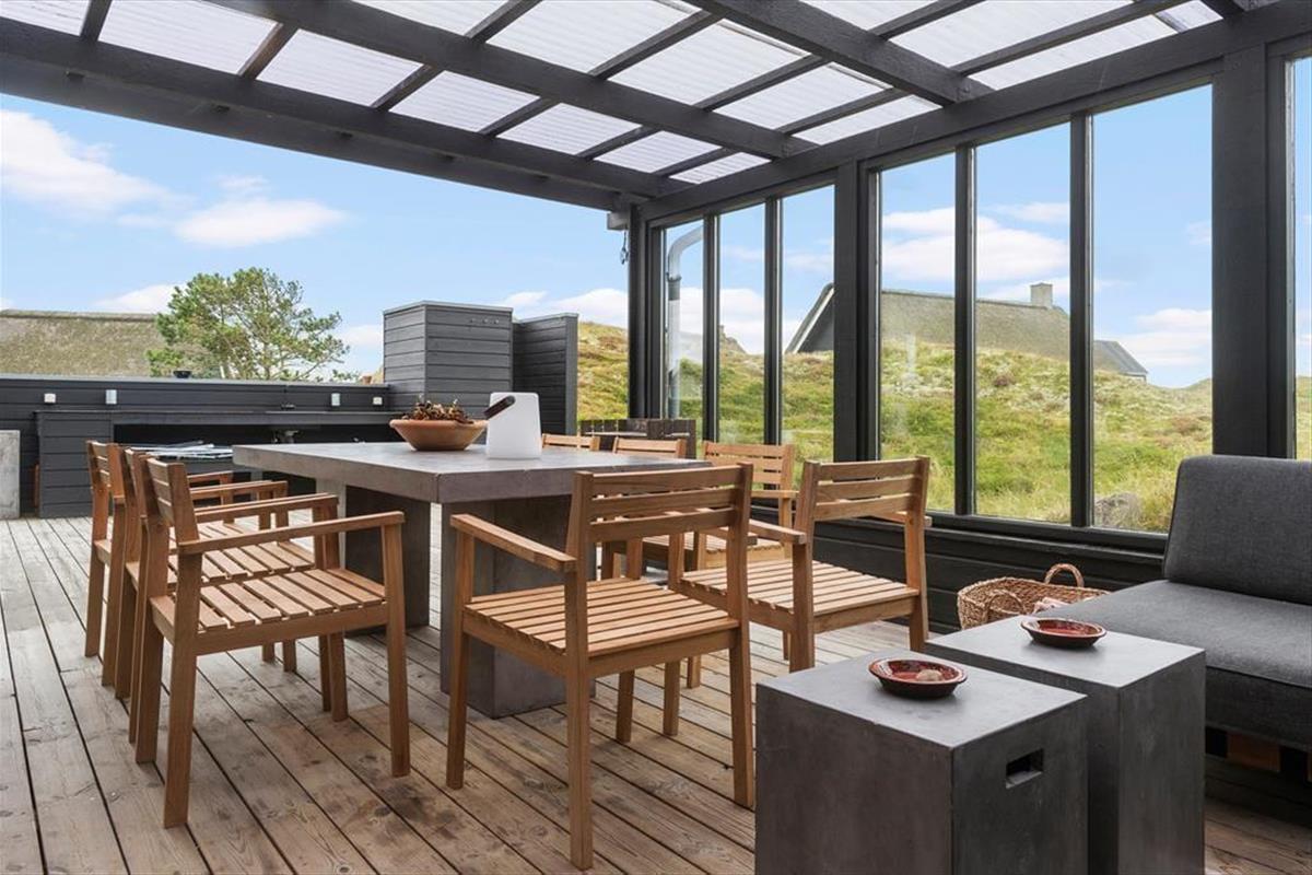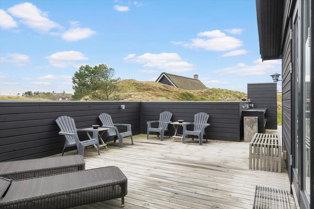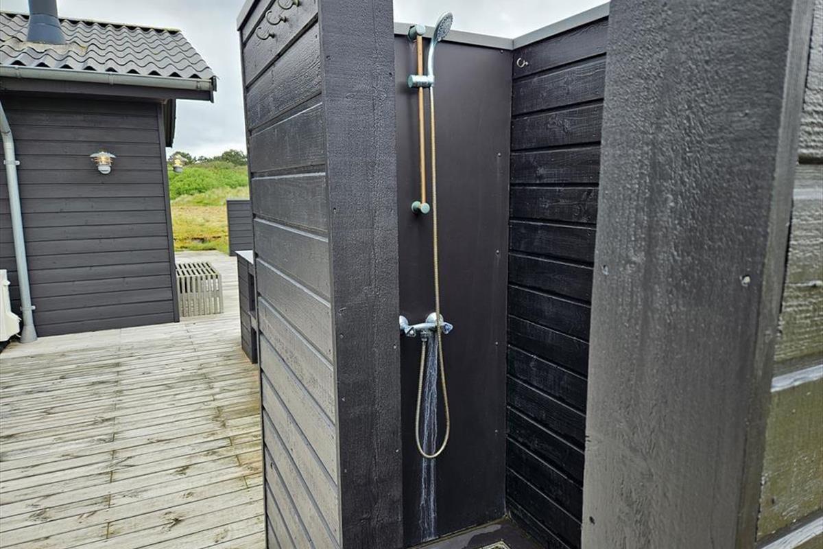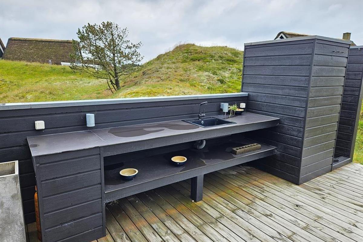 Die moderne Terrassenlandschaft des Ferienhauses erstreckt sich über 120 m² und bietet dir zahlreiche Möglichkeiten, das Sommerleben bei fast jedem Wetter zu genießen. Viele Sonnenplätze und gut geschützte Aufenthaltsbereiche stehen zur Auswahl, und wenn ein kleiner Regenschauer vorbeizieht, ist es herrlich, auf der überdachten Terrasse mit Loungemöbeln und Gartentisch zu sitzen. Der Blick auf die Dünen ist beeindruckend – sowohl nach einer Dusche im Freien als auch beim Kochen mit lokalen Zutaten in der schicken Außenküche.