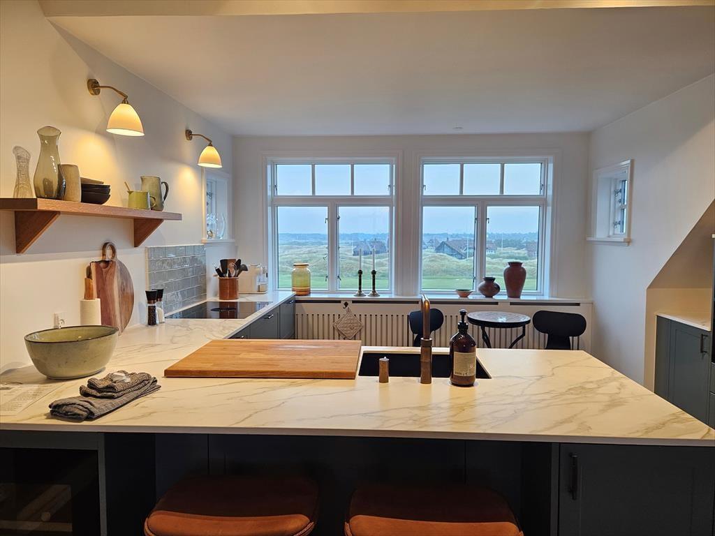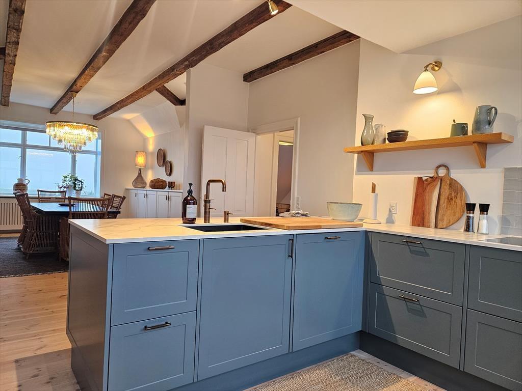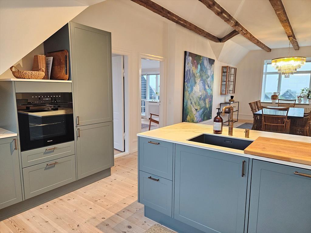 Die Einrichtung ist hell, stilvoll und durchdacht, sodass alles in der Wohnung zum Wohlbefinden einlädt. Große Glasflächen und eine offene Decke mit freiliegenden Balken sorgen für ein luftiges Gefühl und lassen dich die Aussicht genießen – ganz gleich, ob du am Esstisch sitzt oder es dir auf dem bequemen Sofa gemütlich machst. Die Küche ist mit allem ausgestattet – vom Quooker über den Weinkühlschrank bis hin zur Nespresso-Maschine – und macht es leicht, sowohl ein entspanntes Frühstück als auch ein Gourmetdinner zuzubereiten. Die Schlafzimmer sind mit luxuriösen Hästens-Betten eingerichtet, die für den bestmöglichen Schlaf sorgen, und die Einrichtung ist in gedämpften Tönen gehalten, die die ruhige Atmosphäre unterstützen.