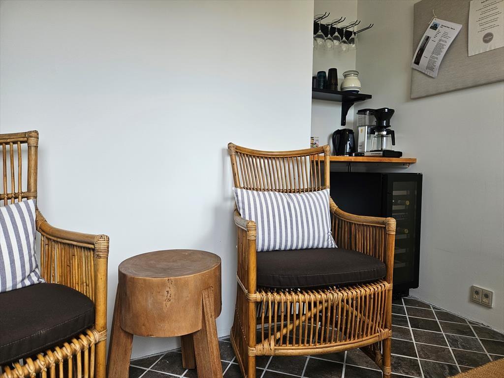 DIE AUSSICHT verfügt über einen eigenen, nach Westen ausgerichteten Balkon, auf dem du den Tagesverlauf von morgens bis abends verfolgen kannst – perfekt sowohl für eine ruhige Tasse Kaffee als auch für ein Glas Wein beim Sonnenuntergang. Von hier aus sind es nur wenige Gehminuten bis zum Strand, und auch der Zugang zu den gemeinschaftlichen Einrichtungen des Hauses ist einfach. Wenn du dir etwas Gutes tun möchtest, kannst du das Saunahaus besuchen oder dich in den Weinkeller zurückziehen, wo die Ruhe ebenso einladend ist wie der Geschmack. Falls du Golfzubehör, Fahrräder oder andere Sportgeräte mitbringst, steht dir ein abschließbarer Abstellraum zur Verfügung, sodass alles sicher und griffbereit ist.