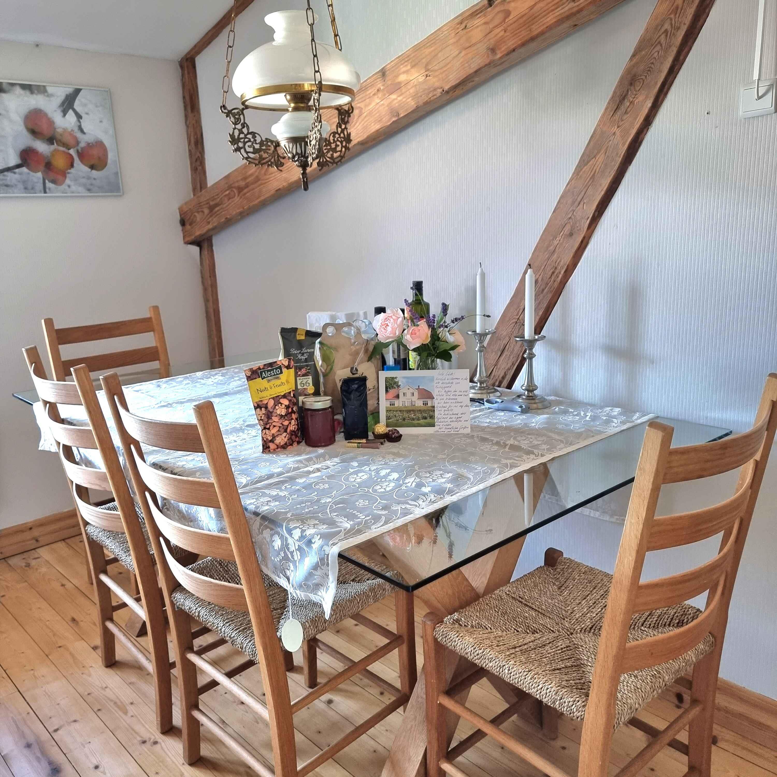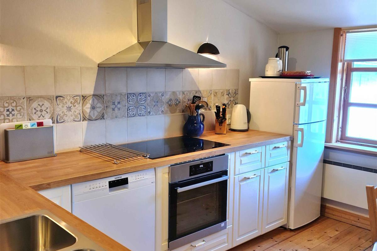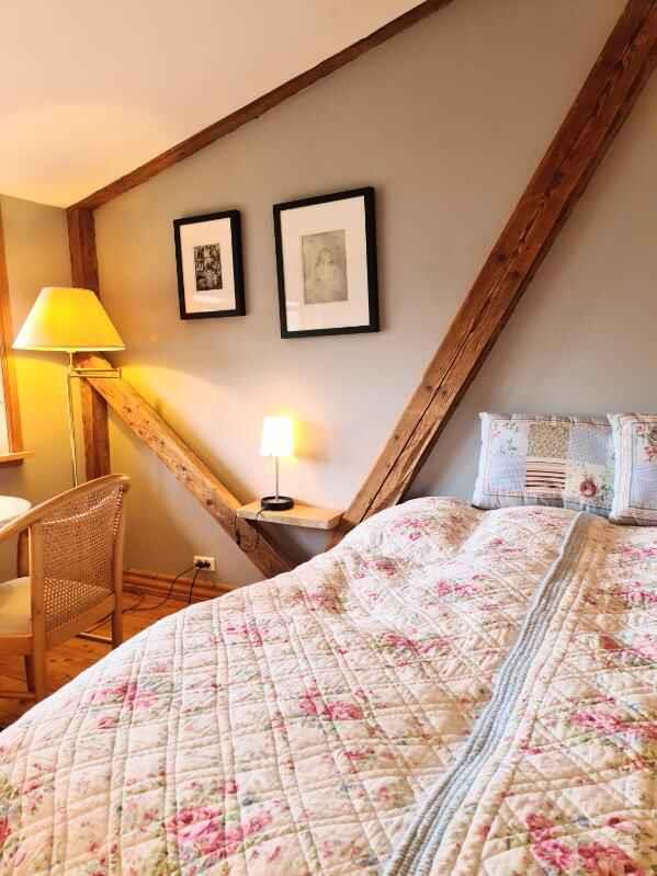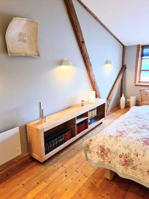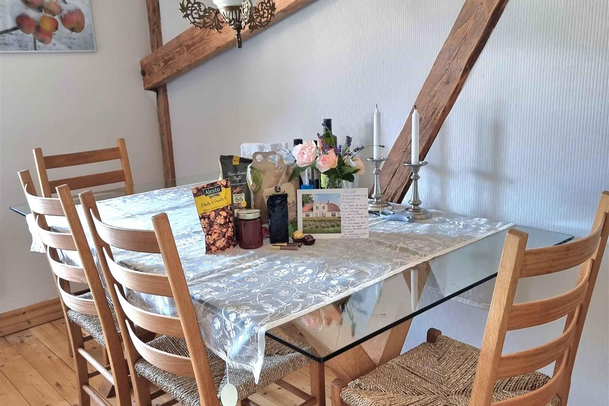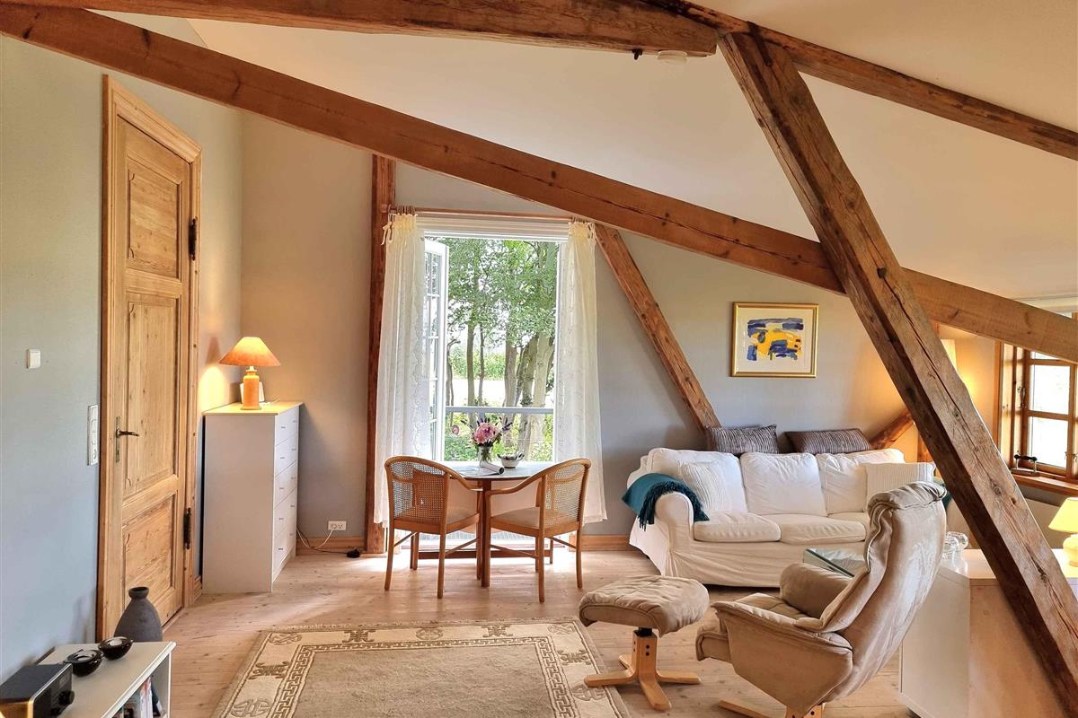 Welkom bij “Kornloftet”, een prachtige woning van 100 m² verdeeld over twee verdiepingen, gebouwd in de oude schuur van Frishøjgaard. Kornloftet ligt op slechts 400 meter van de zee en is met zorg en respect voor de oorspronkelijke sfeer ingericht. Dit maakt het tot een heel bijzondere vakantiewoning. Het is de ideale plek voor een volwassen publiek dat op zoek is naar rust, kwaliteitstijd in een mooie omgeving en prachtige natuur met fijne wandel- en fietstochten. Kinderen vanaf 12 jaar zijn welkom. Hier heerst stilte en er is geen straatverlichting die de nachtelijke hemel verstoort. De woning beschikt over een eigen, afgeschermde tuin en twee terrassen met diverse tuinmeubelen. De woning: Het doel van deze unieke woning in de meer dan 100 jaar oude schuur was het creëren van een toevluchtsoord voor volwassenen – een oase van rust weg van de eisen van het hectische dagelijks leven. De woning bevat vele originele details zoals oude houten vloeren, zichtbare dakspanten, oude gevelramen, echte tapijten en originele kunst aan de muren. De woning is volledig gerenoveerd met hoogwaardige materialen en met veel zorg om de charme en ziel van de plek te behouden. Vanuit de hal op zowel de begane grond als de eerste verdieping is er via grote ramen met roedeverdeling zicht op de oude schuur waar de machines en het ruwvoer van de boerderij worden opgeslagen. Een handgemaakte trap in landelijke stijl leidt naar de gezellige, lichte kamers en de nieuwe, functionele keuken met eethoek. Eén van de kamers beschikt over twee comfortabele zithoeken, een tv met Chromecast en internetradio, evenals een slaapgedeelte met een tweepersoonsbed. Via de balkondeur heeft u uitzicht op zee door een laan met zeer oude bomen en kunt u gezellig zitten bij het Franse balkon, bijna tussen de boomtoppen “samen met de vogels” – de perfecte plek om van een maaltijd of een glas wijn te genieten. De andere kamer kijkt uit over het binnenplein met vakwerkstallen, de mooi aangelegde rijbaan en een kleine boomgaard. Hier kan het tweepersoonsbed indien gewenst worden gesplitst in twee eenpersoonsbedden. De mooie badkamer in Franse landstijl op de begane grond is ruim en voorzien van vloerverwarming. De bijbehorende tuin is volledig privé en beschikt over tuinmeubelen en een barbecue. Naast de tuin zijn er twee terrassen: een op het zuiden met beschutting, tuinmeubelen en uitzicht op het water, en een op het westen met bank en kleine tafels waar u kunt genieten van de middag- en avondzon. Er is gratis privéparkeergelegenheid voor twee auto’s. De woning is gevestigd in een meer dan 100 jaar oud bestaand gebouw. Logistiek gezien is het helaas niet mogelijk geweest de woning geschikt te maken voor kleine kinderen en baby’s, en daarom kunnen wij geen gezinnen met jonge kinderen ontvangen. Gezinnen met kinderen vanaf 12 jaar zijn uiteraard welkom. Toegang voor gasten: Onze gasten hebben de gehele vakantiewoning, inclusief tuin, terrassen en parkeergelegenheid, volledig voor zichzelf. De woning beschikt niet over een laadpunt voor elektrische auto’s, maar bij Fejø Kro, in het midden van het eiland, is wel een laadpunt aanwezig.