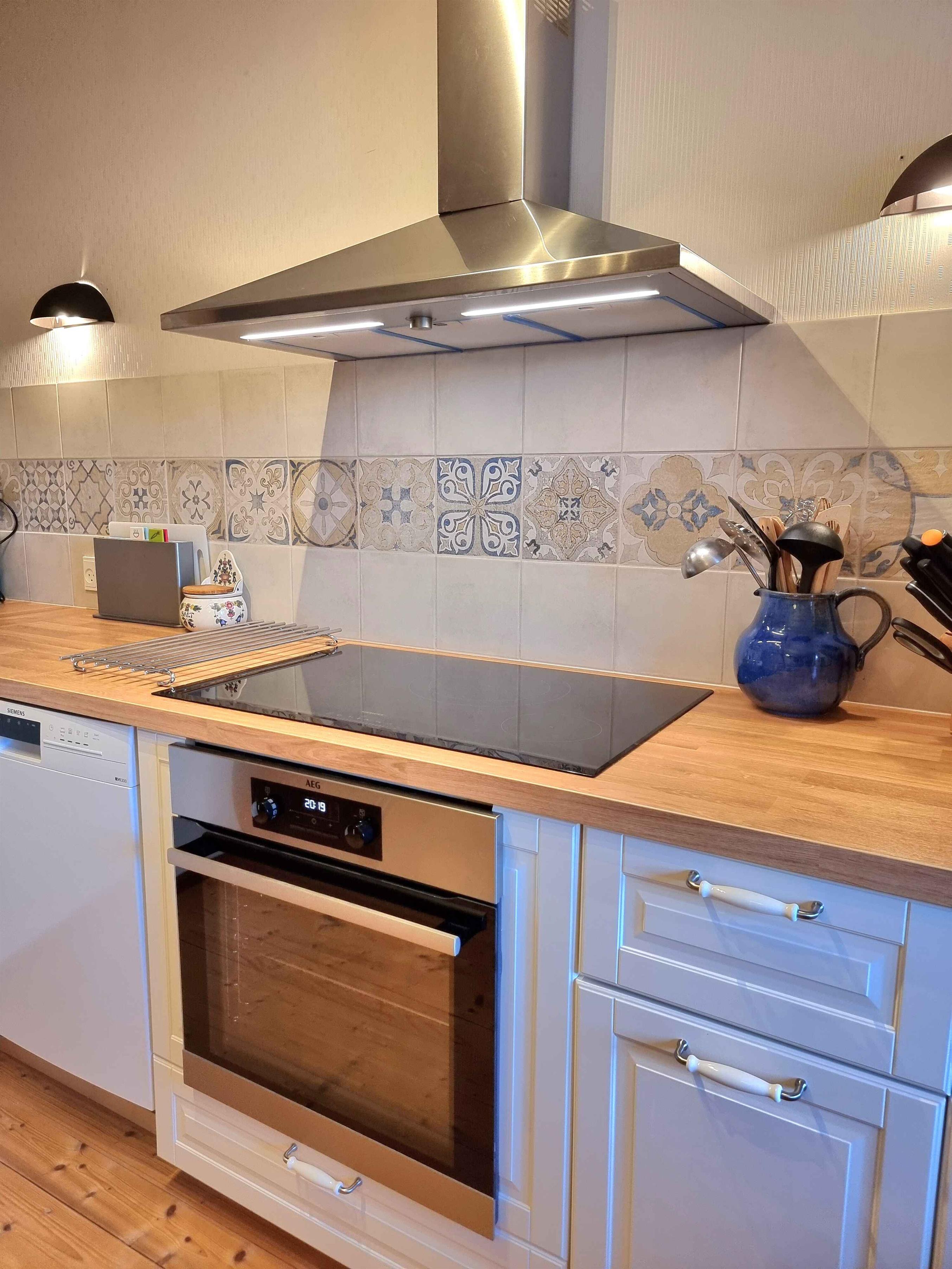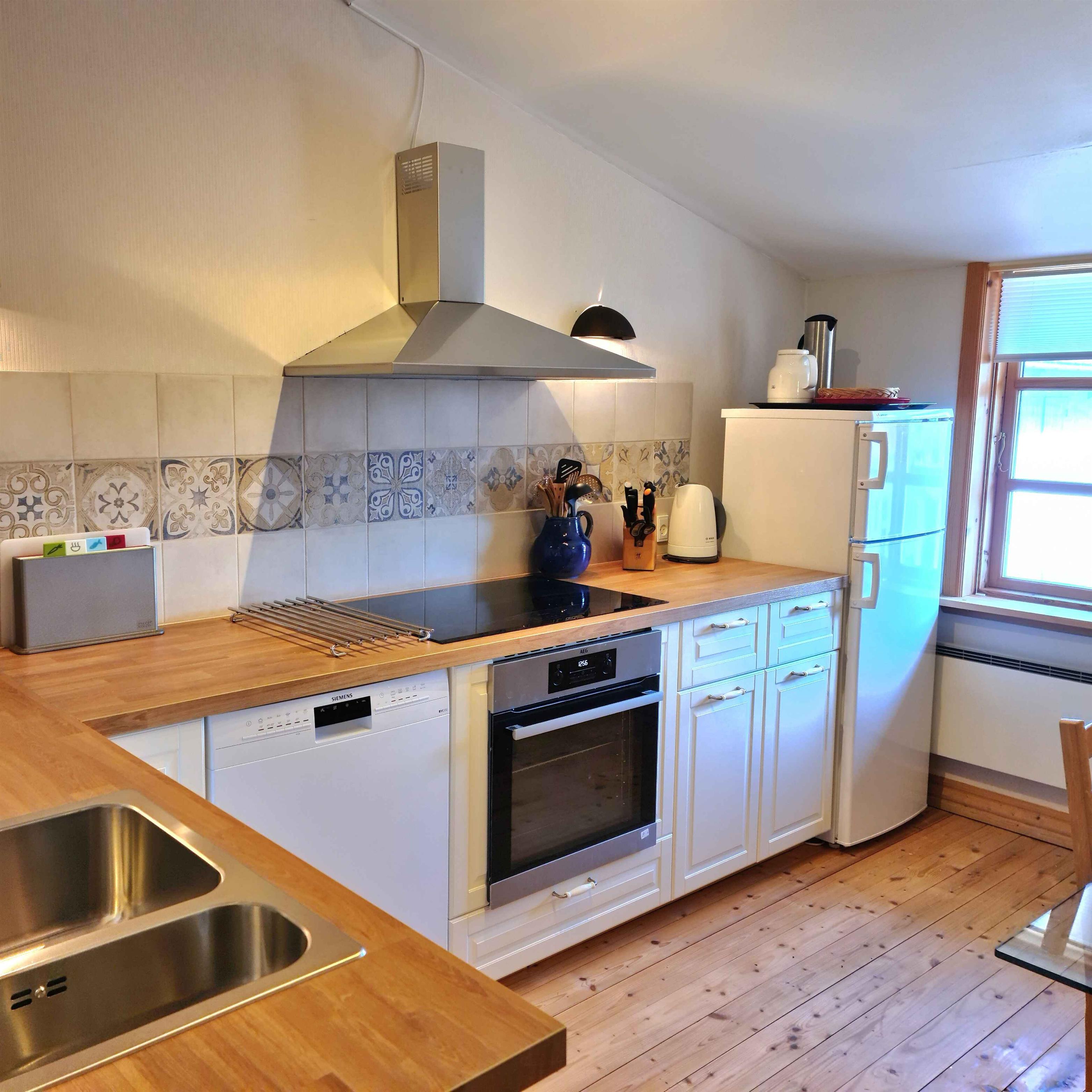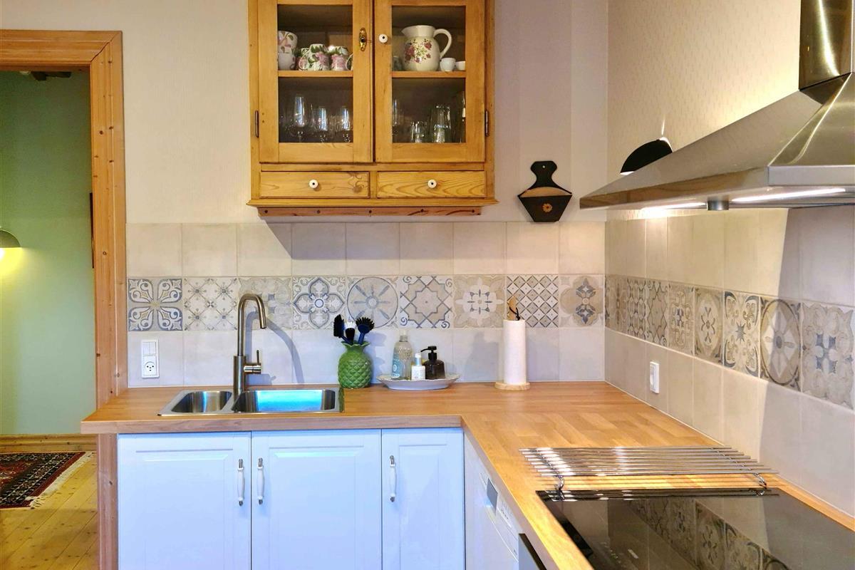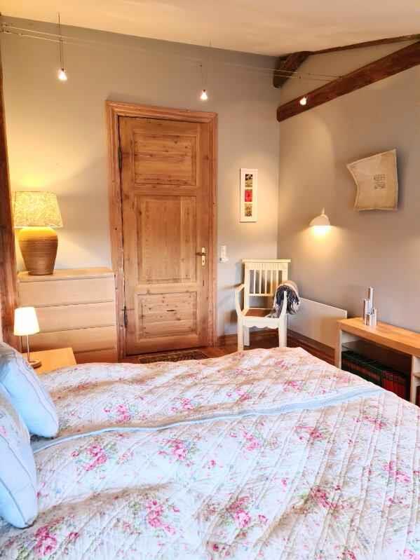 Welkom bij “Kornloftet”, een prachtige woning van 100 m² verdeeld over twee verdiepingen, gebouwd in de oude schuur van Frishøjgaard. Kornloftet ligt op slechts 400 meter van de zee en is met zorg en respect voor de oorspronkelijke sfeer ingericht. Dit maakt het tot een heel bijzondere vakantiewoning. Het is de ideale plek voor een volwassen publiek dat op zoek is naar rust, kwaliteitstijd in een mooie omgeving en prachtige natuur met fijne wandel- en fietstochten. Kinderen vanaf 12 jaar zijn welkom. Hier heerst stilte en er is geen straatverlichting die de nachtelijke hemel verstoort. De woning beschikt over een eigen, afgeschermde tuin en twee terrassen met diverse tuinmeubelen. De woning: Het doel van deze unieke woning in de meer dan 100 jaar oude schuur was het creëren van een toevluchtsoord voor volwassenen – een oase van rust weg van de eisen van het hectische dagelijks leven. De woning bevat vele originele details zoals oude houten vloeren, zichtbare dakspanten, oude gevelramen, echte tapijten en originele kunst aan de muren. De woning is volledig gerenoveerd met hoogwaardige materialen en met veel zorg om de charme en ziel van de plek te behouden. Vanuit de hal op zowel de begane grond als de eerste verdieping is er via grote ramen met roedeverdeling zicht op de oude schuur waar de machines en het ruwvoer van de boerderij worden opgeslagen. Een handgemaakte trap in landelijke stijl leidt naar de gezellige, lichte kamers en de nieuwe, functionele keuken met eethoek. Eén van de kamers beschikt over twee comfortabele zithoeken, een tv met Chromecast en internetradio, evenals een slaapgedeelte met een tweepersoonsbed. Via de balkondeur heeft u uitzicht op zee door een laan met zeer oude bomen en kunt u gezellig zitten bij het Franse balkon, bijna tussen de boomtoppen “samen met de vogels” – de perfecte plek om van een maaltijd of een glas wijn te genieten. De andere kamer kijkt uit over het binnenplein met vakwerkstallen, de mooi aangelegde rijbaan en een kleine boomgaard. Hier kan het tweepersoonsbed indien gewenst worden gesplitst in twee eenpersoonsbedden. De mooie badkamer in Franse landstijl op de begane grond is ruim en voorzien van vloerverwarming. De bijbehorende tuin is volledig privé en beschikt over tuinmeubelen en een barbecue. Naast de tuin zijn er twee terrassen: een op het zuiden met beschutting, tuinmeubelen en uitzicht op het water, en een op het westen met bank en kleine tafels waar u kunt genieten van de middag- en avondzon. Er is gratis privéparkeergelegenheid voor twee auto’s. De woning is gevestigd in een meer dan 100 jaar oud bestaand gebouw. Logistiek gezien is het helaas niet mogelijk geweest de woning geschikt te maken voor kleine kinderen en baby’s, en daarom kunnen wij geen gezinnen met jonge kinderen ontvangen. Gezinnen met kinderen vanaf 12 jaar zijn uiteraard welkom. Toegang voor gasten: Onze gasten hebben de gehele vakantiewoning, inclusief tuin, terrassen en parkeergelegenheid, volledig voor zichzelf. De woning beschikt niet over een laadpunt voor elektrische auto’s, maar bij Fejø Kro, in het midden van het eiland, is wel een laadpunt aanwezig.