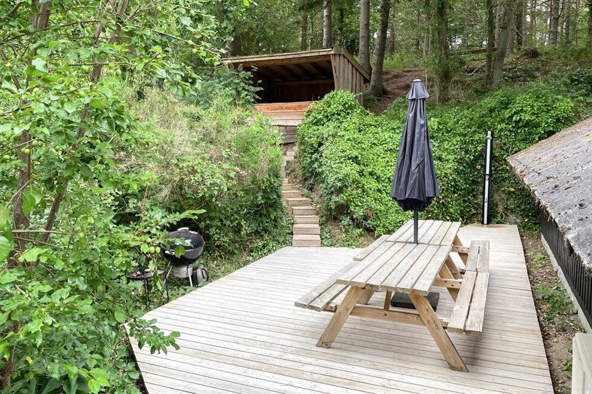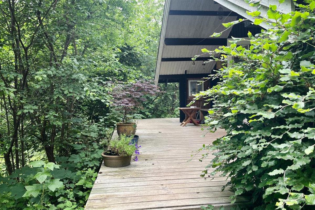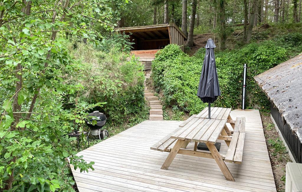 Gezellig houten vakantiehuis in Nationaal Park Mols Bjerge, met houtkachel, terras en buitendouche voor een ontspannen verblijf.