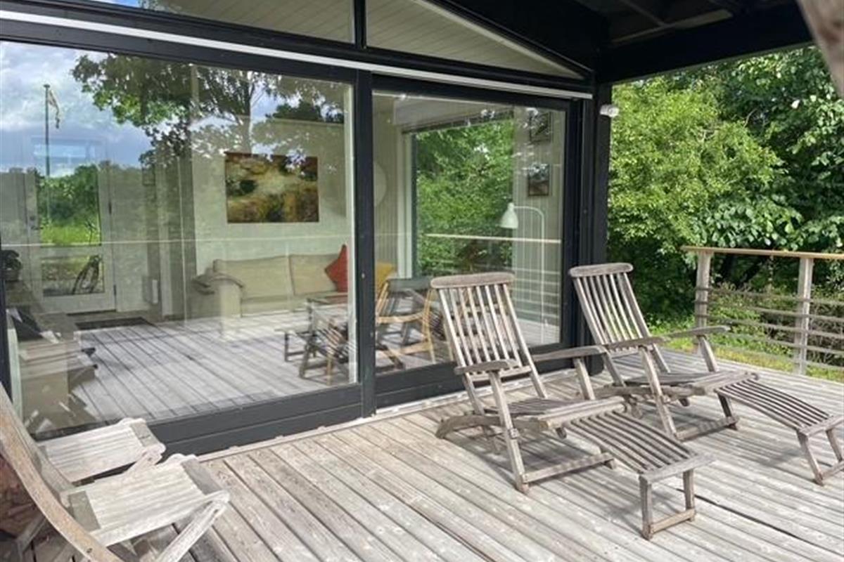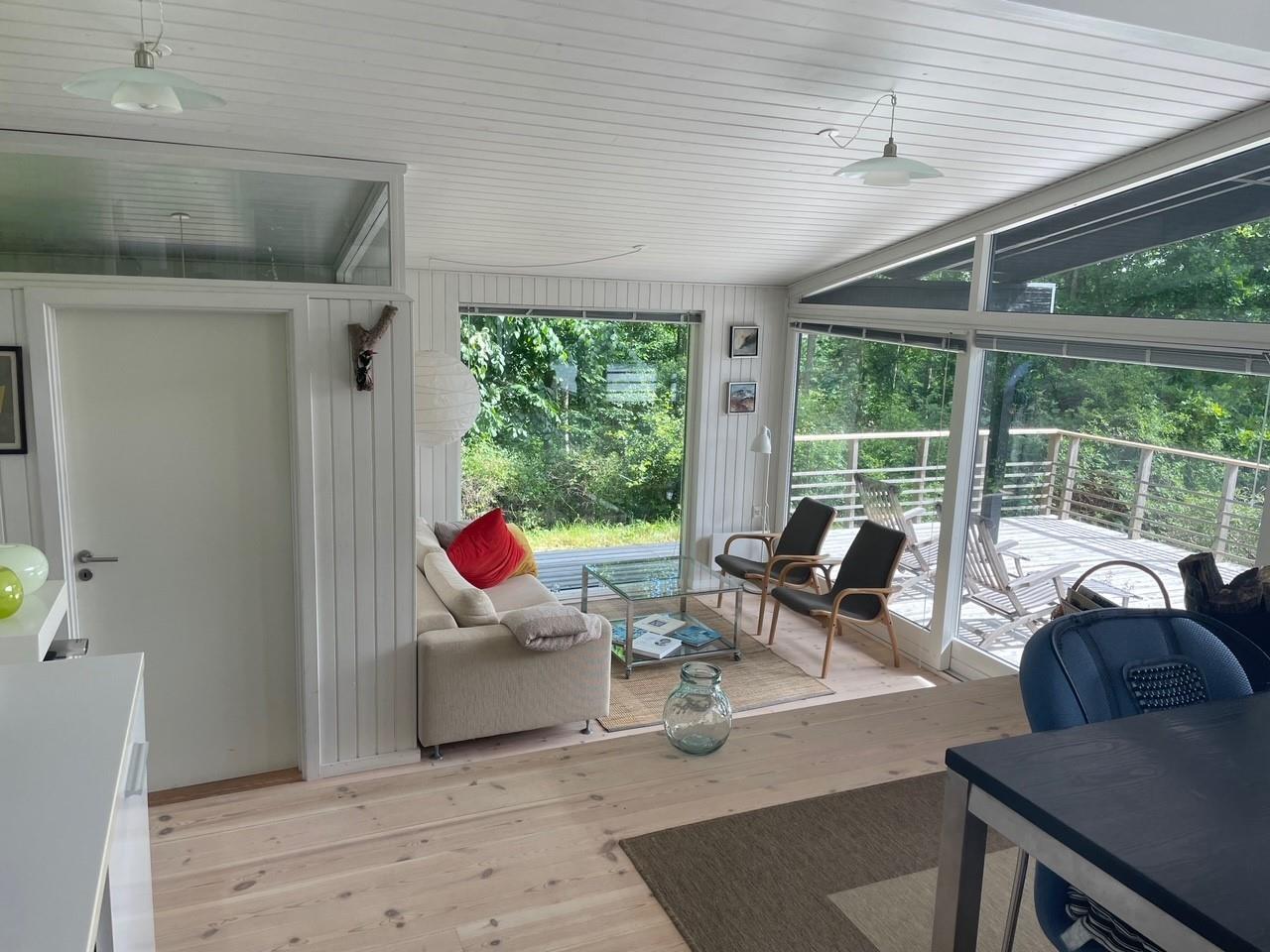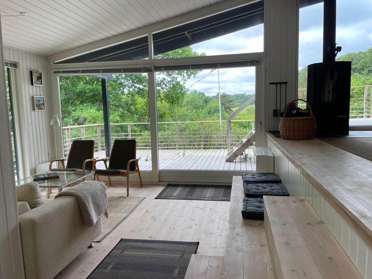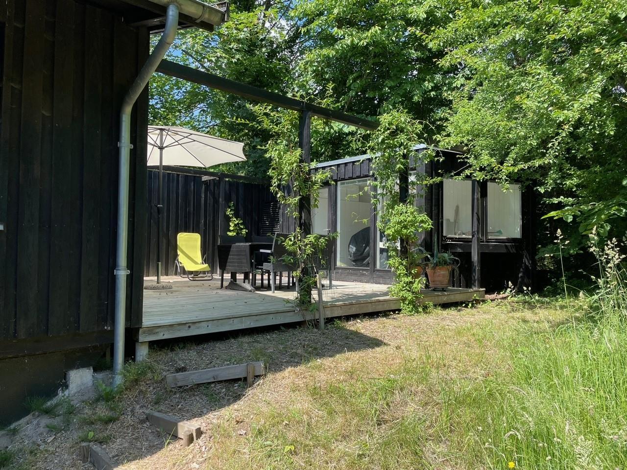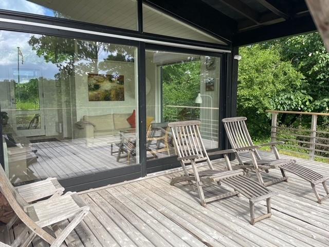 Located on a high, nature-based plot with a magnificent view over the beautiful forest and natural area near Femmøller, this older, continuously renovated holiday home offers a peaceful retreat. The lovely wooden terrace, arranged in split levels and partially covered, features garden furniture, loungers, an umbrella, and a barbecue.