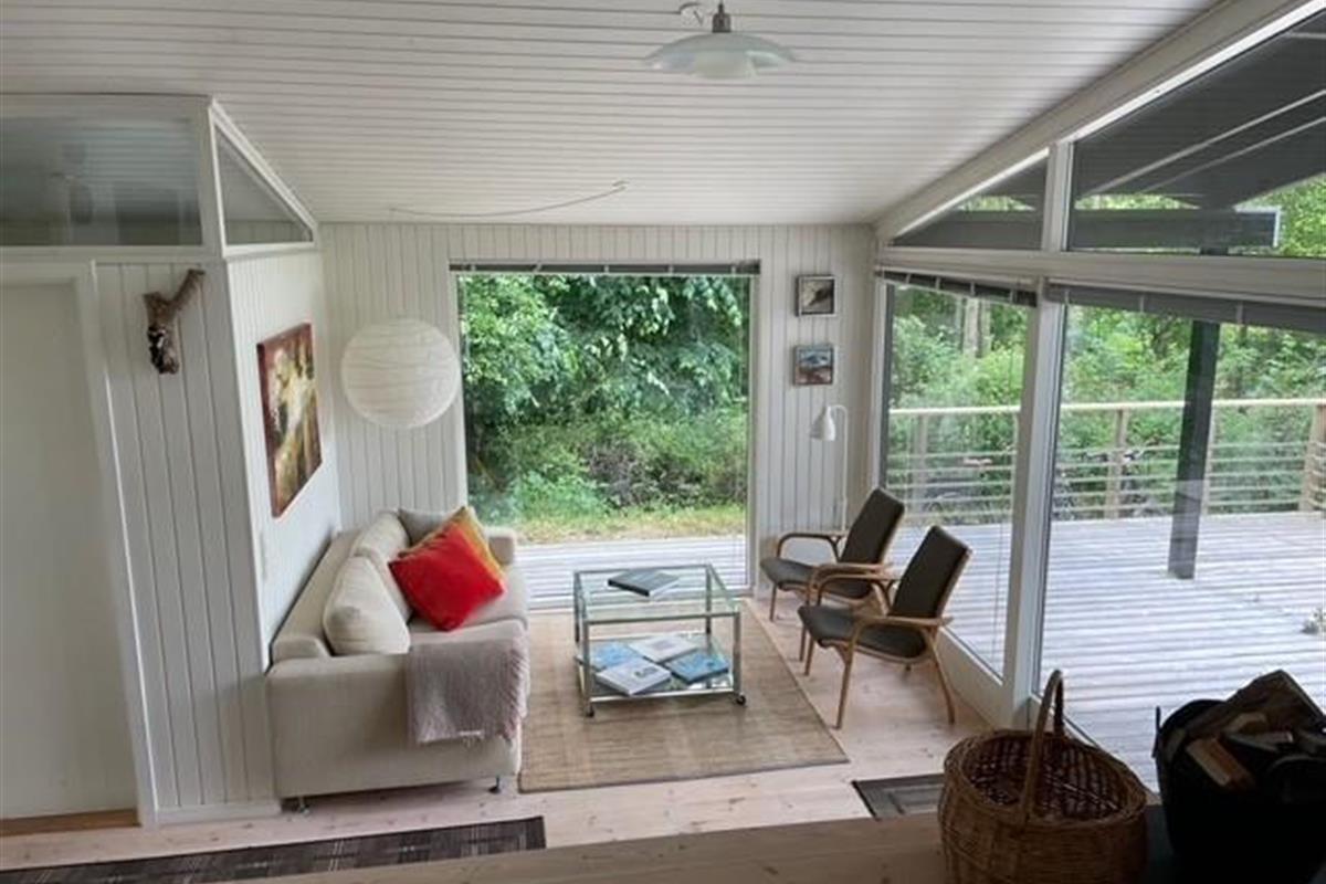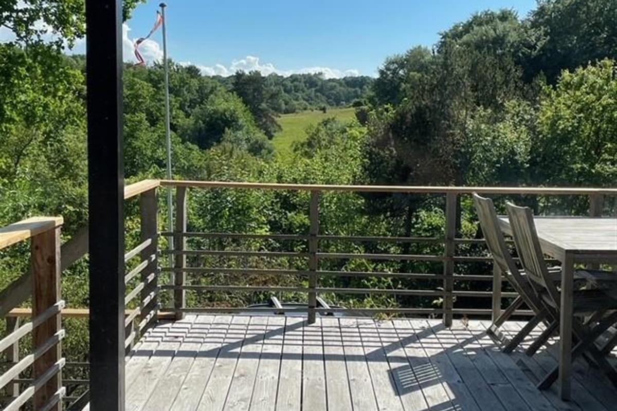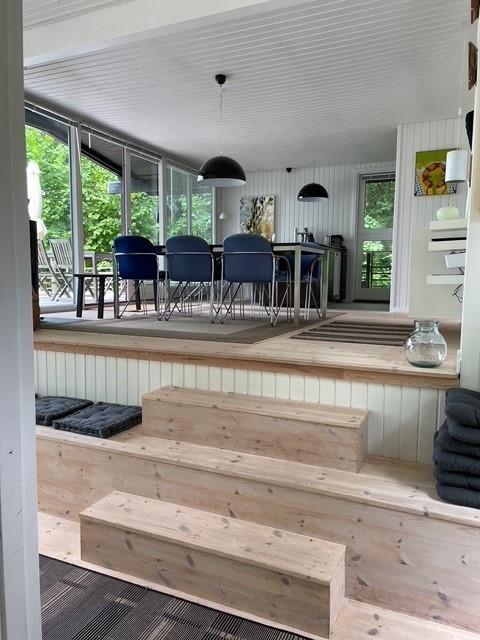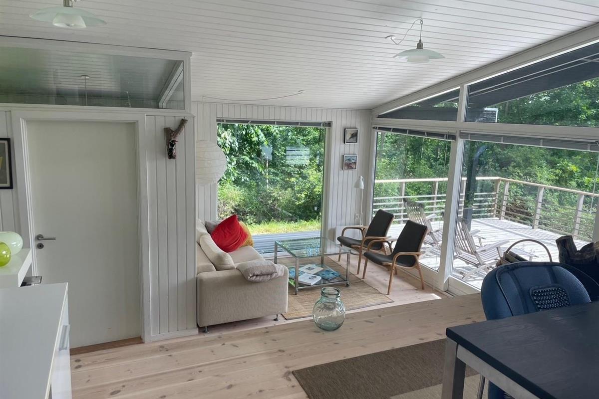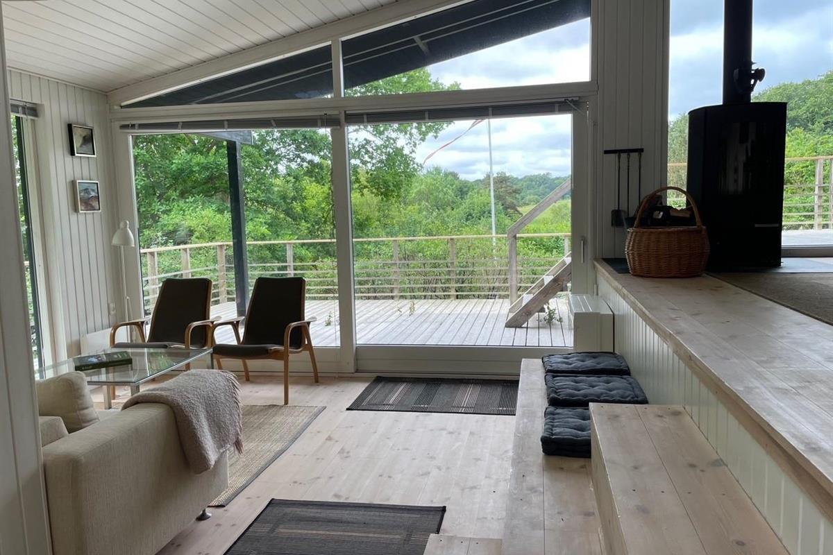 Located on a high, nature-based plot with a magnificent view over the beautiful forest and natural area near Femmøller, this older, continuously renovated holiday home offers a peaceful retreat. The lovely wooden terrace, arranged in split levels and partially covered, features garden furniture, loungers, an umbrella, and a barbecue.