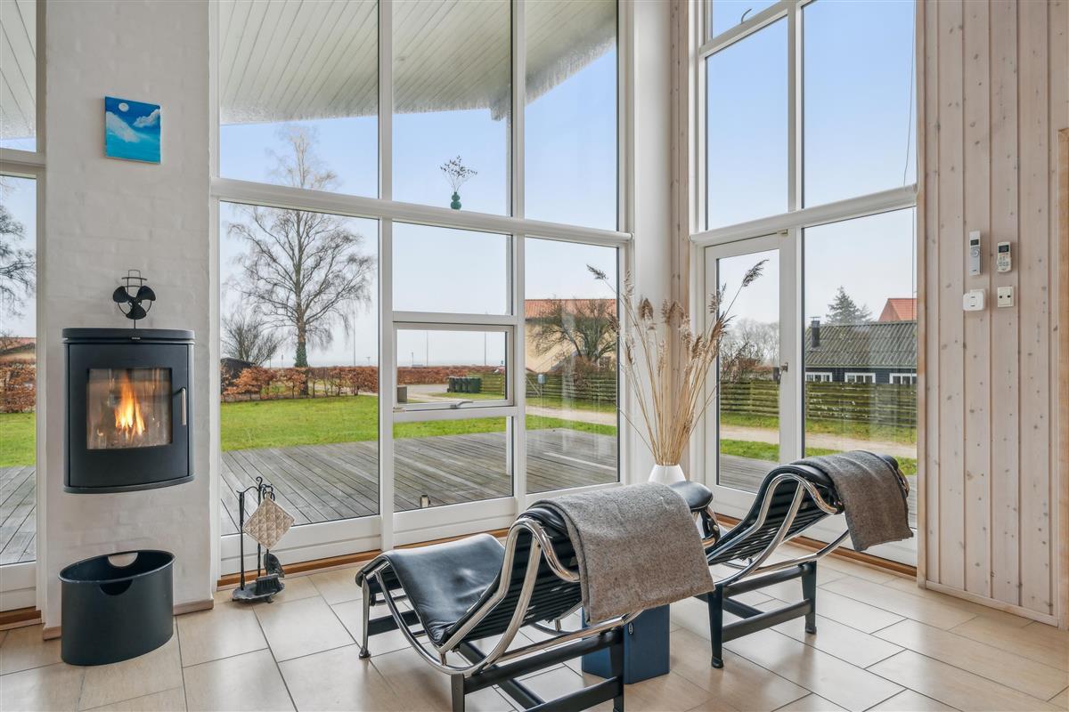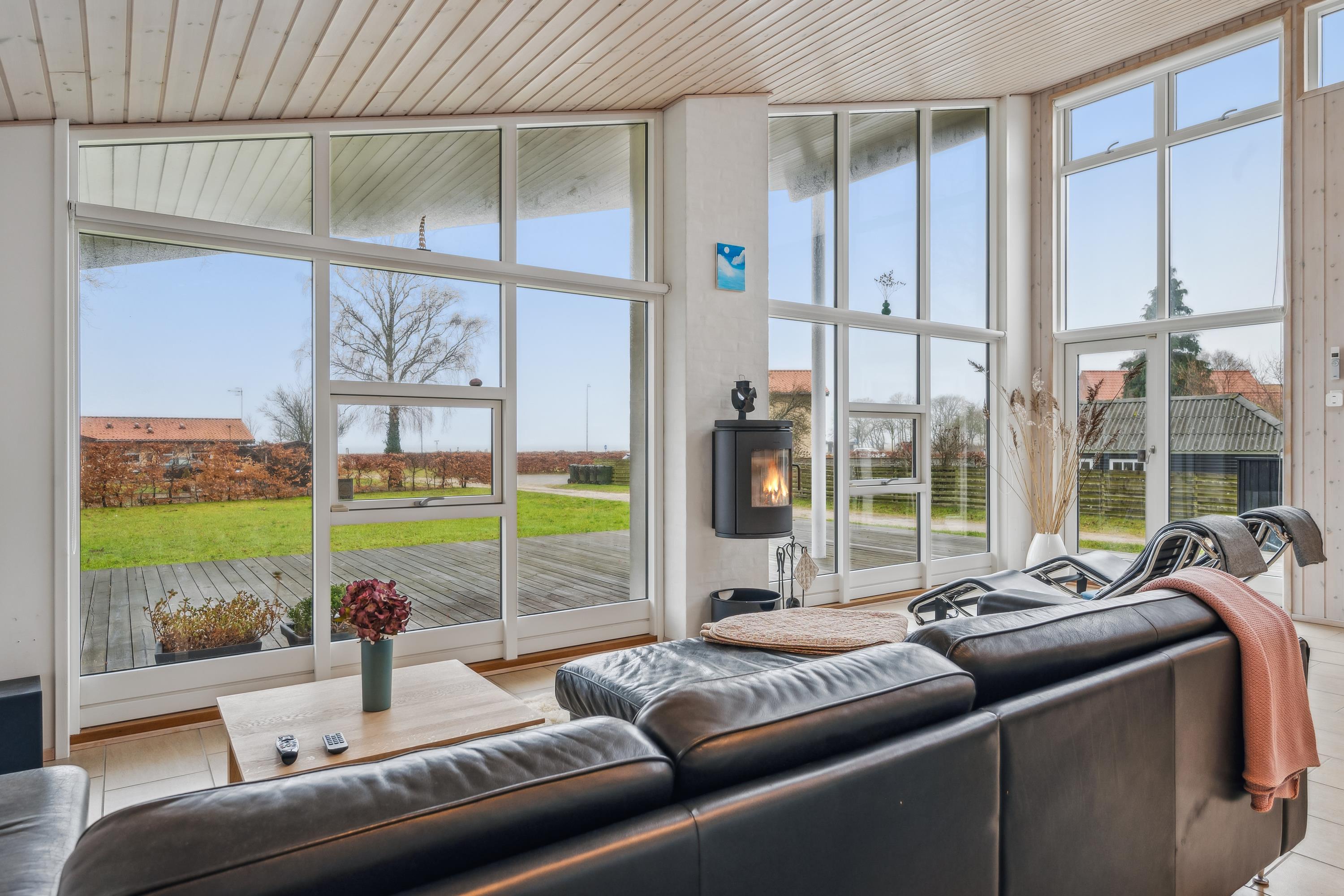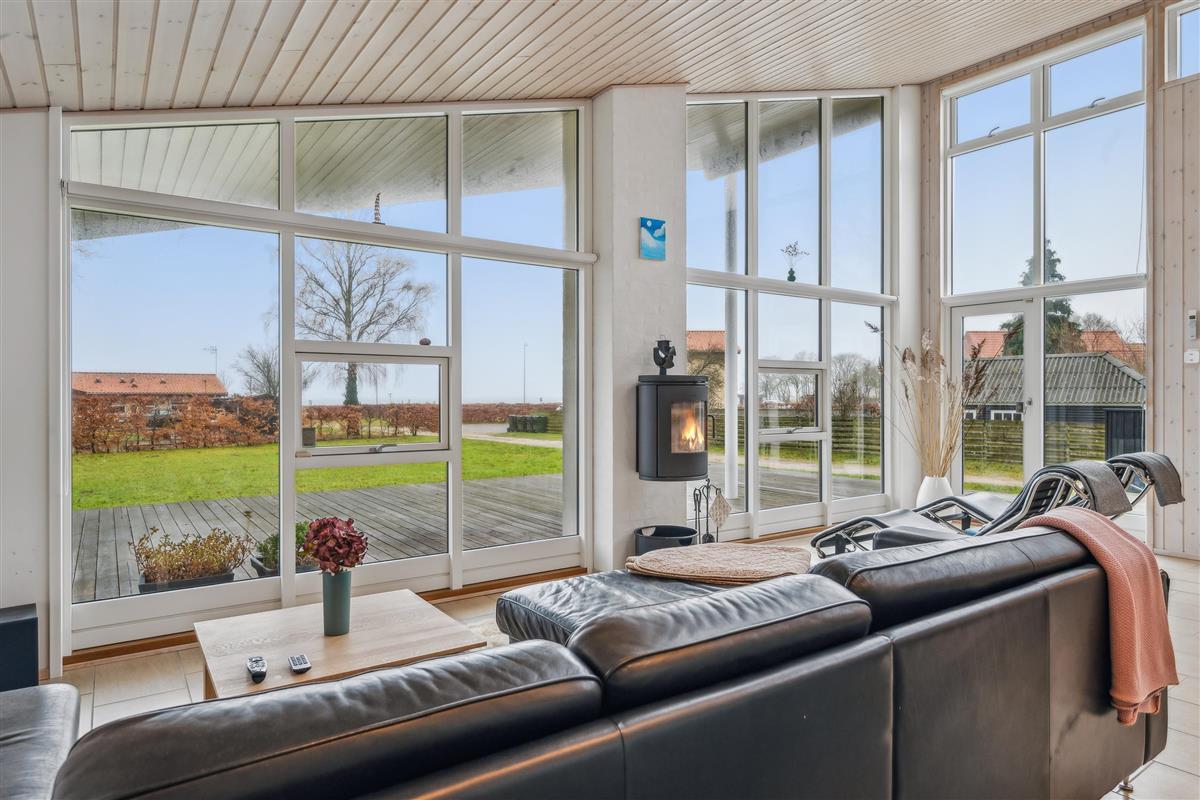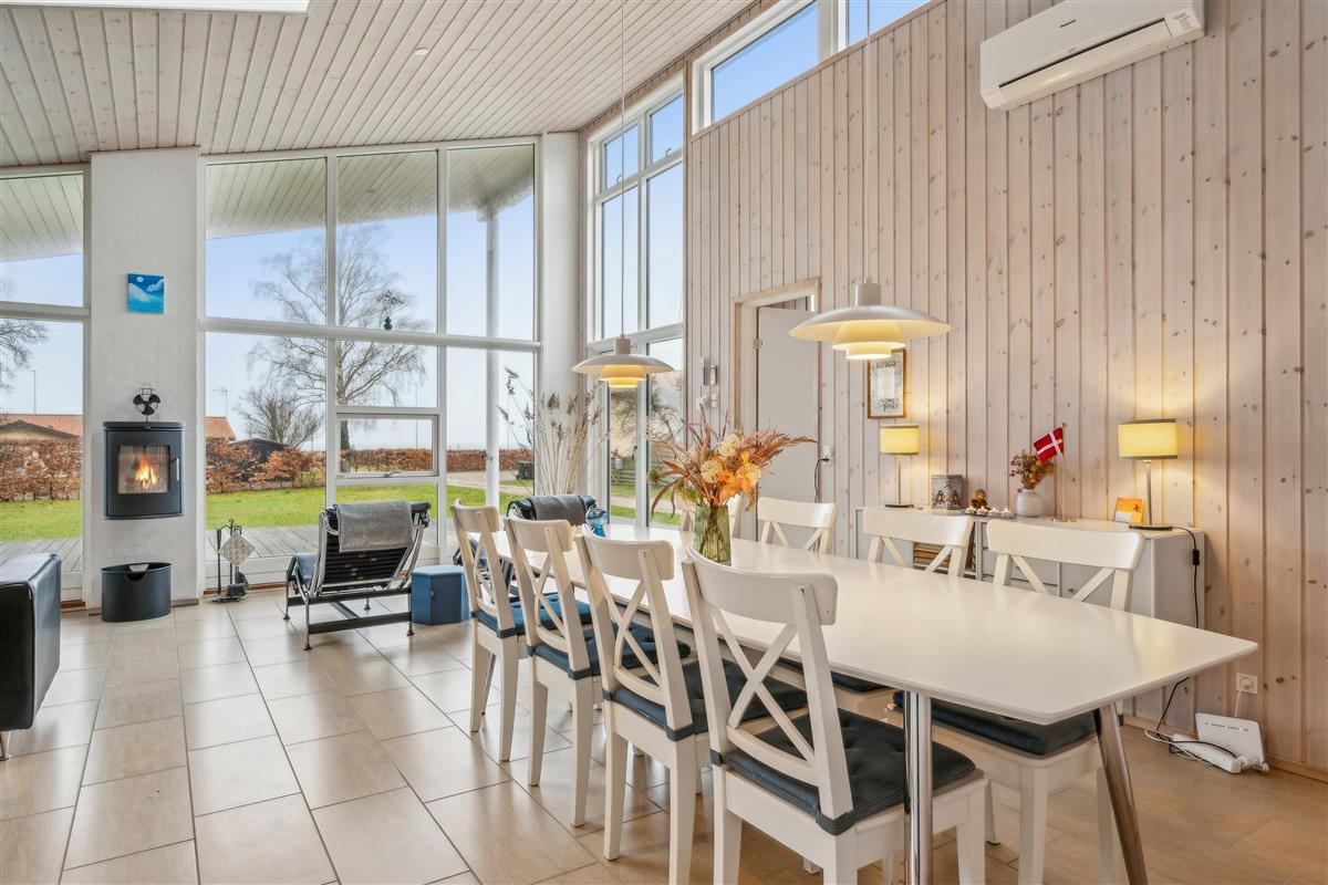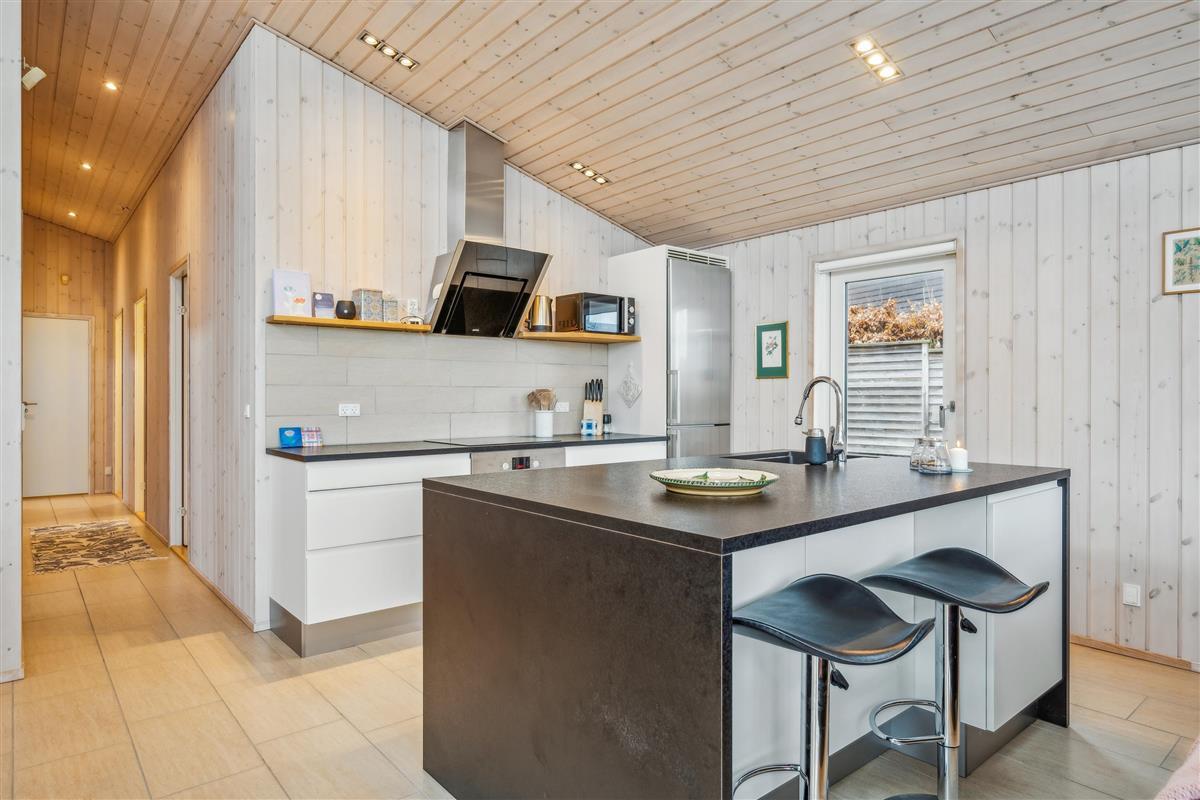 At Femmøller Beach, you will find this beautiful and well-maintained holiday home, located in the scenic Egil Fischer area. The house features a stylish and inviting living room, furnished with quality furniture, a wood-burning stove, and a heat pump, as well as access to a lovely terrace with a view of the water. The modern kitchen includes a kitchen island, providing the perfect spot to gather around while preparing meals and enjoying a good glass of wine.