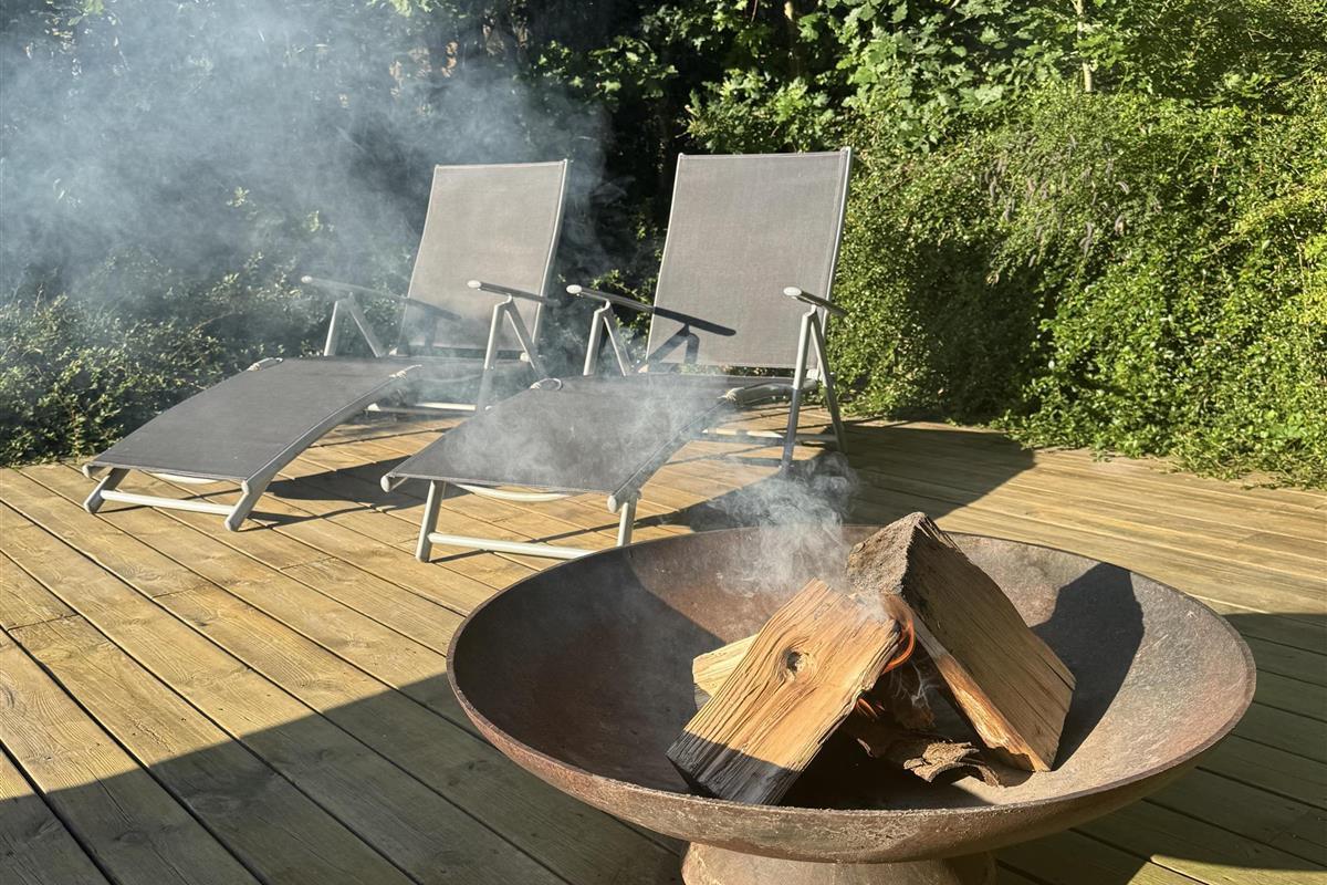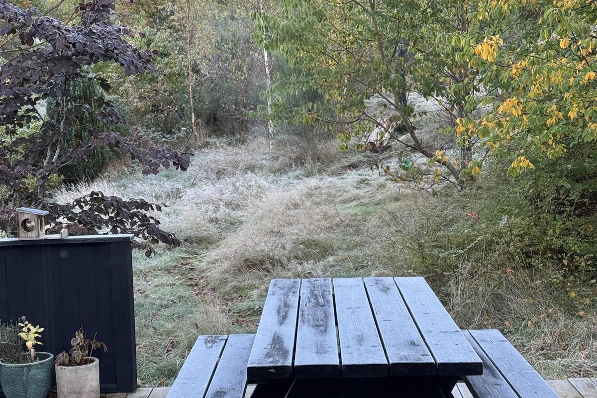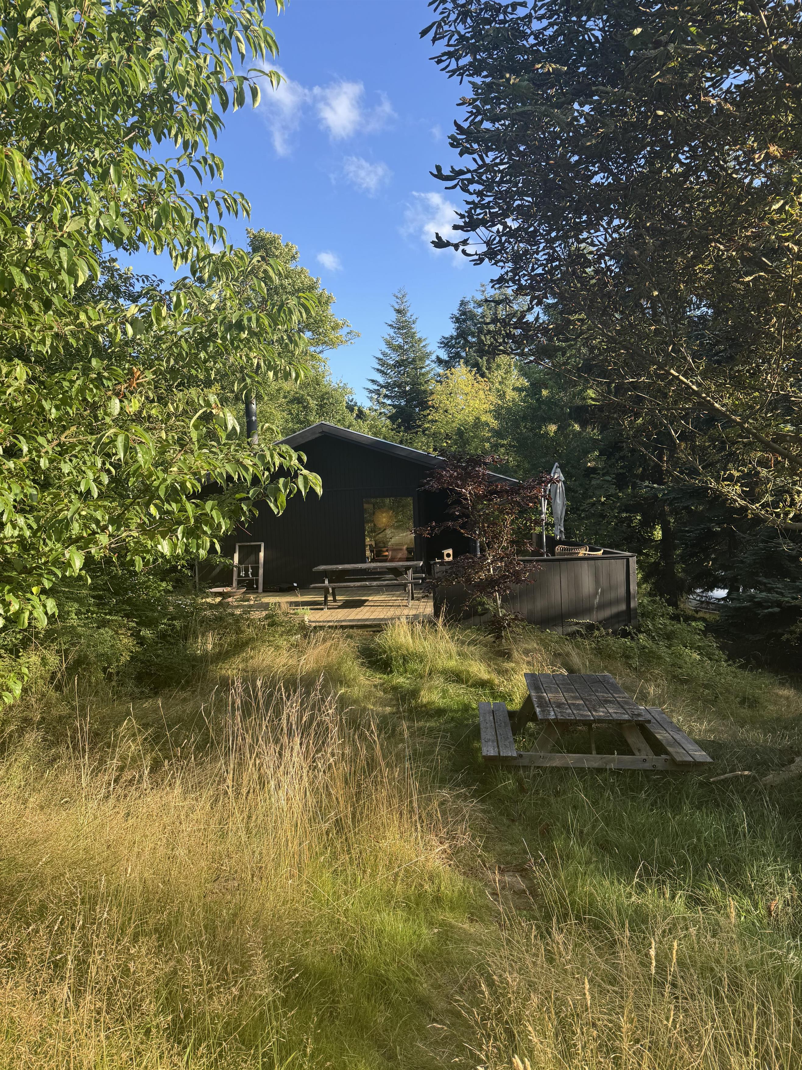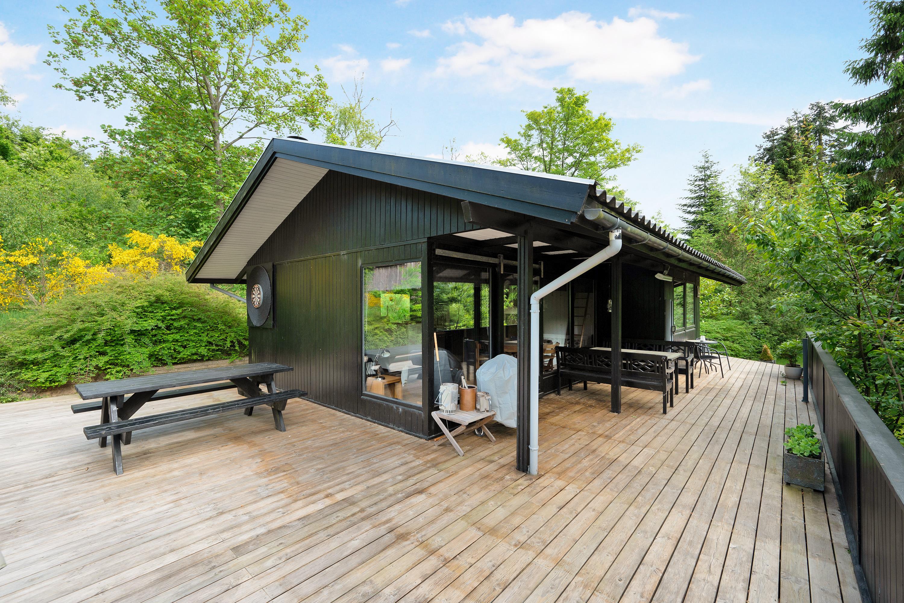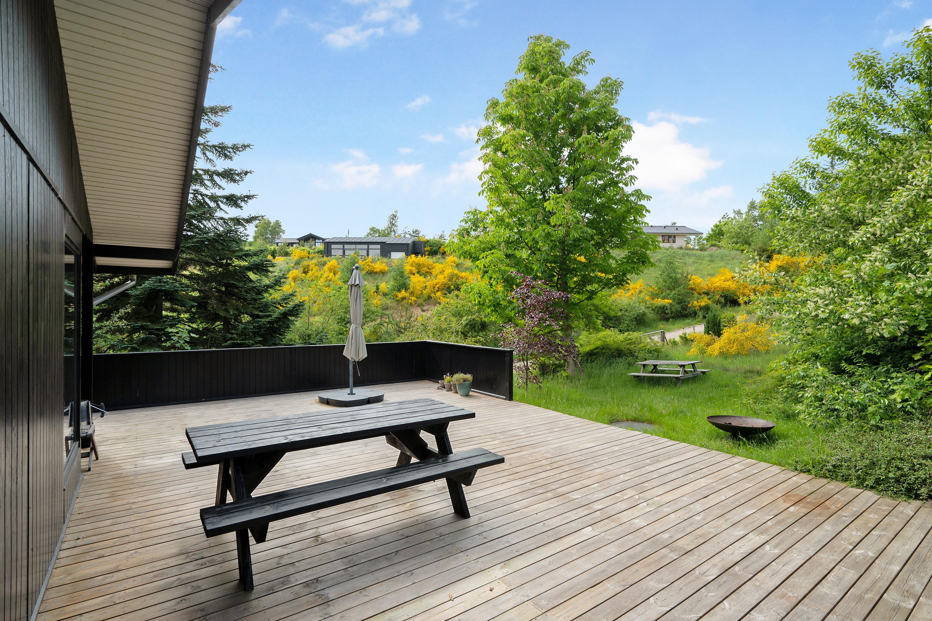 Located on a large nature plot in the beautiful, forested landscape near Femmøller, this older, newly renovated, and truly charming house is surrounded by a large, partially covered wooden terrace with garden furniture, an umbrella, and a barbecue. There are play equipment for children on the property. It’s a true natural oasis, where you can both relax and enjoy outdoor activities.