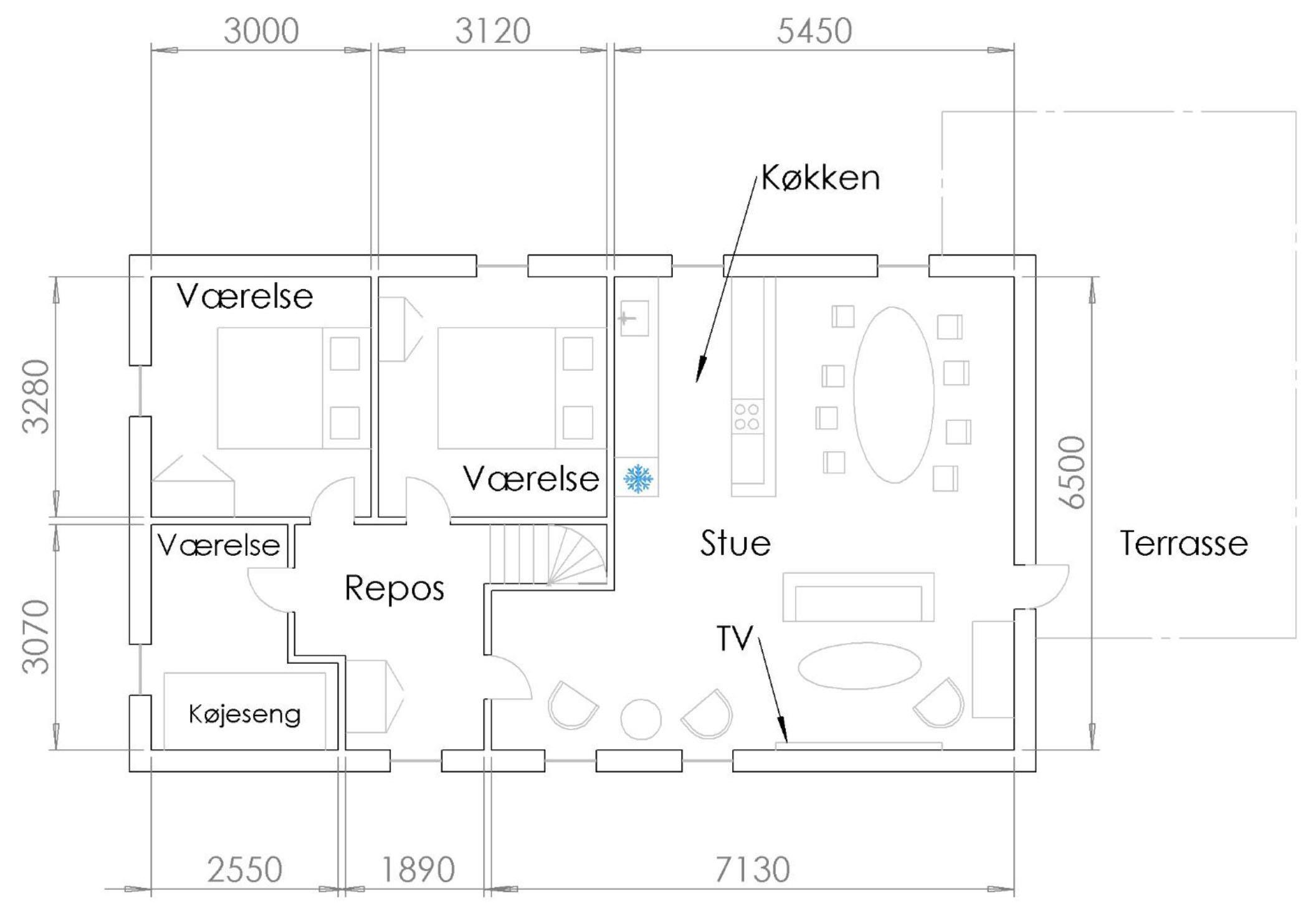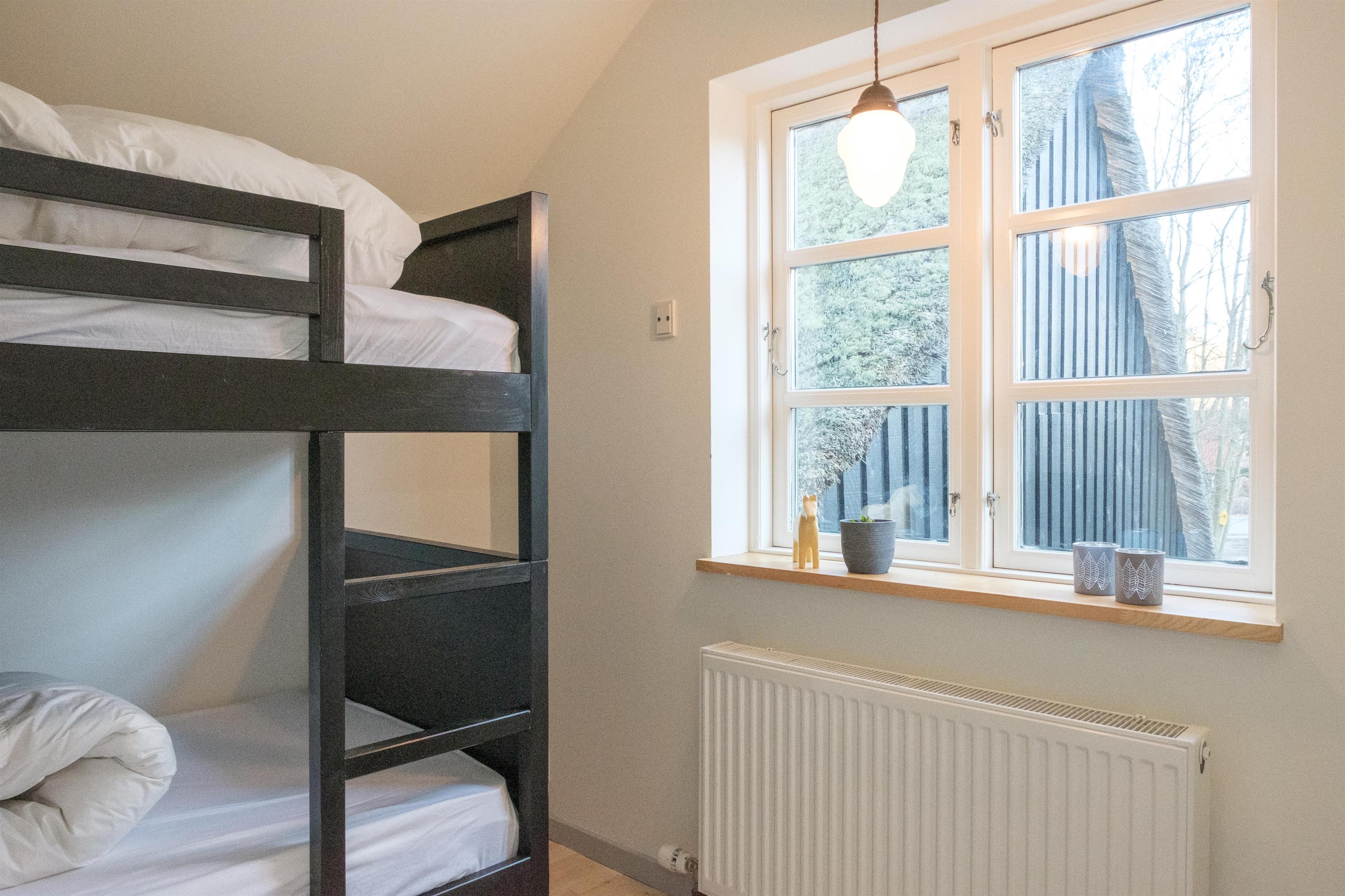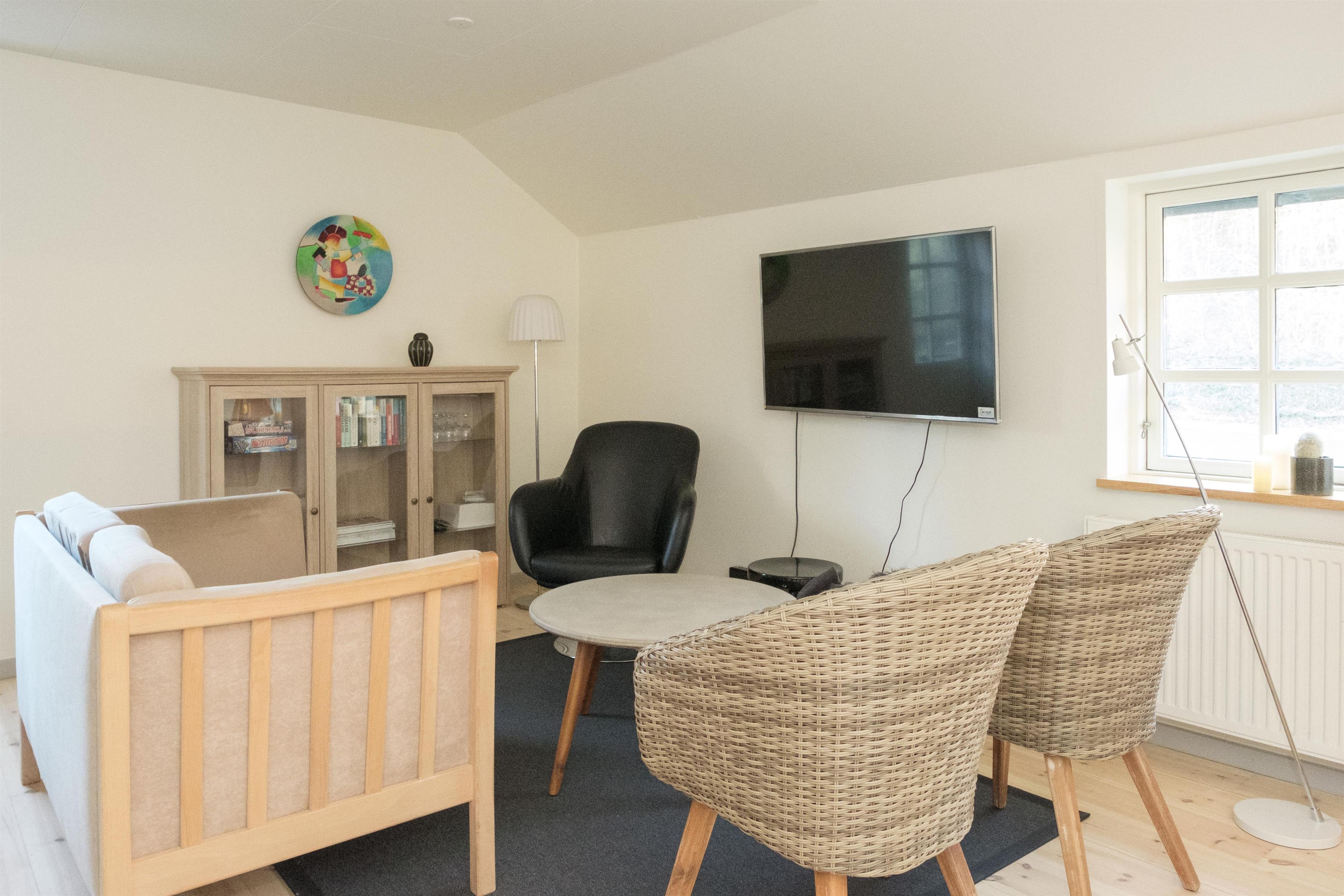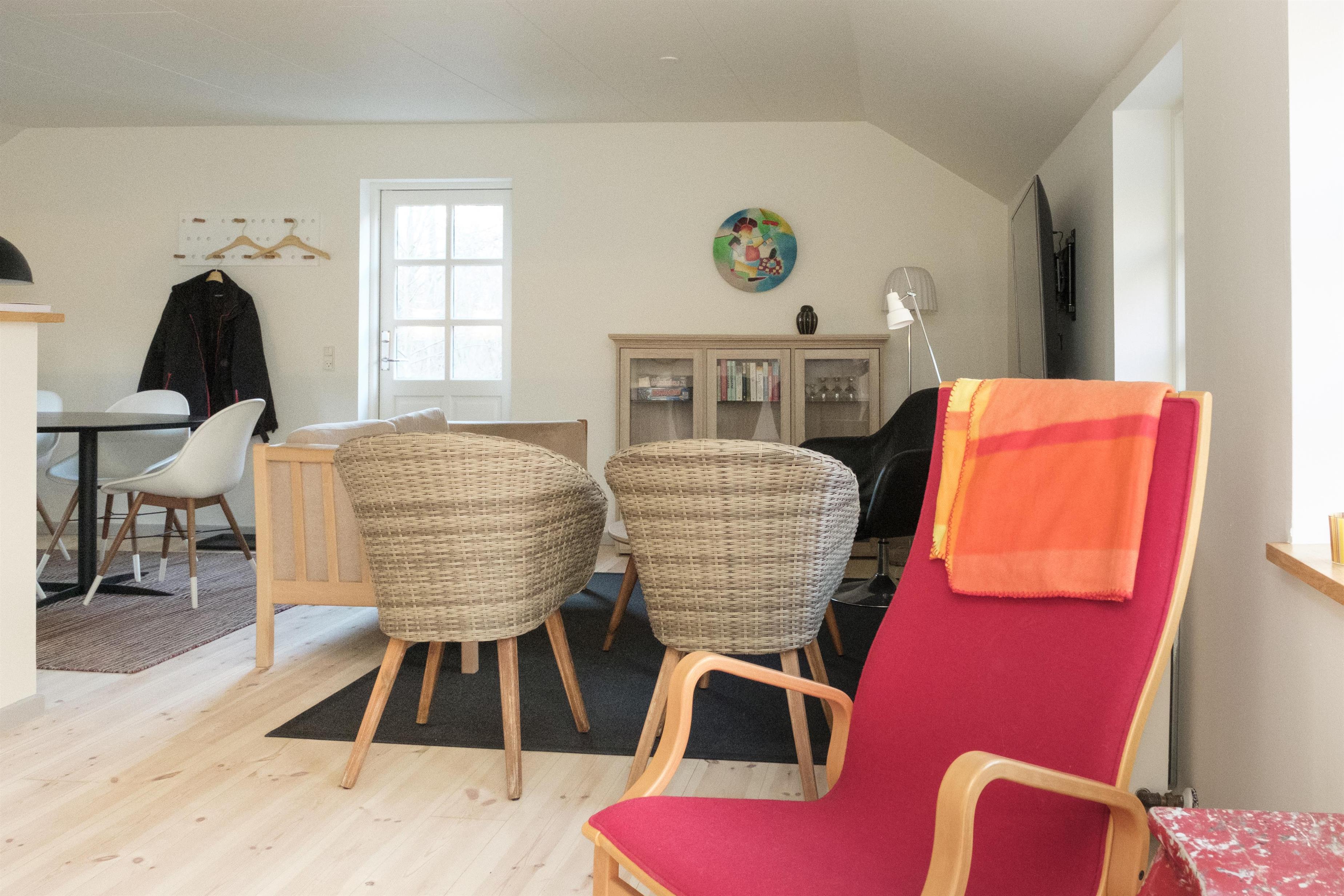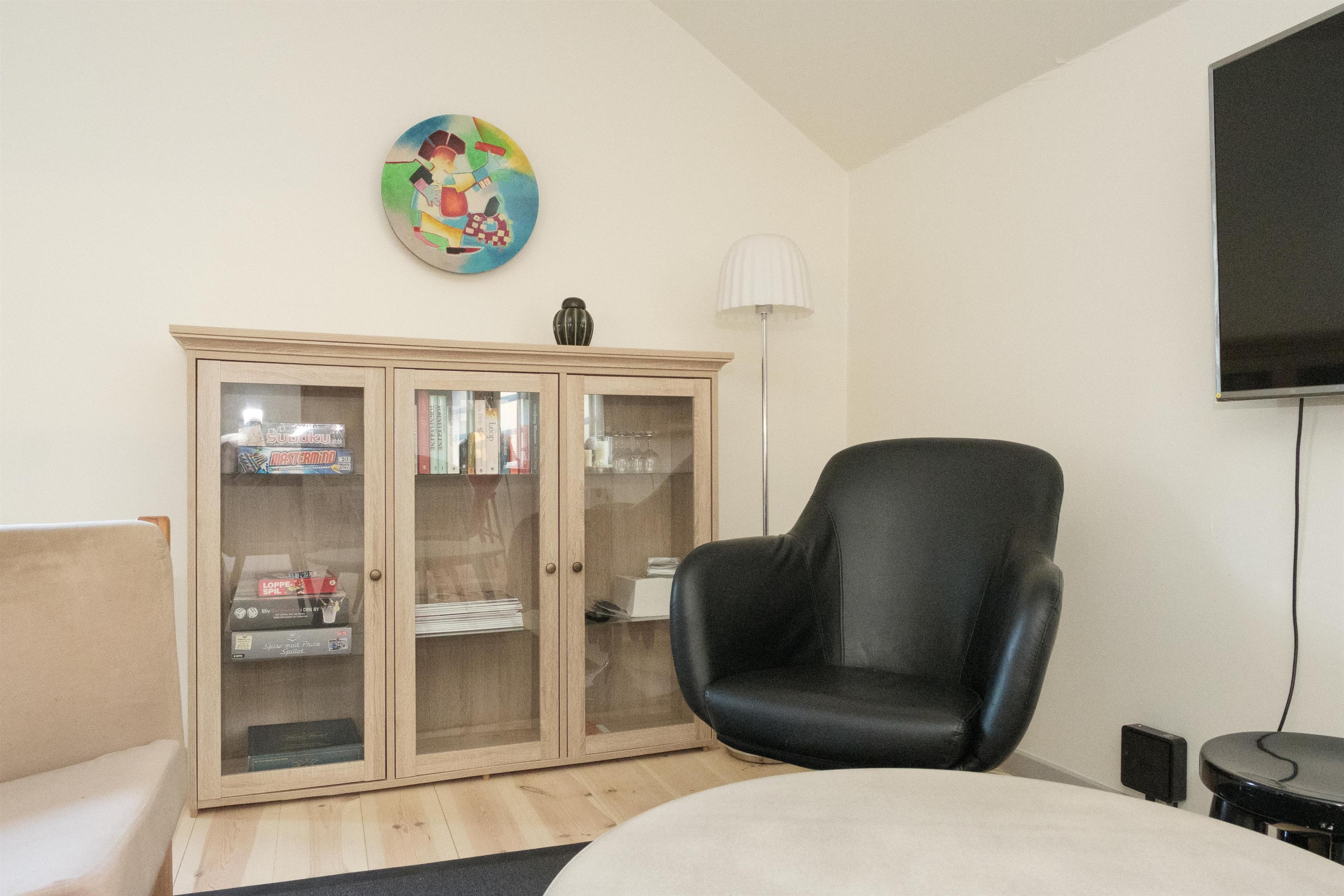 The focal point of the holiday apartment is the lovely, bright living room with a dining area for 6 people, cozy and comfortable sofa seating, as well as a TV with Danish (including TV2) and German channels. Connected to the living room is the new, well-equipped kitchen with a ceramic stove, built-in oven, fridge, freezer, dishwasher, and microwave. The apartment offers 6 sleeping places, spread across 2 bright and spacious bedrooms with double beds, as well as 1 room with a bunk bed. A well-appointed, good bathroom with a shower area and washing machine. For the youngest guests, a crib and high chair are provided. Internet access is available. There is a lovely balcony with good garden furniture, loungers, an umbrella, and a barbecue.
