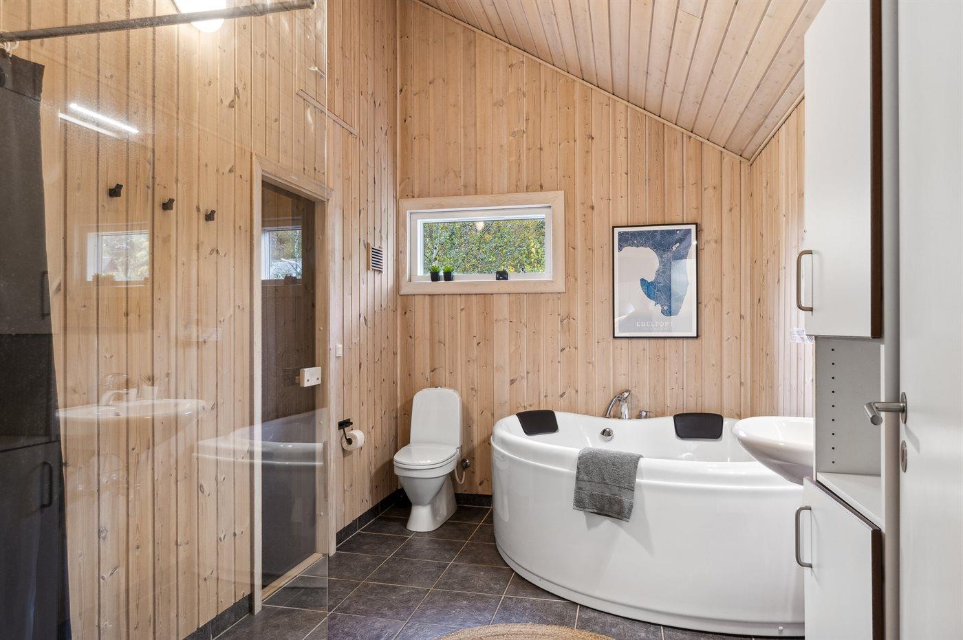 Er is 1 badkamer met douchehok en 2 toiletten, waarvan 1 gastentoilet. Er is vloerverwarming in 1 badkamer. De sauna biedt de gelegenheid tot ontspanning.