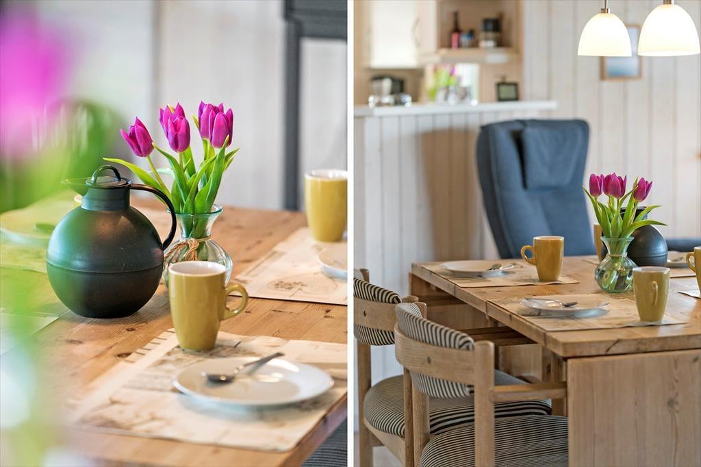 Step into this bright and modern holiday home and you’ll immediately feel a sense of calm and comfort in a space designed for relaxation and togetherness. Every detail has been carefully considered – from the large windows that let in lots of natural light to the cosy atmosphere that invites shared cooking, relaxed conversation and slow mornings with a cup of coffee in hand. The kitchen and living room are openly connected, forming a natural centre for holiday life, where presence and quality time take the lead. Whether the weather is at its best or the wind is howling outside, there’s always a cosy corner to relax in – maybe with a good book or a board game at the dining table.