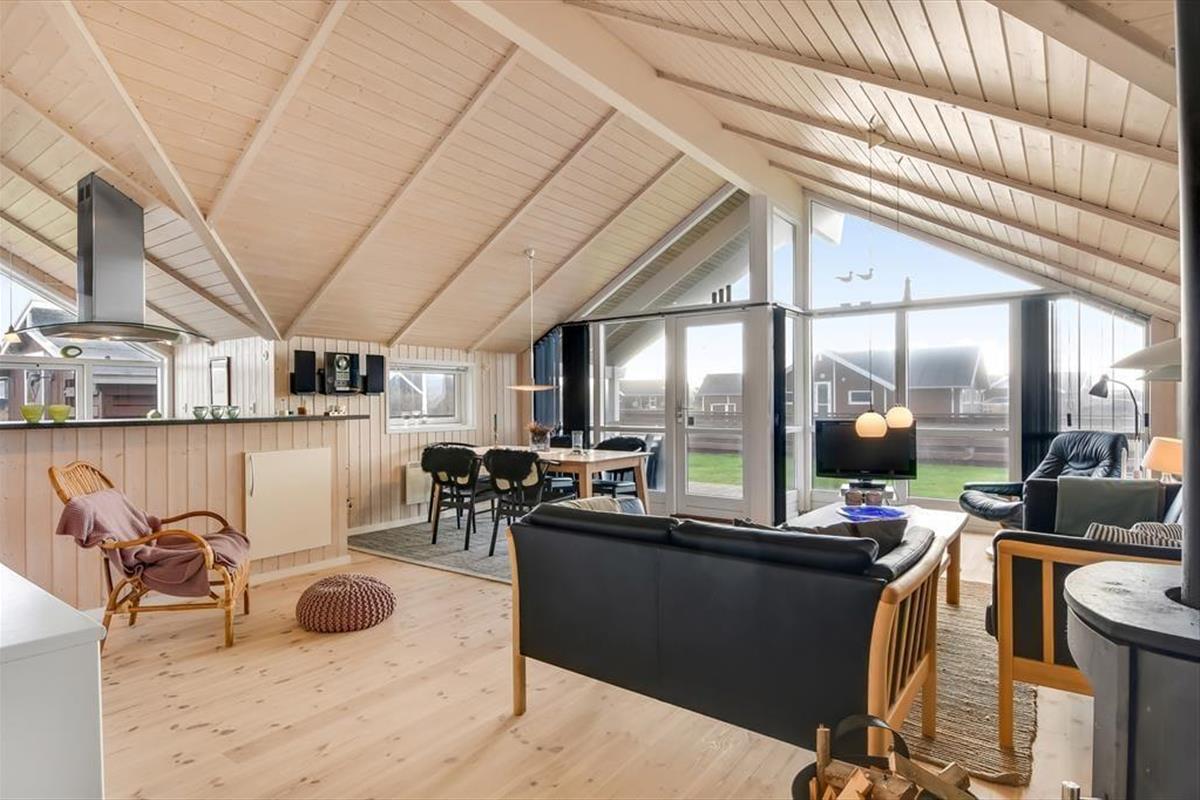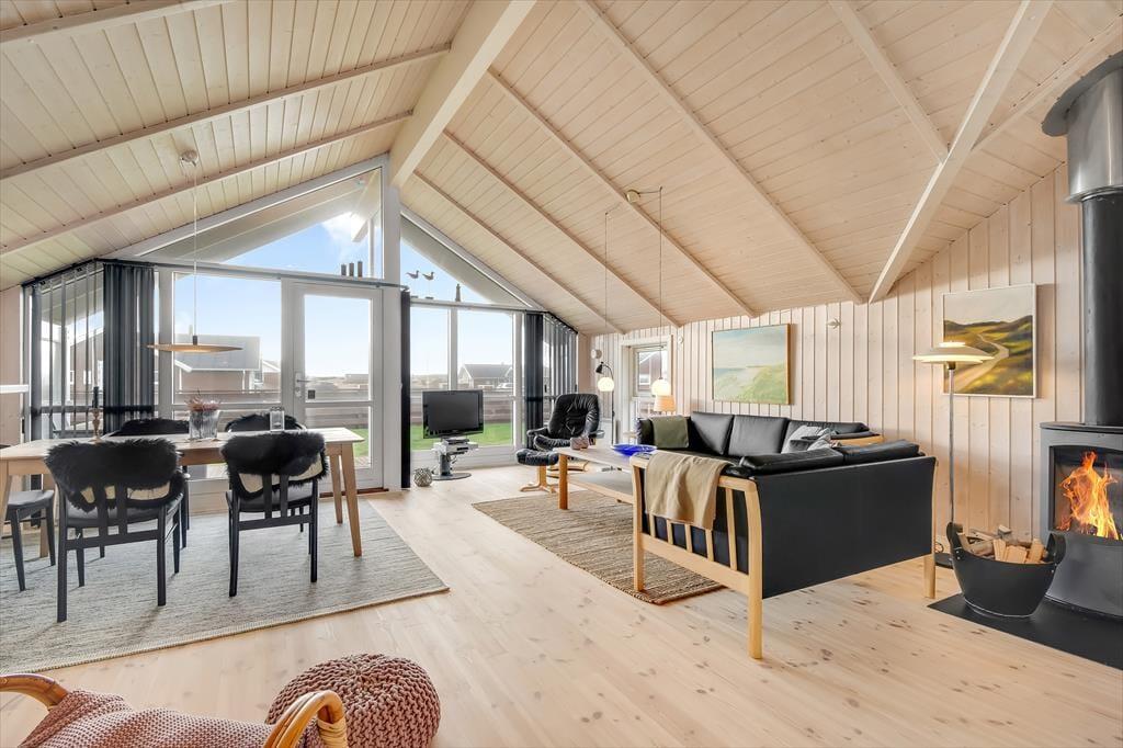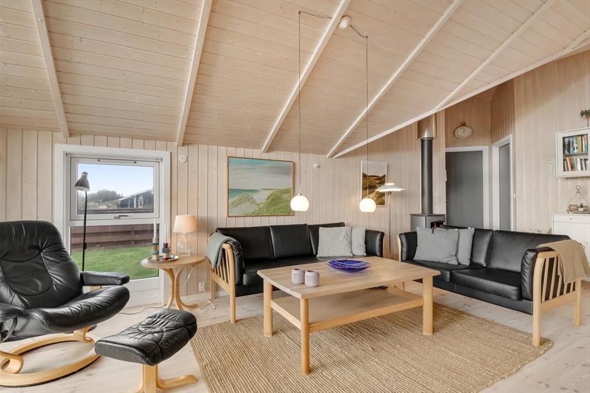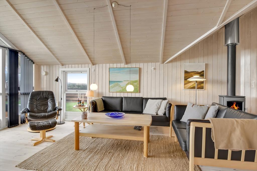 This holiday home is light and thoughtfully furnished, with a focus on comfort and togetherness. You'll instantly feel at ease in the relaxed atmosphere that invites quality time with family or close friends. The open layout between the living room and kitchen makes it easy to be together – even while preparing delicious meals. At the heart of the living room, the wood-burning stove radiates warmth and adds to the classic holiday home atmosphere. Settle in with a book, enjoy a board game, or simply listen to the crackling fire as daylight streams through the windows and offers a lovely view of the garden and surrounding nature.