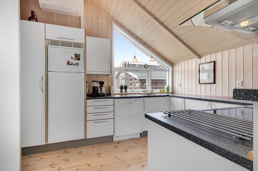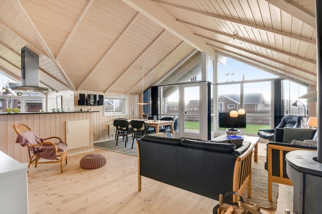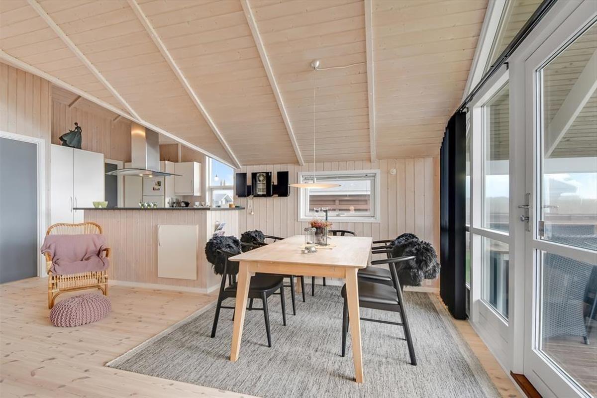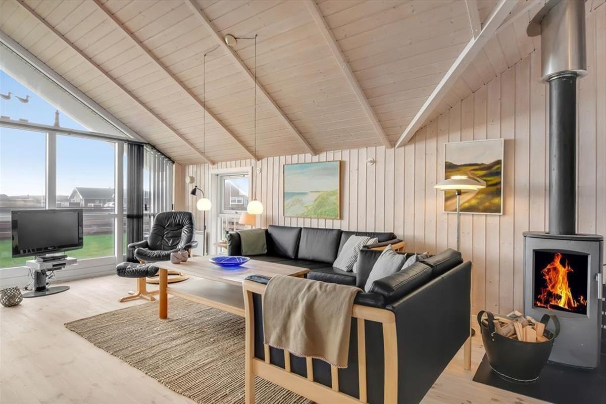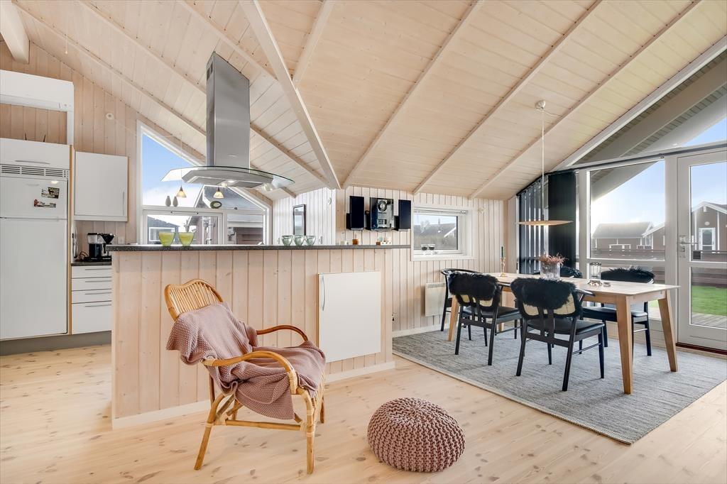 This holiday home is light and thoughtfully furnished, with a focus on comfort and togetherness. You'll instantly feel at ease in the relaxed atmosphere that invites quality time with family or close friends. The open layout between the living room and kitchen makes it easy to be together – even while preparing delicious meals. At the heart of the living room, the wood-burning stove radiates warmth and adds to the classic holiday home atmosphere. Settle in with a book, enjoy a board game, or simply listen to the crackling fire as daylight streams through the windows and offers a lovely view of the garden and surrounding nature.