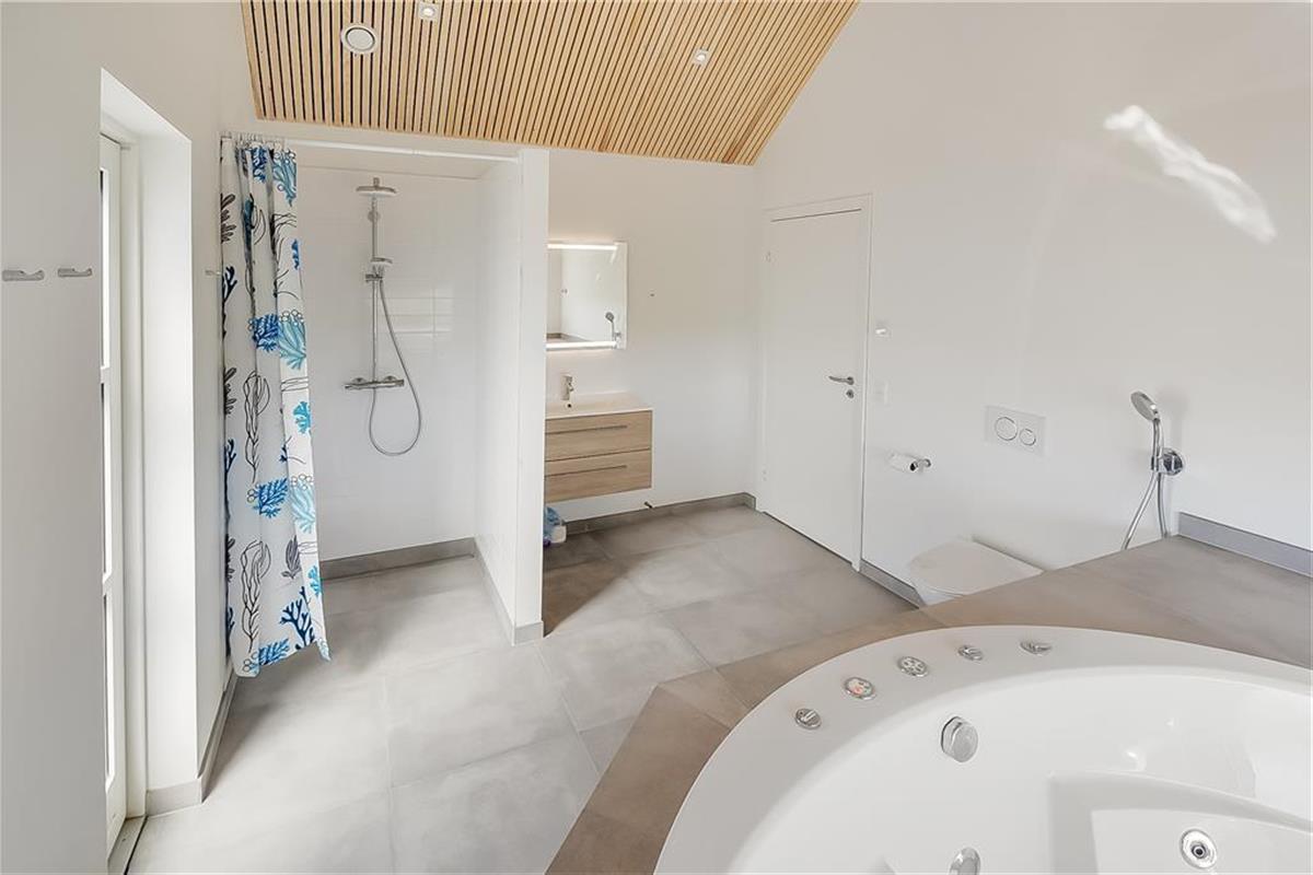From the moment you step into the entrance, it’s clear that this holiday home is something special. The interior is both exclusive and inviting – with herringbone parquet beneath your feet and moulded ceilings that add warmth and character to the rooms. At the heart of the house lies a spacious open-plan living area, where the kitchen, dining space and lounge blend together to create the perfect setting for shared holiday moments. Settle into the sofa with a good book, light the fireplace, and enjoy the view of the garden through the large windows. When it’s time to treat yourself, you can unwind in the indoor spa – and perhaps relax afterwards on the mezzanine, thoughtfully furnished to serve as a cosy additional living space. All in all, this is a holiday home where aesthetics and comfort go hand in hand.