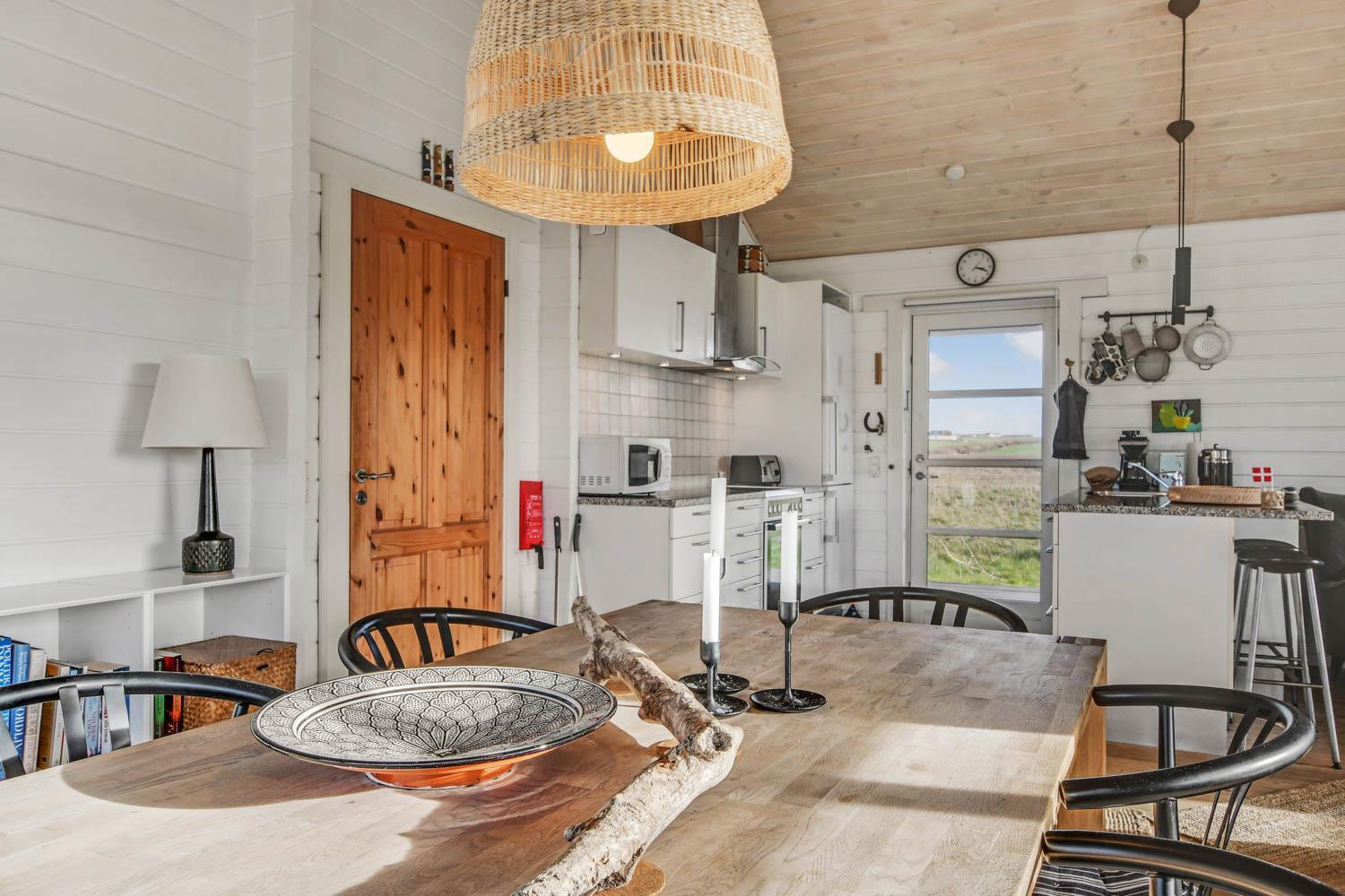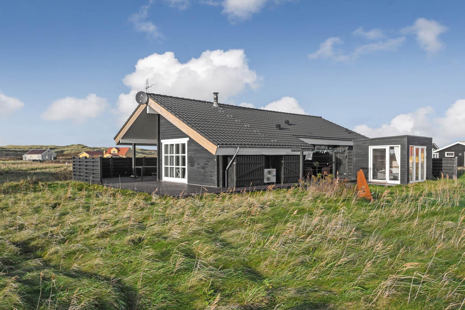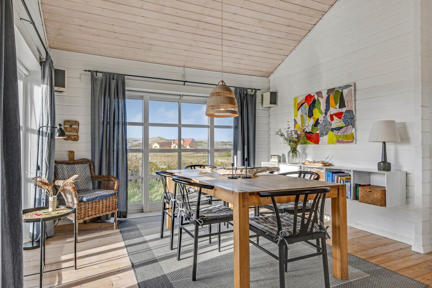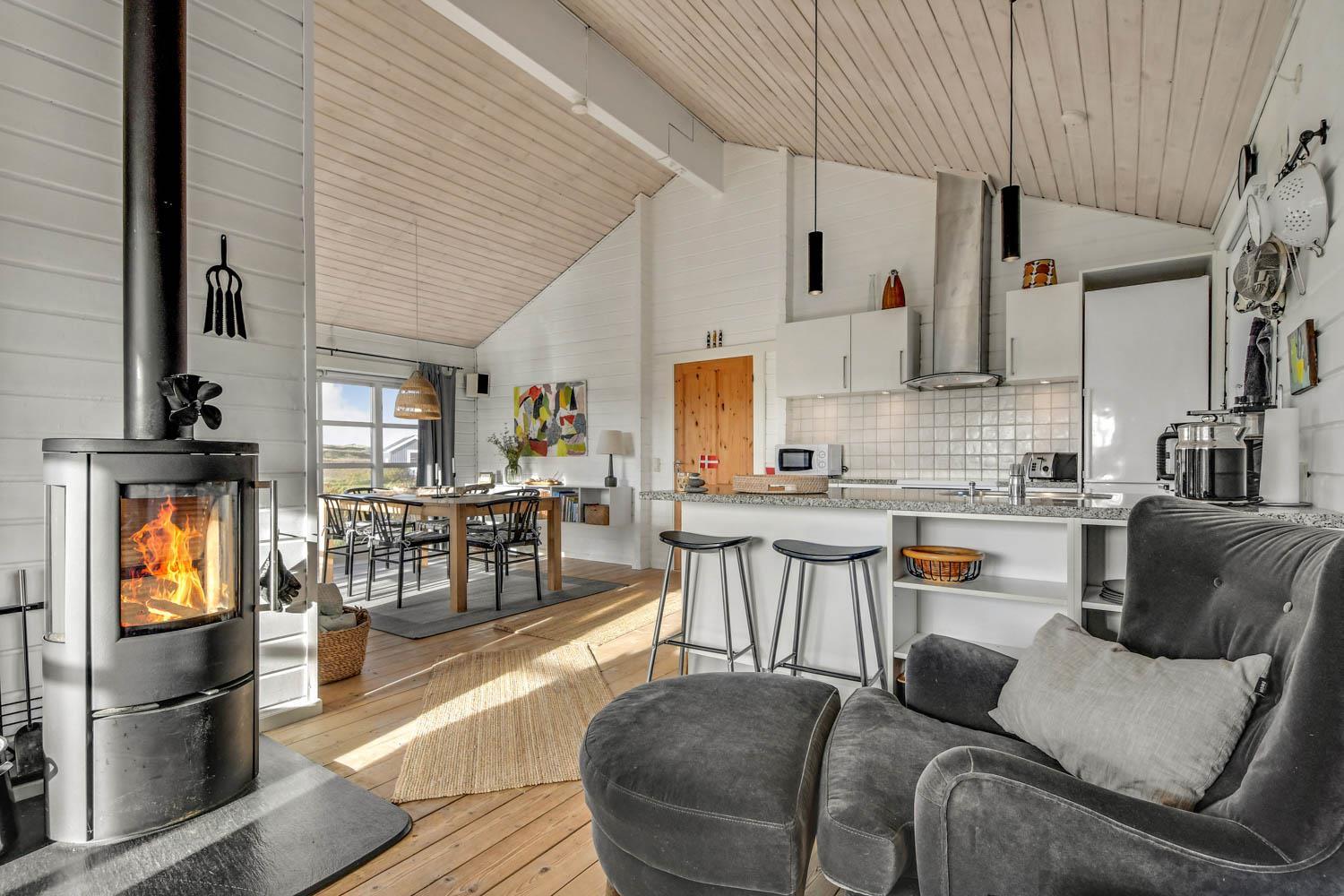 Gut und sehr gemütlich eingerichtetes ganzjähriges Ferienhaus aus Holz und sehr gut isoliert. Das Haus ist hell und einladend eingerichtet mit große Fensterpartien mit gutem Blick zu den Dünen und dem Ferring See mit seiner reichen Vogelwelt. Wohnzimmer und Küche sind kombiniert; es gibt einen großzügigen gemütlichen Raum wo Freunde oder Familien die Urlaubszeit zusammen genießen können. Im Wohnraum gibt es einen Kaminofen und eine Wärmepumpe, die beide für eine gemütliche Wärme sorgen und außerdem auch dabei helfen die Nebenkosten niedriger zu halten. Es gibt F-TV mit Parabol und Sie können deutsche und eine begrenze Anzahl dänischer Programme sehen. Außerdem gibt es einen DVD-Player und freies WLAN. Chromecast kann mitgebracht werden. Schöne helle sehr gut ausgestattete Küche mit Ceranfeld-Kochplatte, Abzugshaube, Kühl-/Gefrierschrank, Geschirrspüler und Mikrowelle. Das Haus hat 3 Schlafräume: 1DB + 1DB + 2B. Badezimmer: Toilette, Dusche, 2 Waschbecken, Fußbodenheizung und Waschmaschine und Trockner. Für die kleinsten Gäste gibt es Kinderbett und Kinderstuhl. Im Wohnraum, Flur und den Schlafräumen gibt es Holzböden. Elektroauto oder einen Plug-in-Hybrid haben, verfügt das Haus über eine Ladegerät, Type 2 die bis zu 11 kWh aufladen kann. 1 Haustier ist erlaubt. Nichtraucher-Haus.