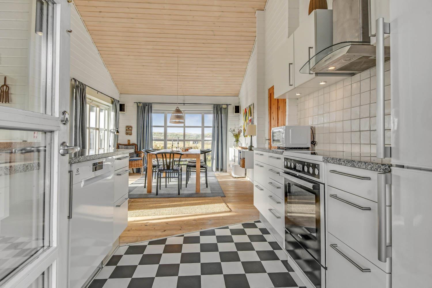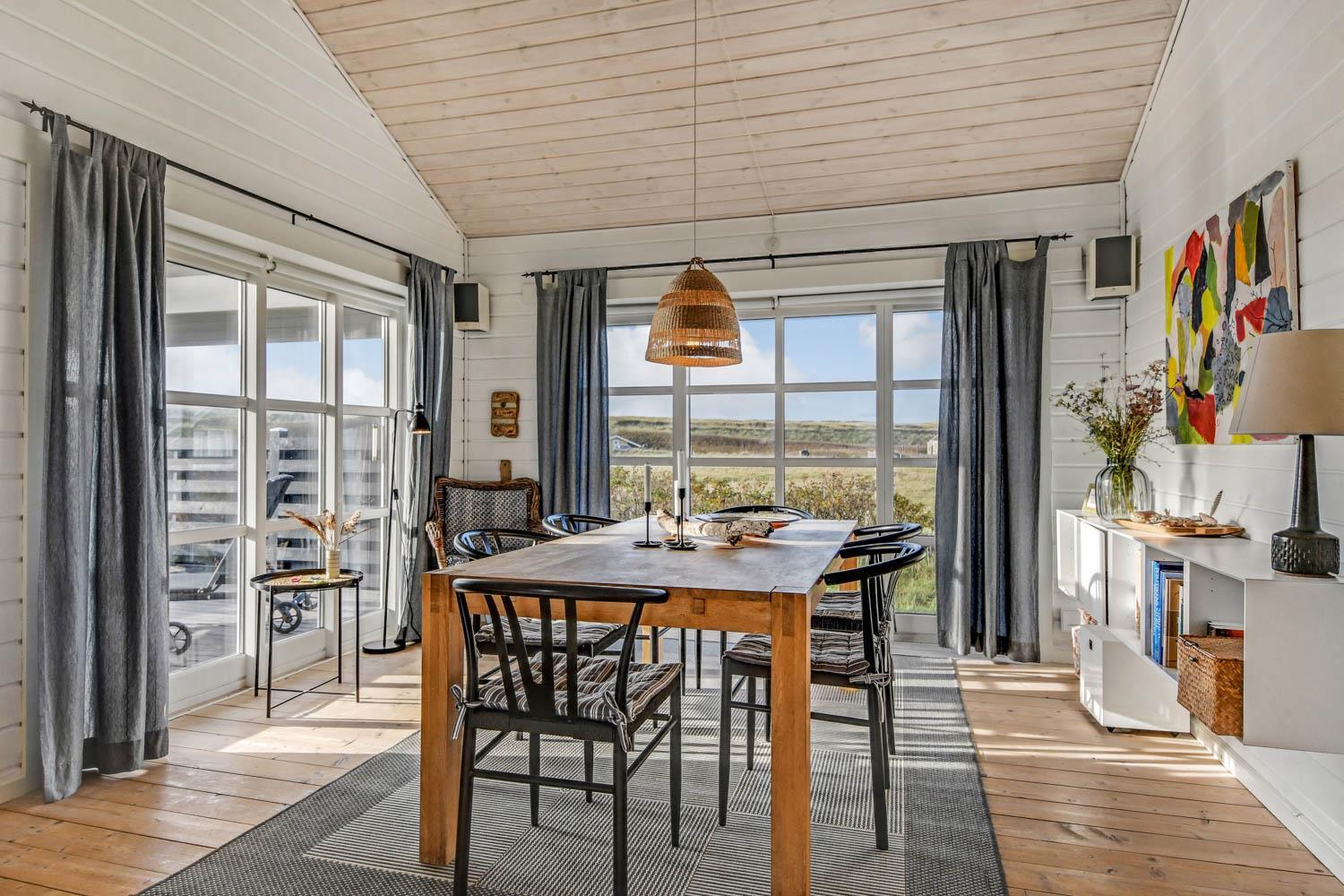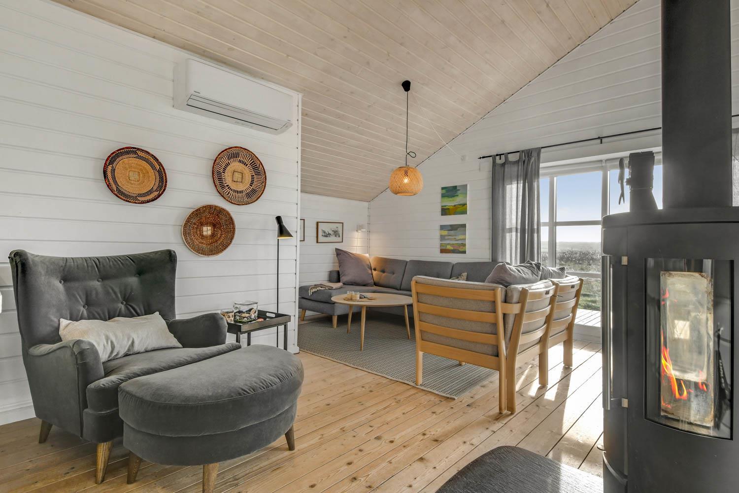 Gut und sehr gemütlich eingerichtetes ganzjähriges Ferienhaus aus Holz und sehr gut isoliert. Das Haus ist hell und einladend eingerichtet mit große Fensterpartien mit gutem Blick zu den Dünen und dem Ferring See mit seiner reichen Vogelwelt. Wohnzimmer und Küche sind kombiniert; es gibt einen großzügigen gemütlichen Raum wo Freunde oder Familien die Urlaubszeit zusammen genießen können. Im Wohnraum gibt es einen Kaminofen und eine Wärmepumpe, die beide für eine gemütliche Wärme sorgen und außerdem auch dabei helfen die Nebenkosten niedriger zu halten. Es gibt F-TV mit Parabol und Sie können deutsche und eine begrenze Anzahl dänischer Programme sehen. Außerdem gibt es einen DVD-Player und freies WLAN. Chromecast kann mitgebracht werden. Schöne helle sehr gut ausgestattete Küche mit Ceranfeld-Kochplatte, Abzugshaube, Kühl-/Gefrierschrank, Geschirrspüler und Mikrowelle. Das Haus hat 3 Schlafräume: 1DB + 1DB + 2B. Badezimmer: Toilette, Dusche, 2 Waschbecken, Fußbodenheizung und Waschmaschine und Trockner. Für die kleinsten Gäste gibt es Kinderbett und Kinderstuhl. Im Wohnraum, Flur und den Schlafräumen gibt es Holzböden. Elektroauto oder einen Plug-in-Hybrid haben, verfügt das Haus über eine Ladegerät, Type 2 die bis zu 11 kWh aufladen kann. 1 Haustier ist erlaubt. Nichtraucher-Haus.