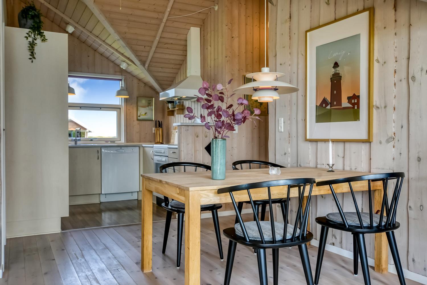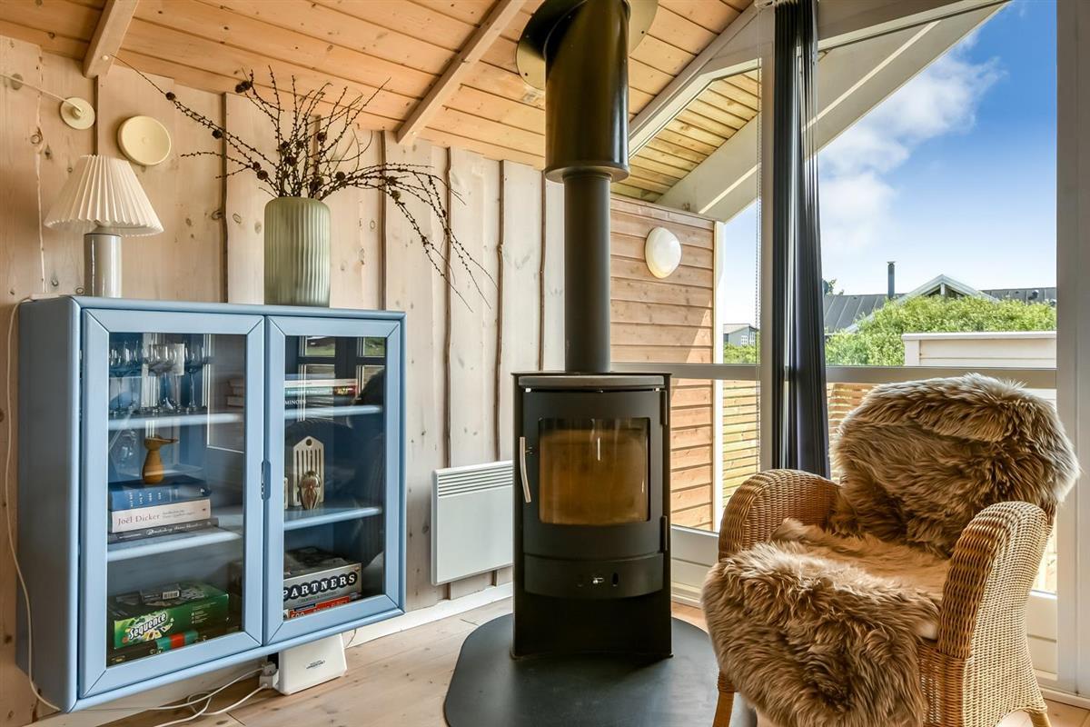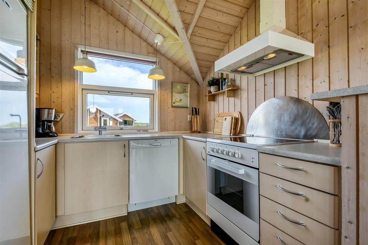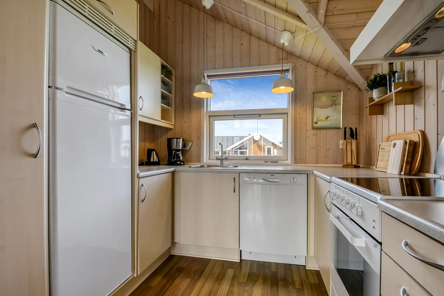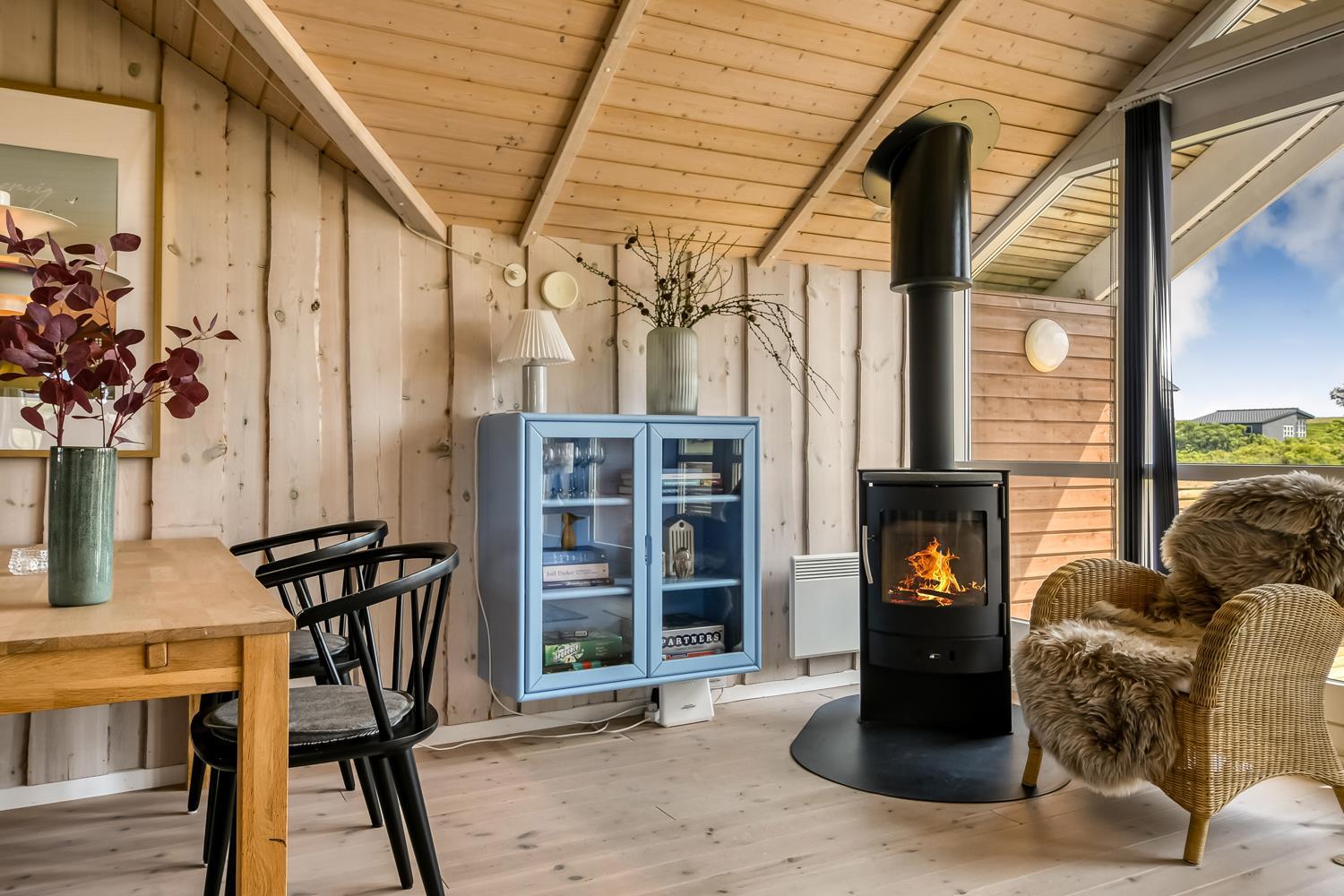 Sobald man den Schlüssel zum Haus abgeholt hat, kann der Urlaub beginnen. Es erwartet einen ein gemütlich eingerichtetes Haus mit 70 m² Wohnfläche, das im Jahr 2005 erbaut wurde. Ein kleiner Eingangsbereich führt in den hellen und einladenden Wohnraum. Dieser besteht aus einem großzügigen, gut genutzten Wohnzimmer mit offener Dachkonstruktion sowie einer kleinen Küchenecke. Im Wohnzimmer sorgt eine große Fensterfront für viel Tageslicht und einen schönen Blick auf die neue eingezäunten Terrasse. Bequeme Polstermöbel und ein Fernseher mit dänischen und deutschen Programmen schaffen eine gemütliche Atmosphäre. An kühleren Tagen sorgt der Kaminofen für wohlige Wärme und zusätzliche Gemütlichkeit – der Sessel direkt daneben lädt zum Entspannen ein, z.B. mit einem guten Buch. Die Küchenecke ist gut ausgestattet, unter anderem mit einem Glaskeramikherd, Abzugshaube, Kühl-/Gefrierschrank, Geschirrspüler und Mikrowelle. Im Haus gibt es ein schönes, helles Badezimmer mit Toilette, Waschbecken und Dusche sowie eine Waschmaschine. Das Badezimmer wird durch eine Fußbodenheizung angenehm beheizt. Abschließend verfügt das Haus über drei gemütliche Schlafzimmer. Eins ist mit einem Doppelbett, eins mit zwei Einzelbetten und das letzte ist mit einem Etagenbett.