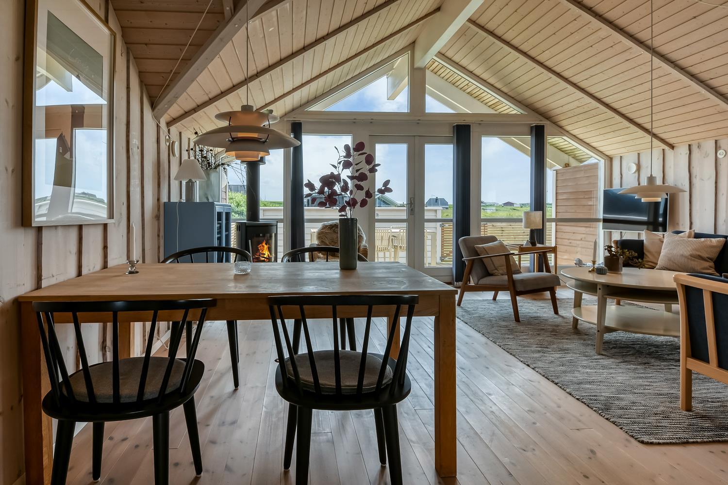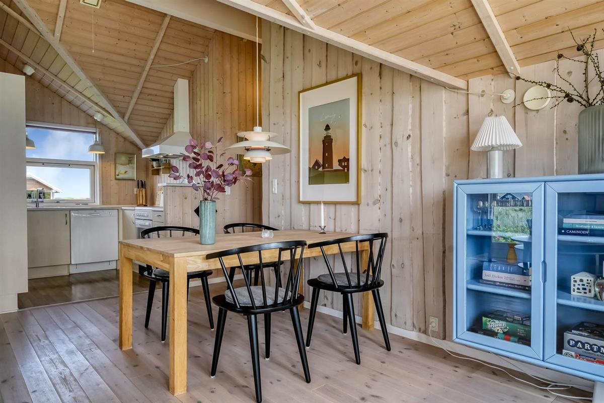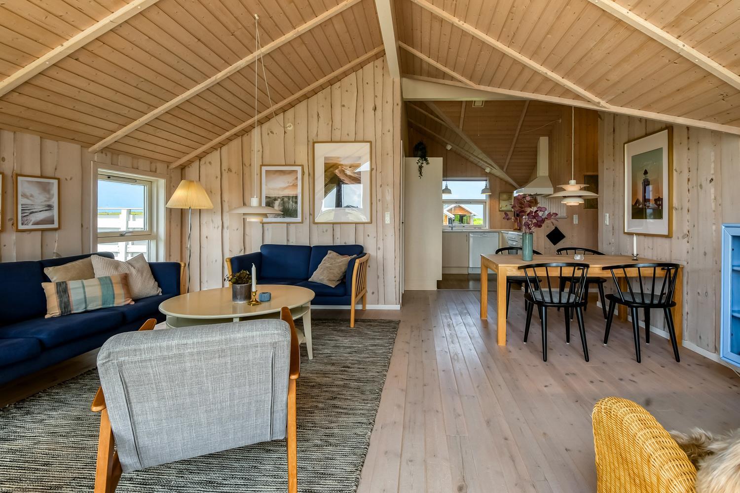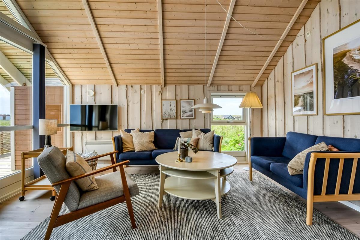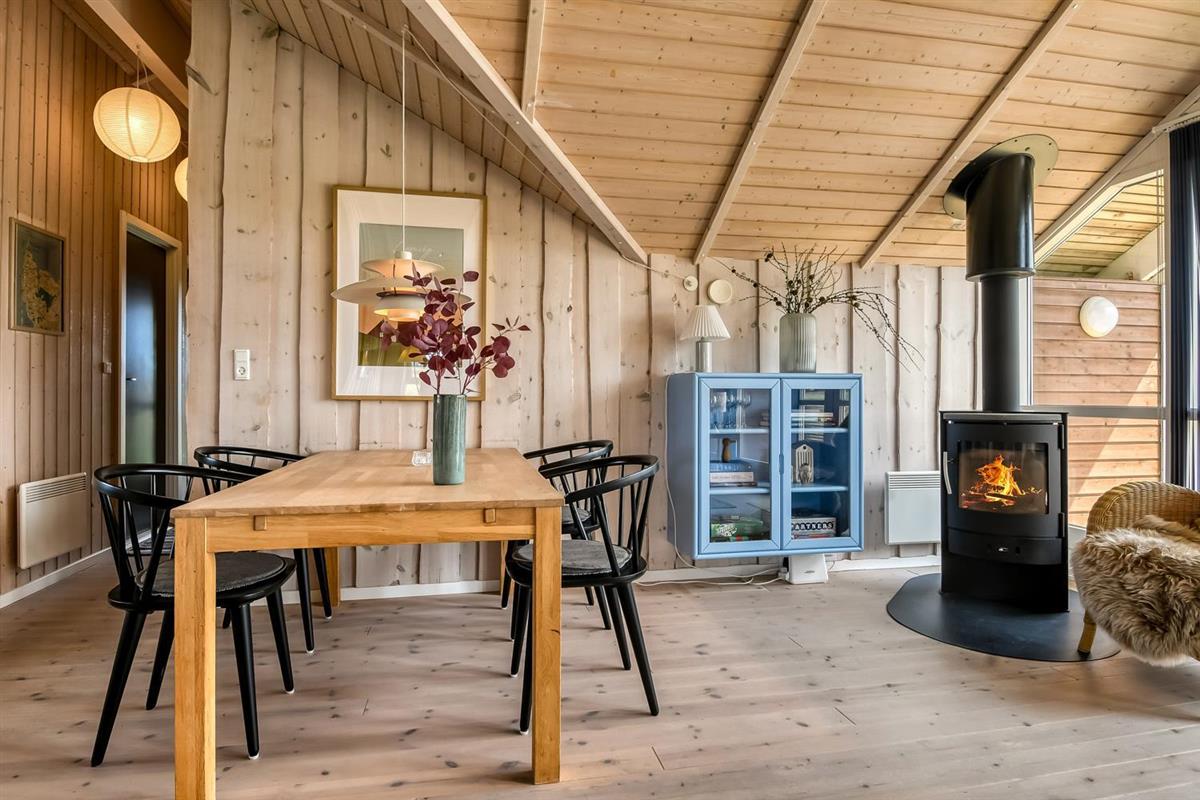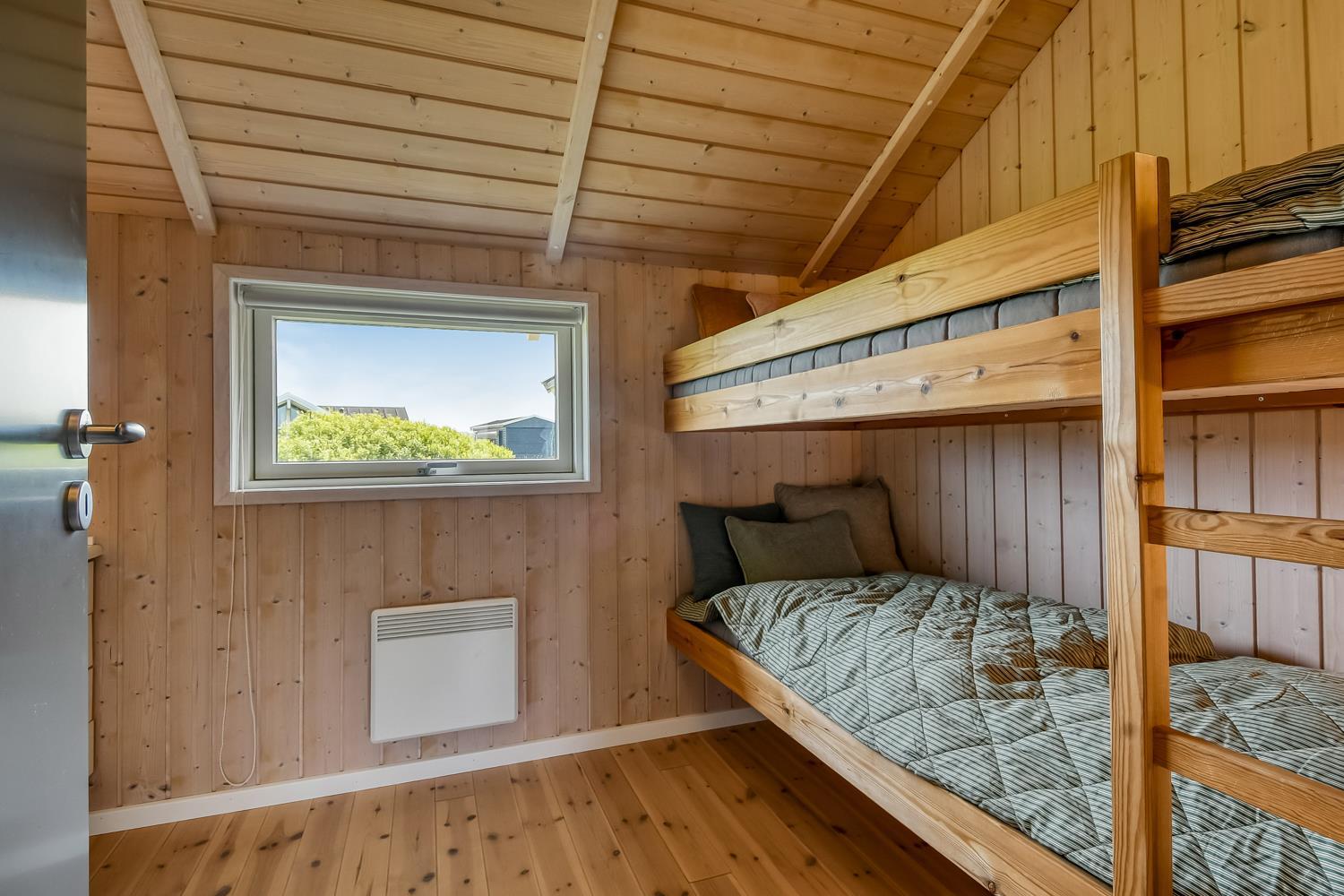 Sobald man den Schlüssel zum Haus abgeholt hat, kann der Urlaub beginnen. Es erwartet einen ein gemütlich eingerichtetes Haus mit 70 m² Wohnfläche, das im Jahr 2005 erbaut wurde. Ein kleiner Eingangsbereich führt in den hellen und einladenden Wohnraum. Dieser besteht aus einem großzügigen, gut genutzten Wohnzimmer mit offener Dachkonstruktion sowie einer kleinen Küchenecke. Im Wohnzimmer sorgt eine große Fensterfront für viel Tageslicht und einen schönen Blick auf die neue eingezäunten Terrasse. Bequeme Polstermöbel und ein Fernseher mit dänischen und deutschen Programmen schaffen eine gemütliche Atmosphäre. An kühleren Tagen sorgt der Kaminofen für wohlige Wärme und zusätzliche Gemütlichkeit – der Sessel direkt daneben lädt zum Entspannen ein, z.B. mit einem guten Buch. Die Küchenecke ist gut ausgestattet, unter anderem mit einem Glaskeramikherd, Abzugshaube, Kühl-/Gefrierschrank, Geschirrspüler und Mikrowelle. Im Haus gibt es ein schönes, helles Badezimmer mit Toilette, Waschbecken und Dusche sowie eine Waschmaschine. Das Badezimmer wird durch eine Fußbodenheizung angenehm beheizt. Abschließend verfügt das Haus über drei gemütliche Schlafzimmer. Eins ist mit einem Doppelbett, eins mit zwei Einzelbetten und das letzte ist mit einem Etagenbett.