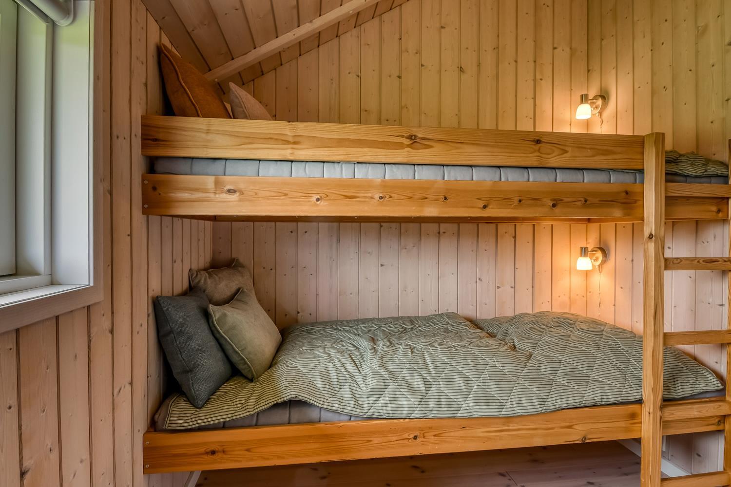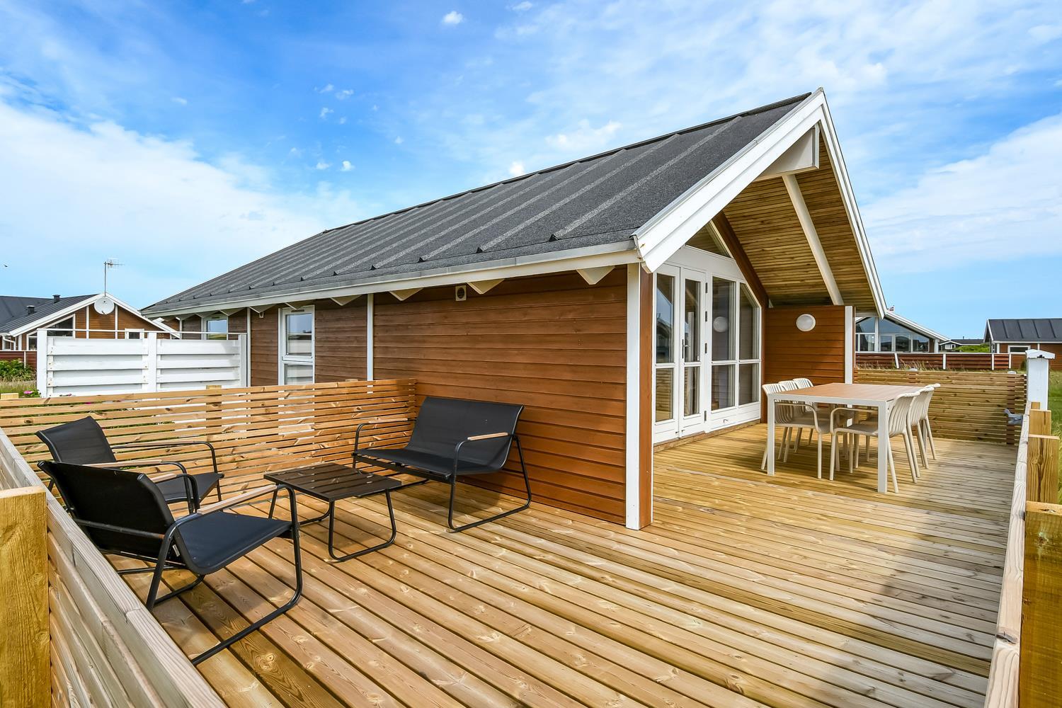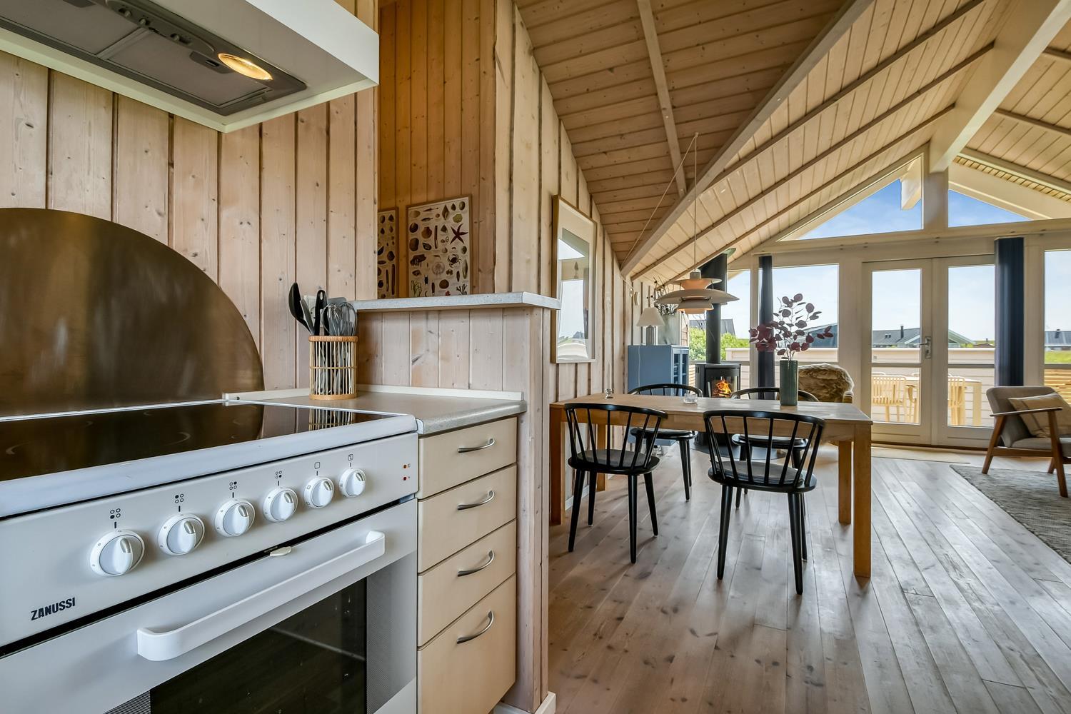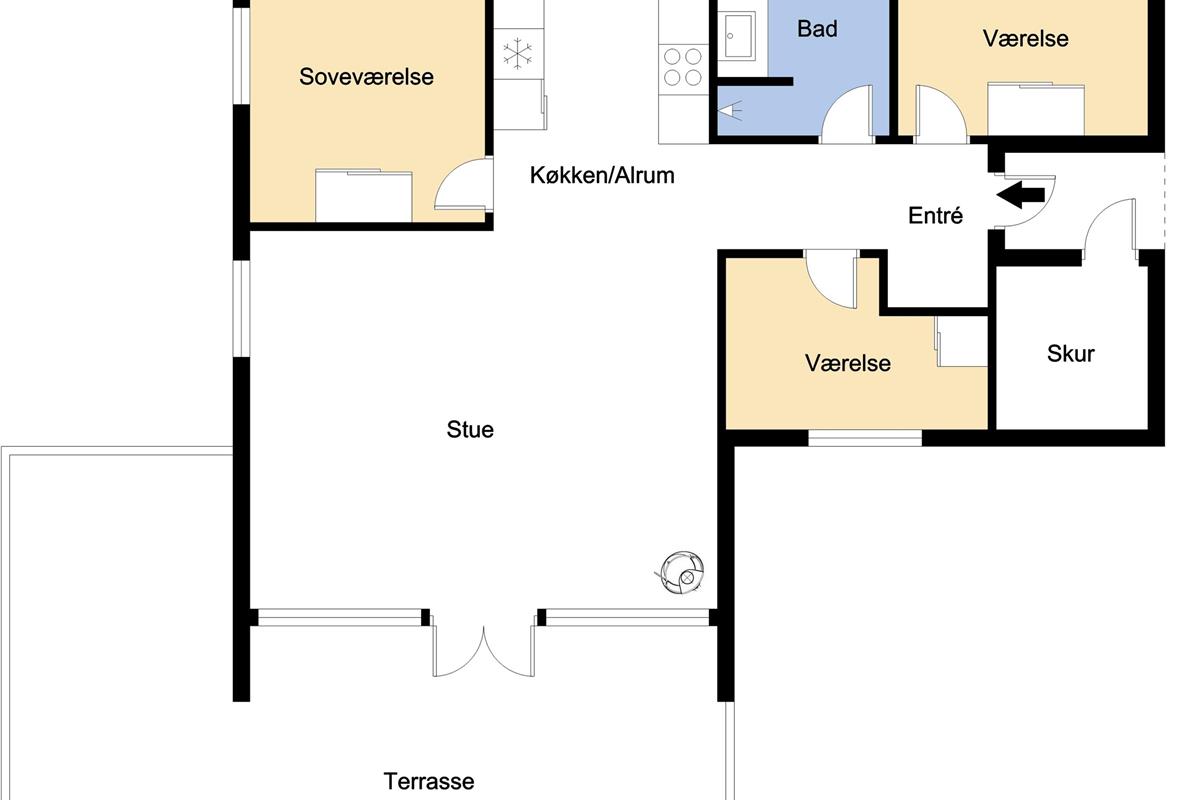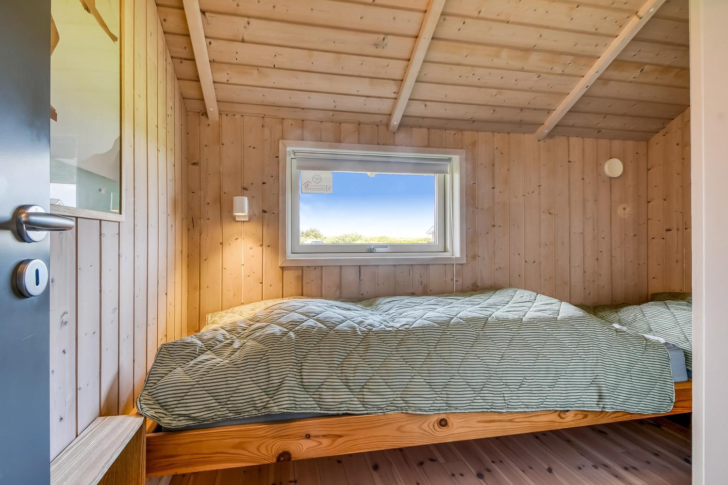Sobald man den Schlüssel zum Haus abgeholt hat, kann der Urlaub beginnen. Es erwartet einen ein gemütlich eingerichtetes Haus mit 70 m² Wohnfläche, das im Jahr 2005 erbaut wurde. Ein kleiner Eingangsbereich führt in den hellen und einladenden Wohnraum. Dieser besteht aus einem großzügigen, gut genutzten Wohnzimmer mit offener Dachkonstruktion sowie einer kleinen Küchenecke. Im Wohnzimmer sorgt eine große Fensterfront für viel Tageslicht und einen schönen Blick auf die neue eingezäunten Terrasse. Bequeme Polstermöbel und ein Fernseher mit dänischen und deutschen Programmen schaffen eine gemütliche Atmosphäre. An kühleren Tagen sorgt der Kaminofen für wohlige Wärme und zusätzliche Gemütlichkeit – der Sessel direkt daneben lädt zum Entspannen ein, z.B. mit einem guten Buch. Die Küchenecke ist gut ausgestattet, unter anderem mit einem Glaskeramikherd, Abzugshaube, Kühl-/Gefrierschrank, Geschirrspüler und Mikrowelle. Im Haus gibt es ein schönes, helles Badezimmer mit Toilette, Waschbecken und Dusche sowie eine Waschmaschine. Das Badezimmer wird durch eine Fußbodenheizung angenehm beheizt. Abschließend verfügt das Haus über drei gemütliche Schlafzimmer. Eins ist mit einem Doppelbett, eins mit zwei Einzelbetten und das letzte ist mit einem Etagenbett.