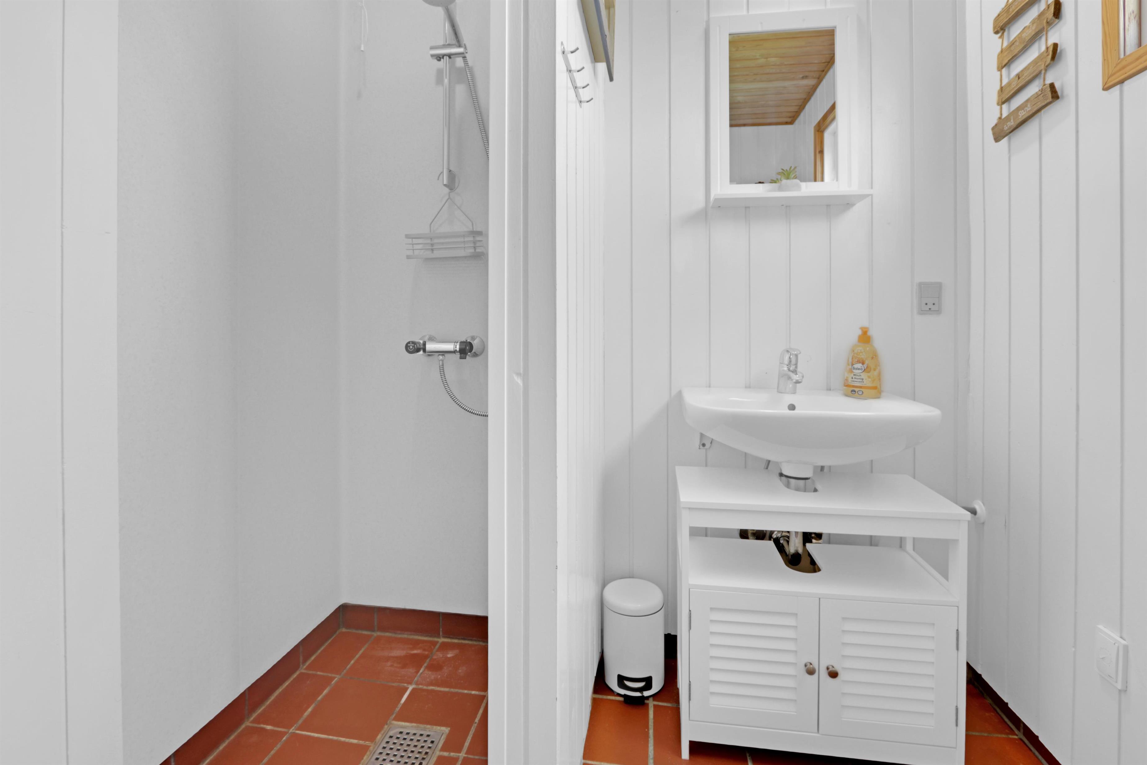 Die Schlafplätze verteilen sich auf ein Schlafzimmer mit Doppelbett im Haupthaus sowie ein Doppelbett im gemütlichen Annex – perfekt für Kinder oder Gäste. Das helle Badezimmer ist funktional ausgestattet mit Dusche, Waschbecken und WC, sowie viele Ablagemöglichkeiten.