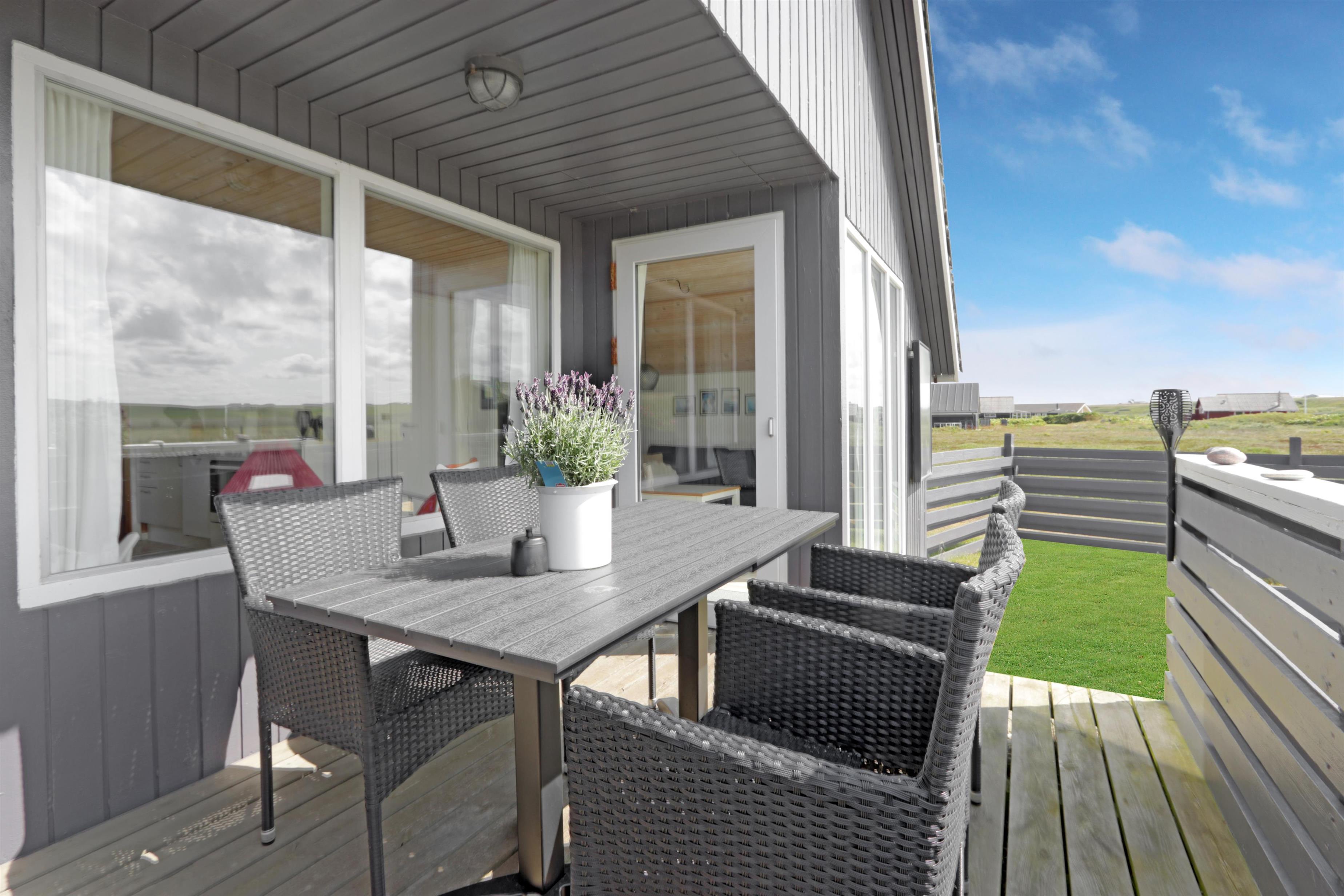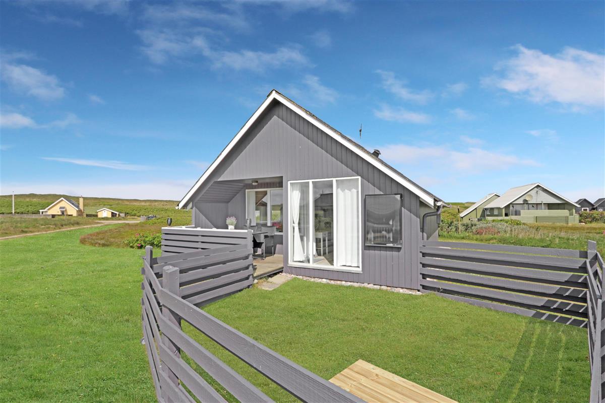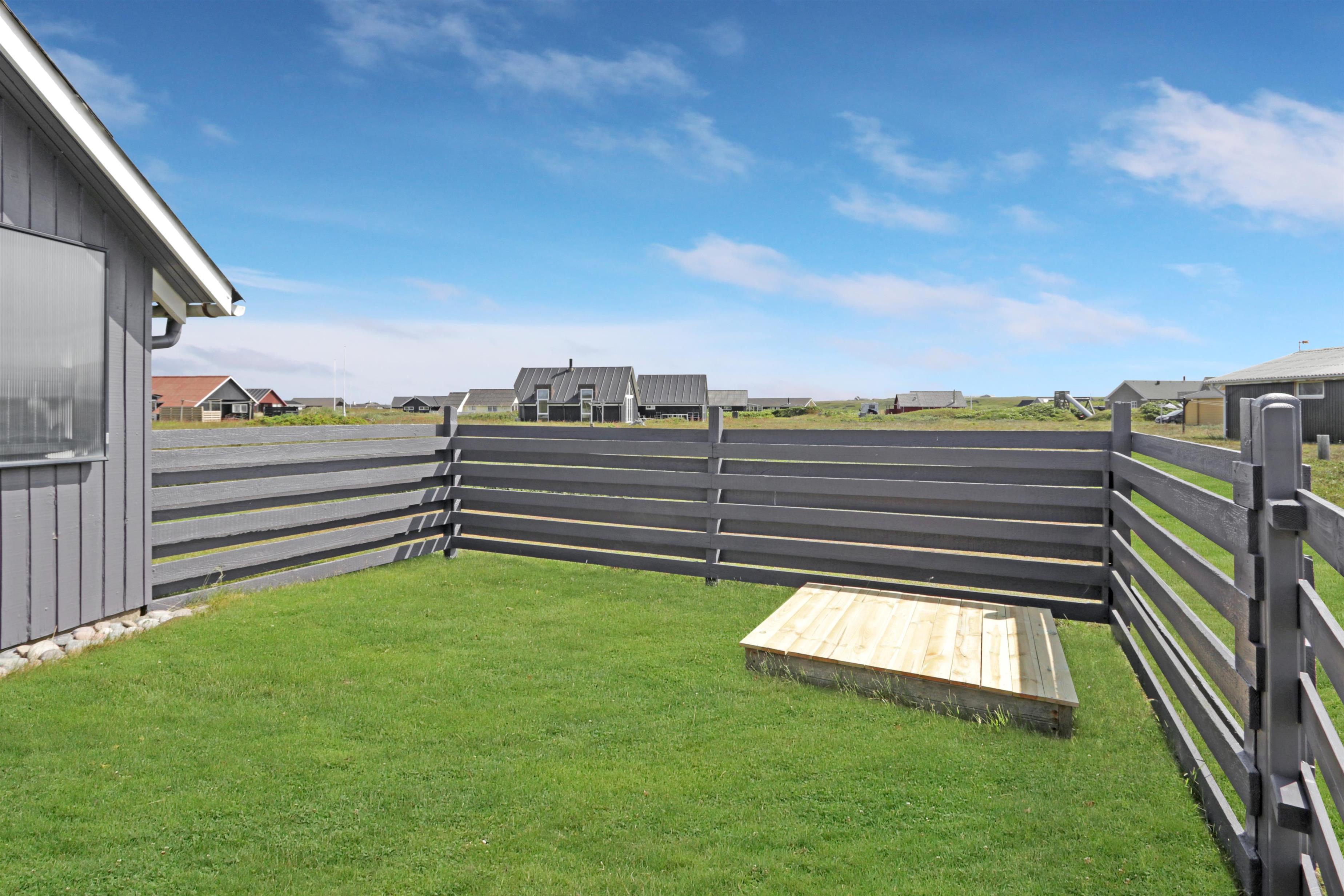 Das Ferienhaus liegt auf einem 1.488?m² großen, privaten Naturgrundstück – nur 100?Meter vom rauschenden Meer entfernt. Auf den großzügigen Terrassen können Sie den ganzen Tag verbringen. Eine Terrasse ist mit Rasen komplett eingezäunt, zum Teil überdacht, der andere offen – ideal bei jedem Wetter. Die andere Terrasse befindet sich auf der anderen Seite des Hauses, wo man eine faszinierende Aussicht auf das Grün hat, sowie die Möglichkeit, den Sonnenuntergang zu beobachten. Gartenmöbel, Sonnenliegen und ein Grill stehen bereit, damit Sie den Platz flexibel nach Sonne, Schatten oder Windschutz wählen können. Für die kleinen Gäste gibt es eine Sandkiste zum Spielen und Buddeln im eingezäunten Bereich des Aussenanlage.
