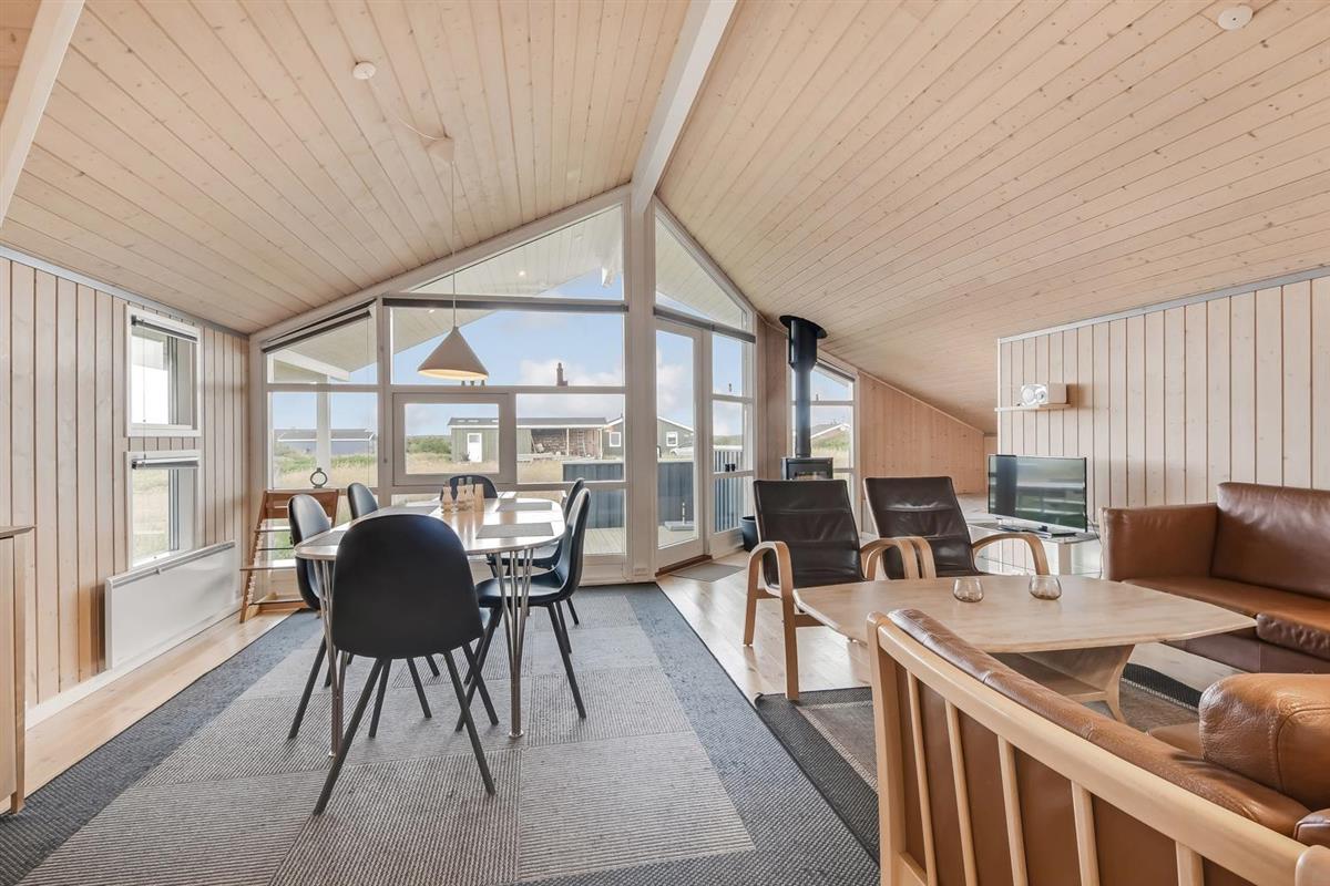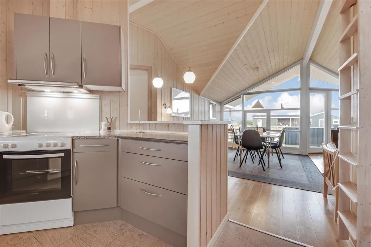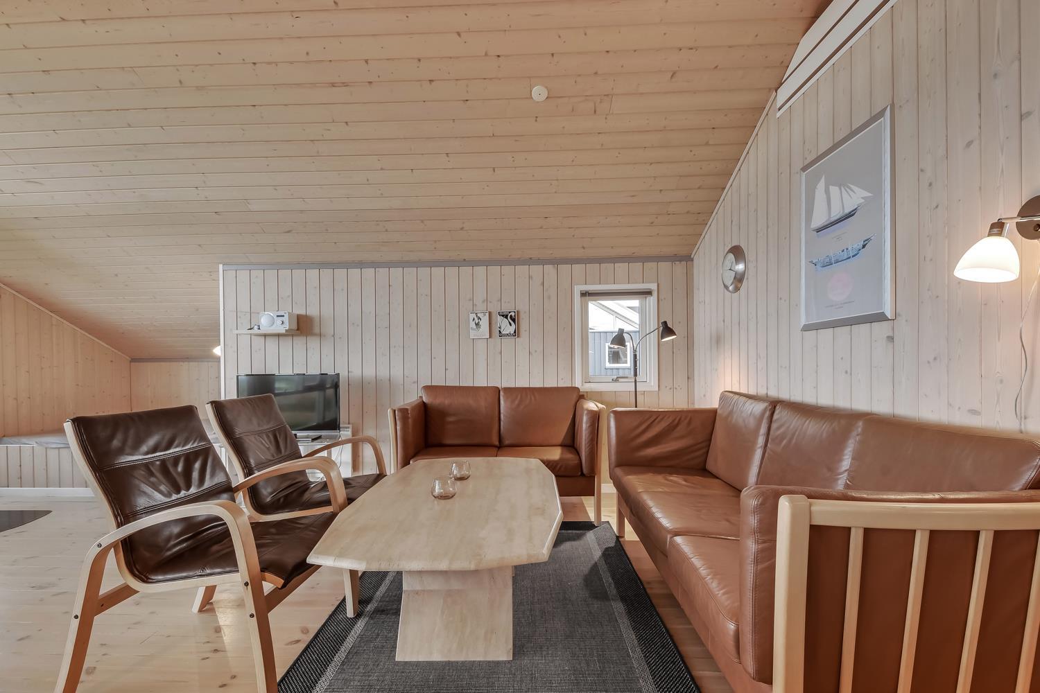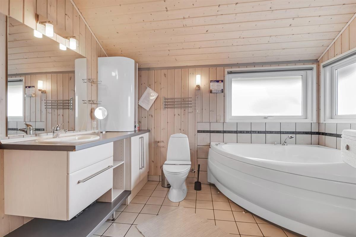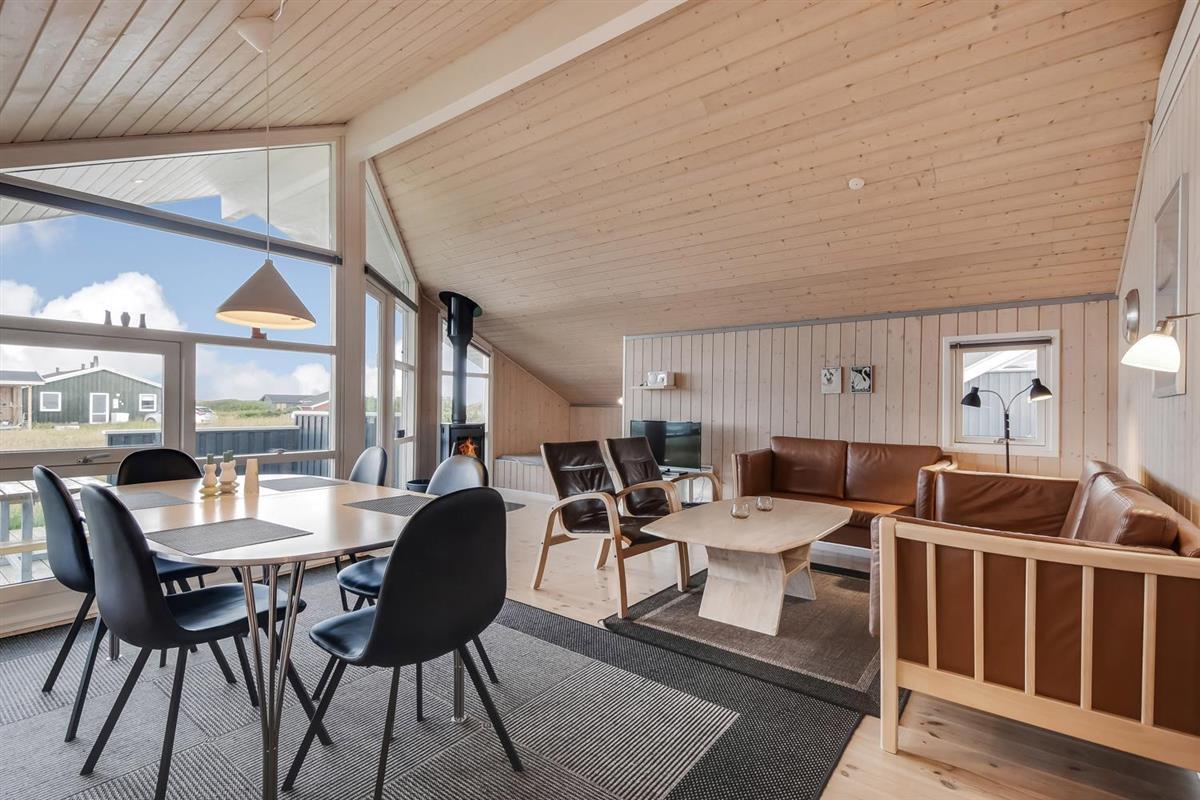 Sehr schönes und modernes Ferienhaus im Jahr 2005 mit geweißtem Holz und Holzböden mit kleinen Teppichen. Gut ausgestattete Küche mit Ceranfeld-Kochherd, Abzugshaube, Kühl-/Gefrierschrank, Geschirrspüler, Mikrowelle und Linoleumboden. Schöner Wohnraum mit Ledermöbeln, TV mit Cromecast und mit dänischen und deutschen Programmen, Radio und schönem Kaminofen, der immer eine gute und schöne Wärme gibt, auch an kalten Tagen. Badezimmer mit Toilette, Waschbecken, Dusche, Whirlpool und Sauna. Extra Badezimmer mit Toilette. Waschbecken, Waschmaschine und Trockner. 3 gute Schlafräume mit: 1 DB + 1DB + (1DB + 2k). Alkoven mit 1 Schlafmöglichkeit. 2 Haustiere sind erlaubt. Nichtraucher-Haus. 1 Kinderstuhl.