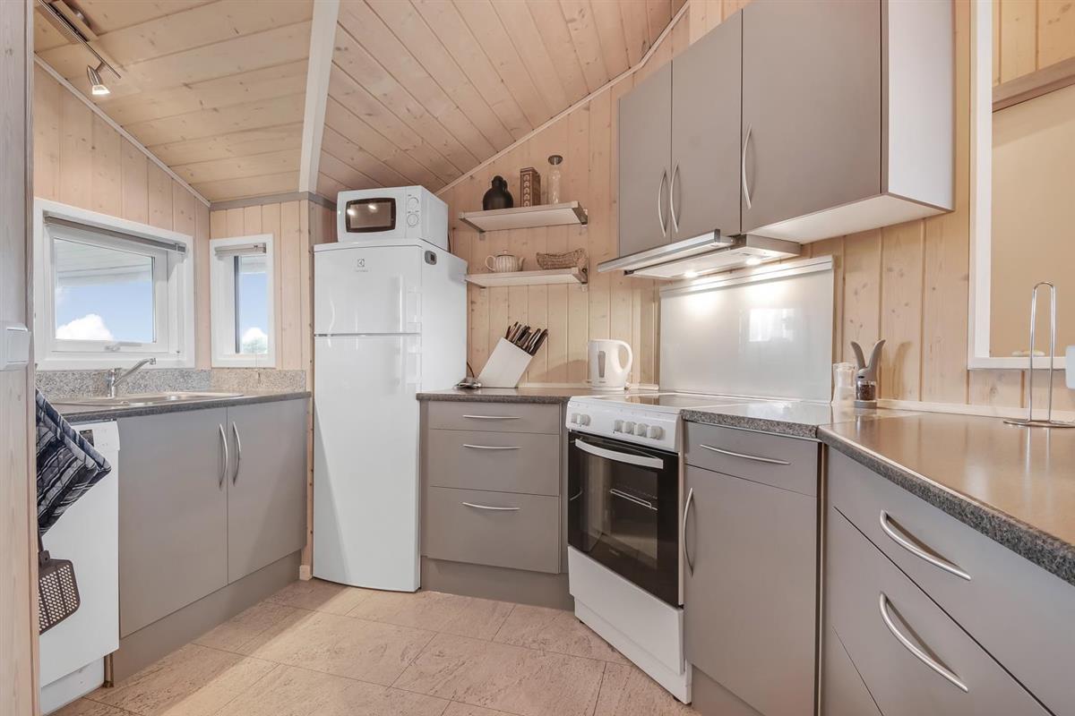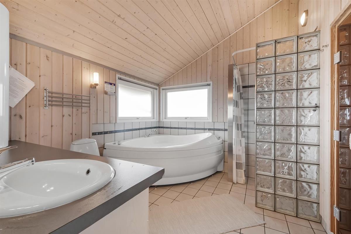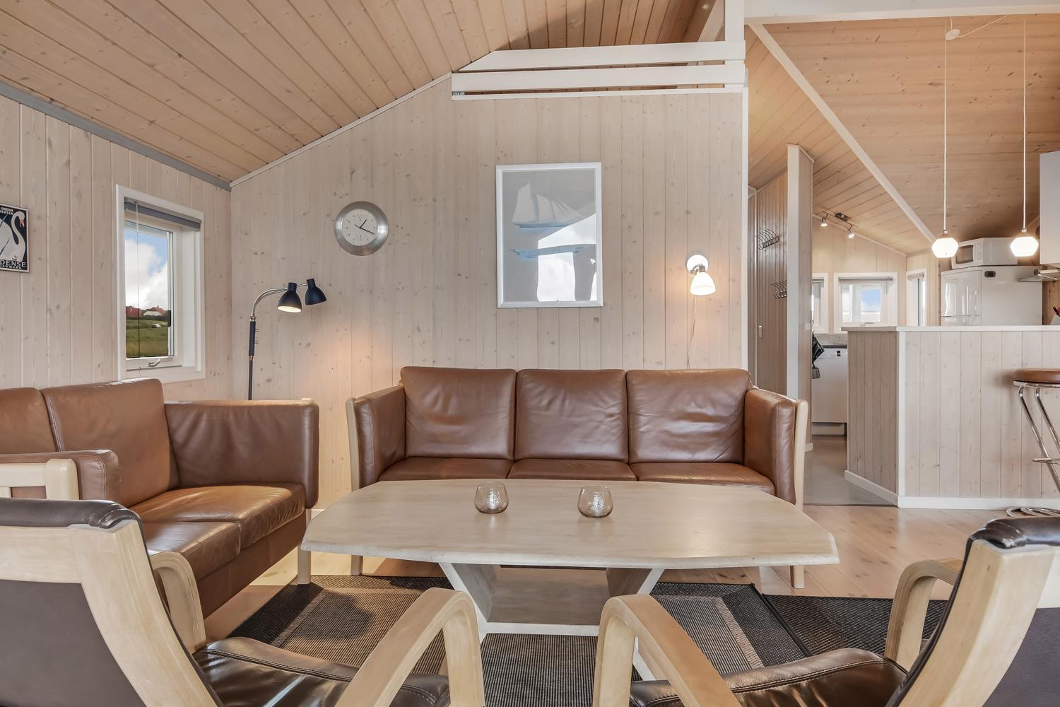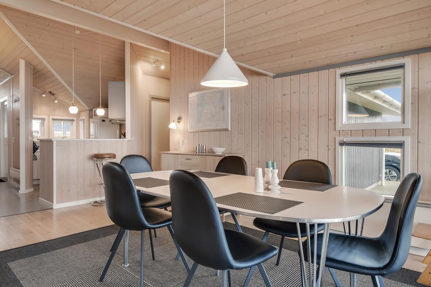 Sehr schönes und modernes Ferienhaus im Jahr 2005 mit geweißtem Holz und Holzböden mit kleinen Teppichen. Gut ausgestattete Küche mit Ceranfeld-Kochherd, Abzugshaube, Kühl-/Gefrierschrank, Geschirrspüler, Mikrowelle und Linoleumboden. Schöner Wohnraum mit Ledermöbeln, TV mit Cromecast und mit dänischen und deutschen Programmen, Radio und schönem Kaminofen, der immer eine gute und schöne Wärme gibt, auch an kalten Tagen. Badezimmer mit Toilette, Waschbecken, Dusche, Whirlpool und Sauna. Extra Badezimmer mit Toilette. Waschbecken, Waschmaschine und Trockner. 3 gute Schlafräume mit: 1 DB + 1DB + (1DB + 2k). Alkoven mit 1 Schlafmöglichkeit. 2 Haustiere sind erlaubt. Nichtraucher-Haus. 1 Kinderstuhl.