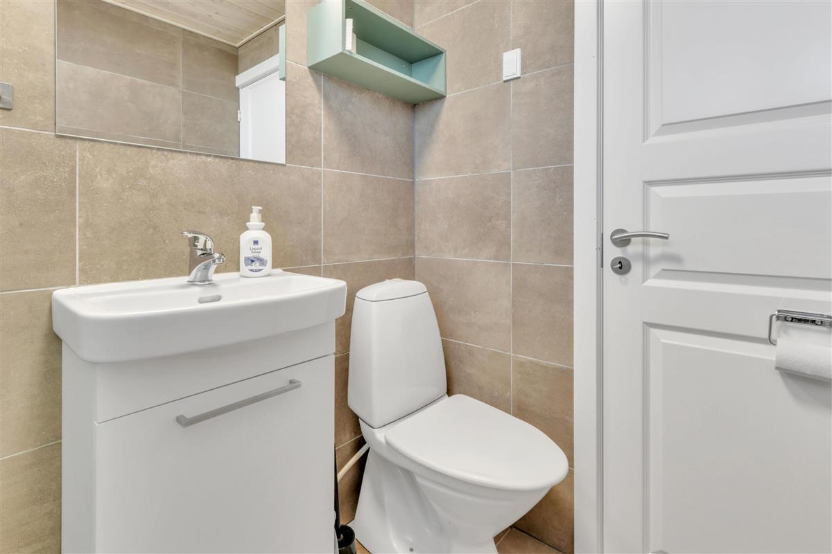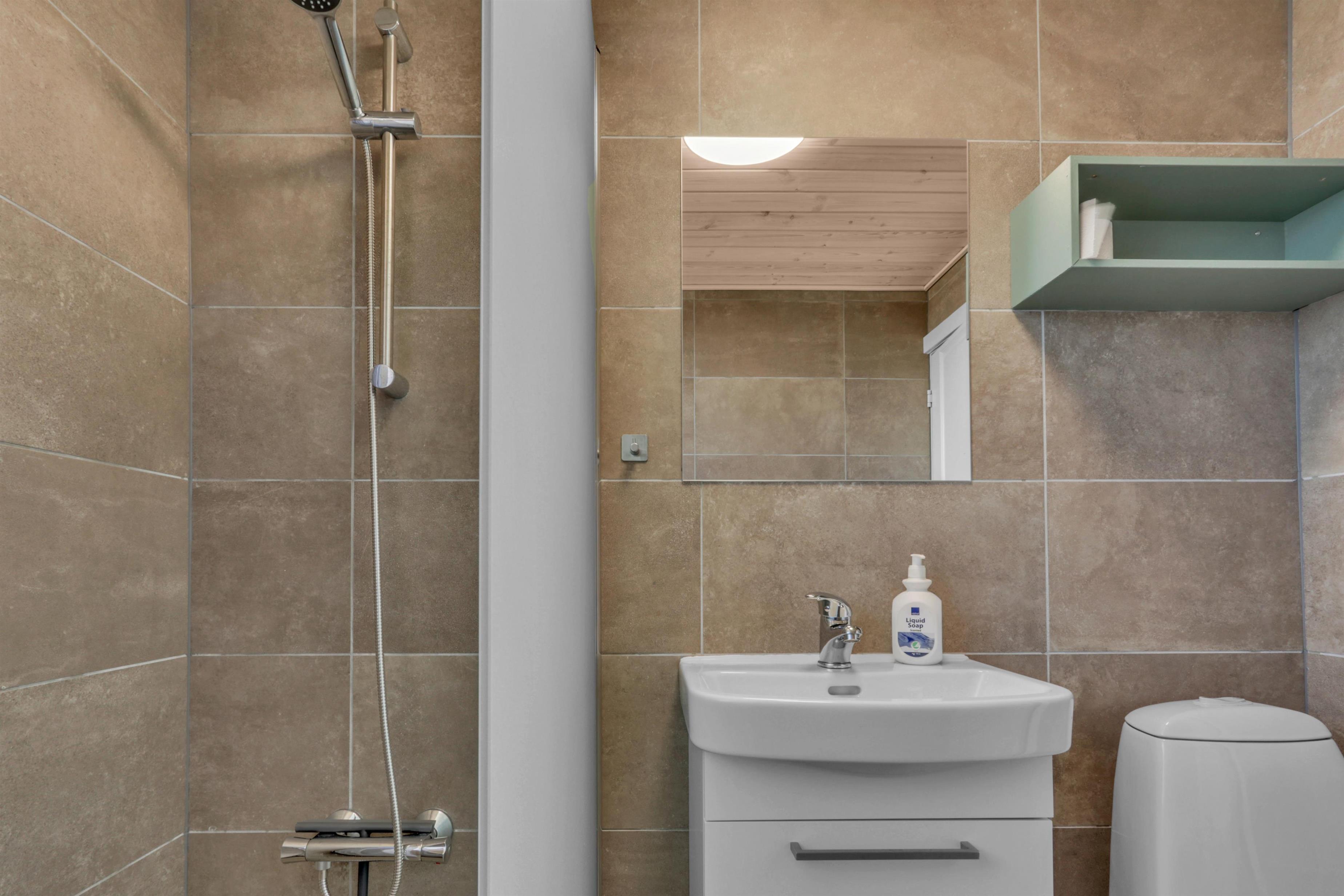 Das Badezimmer des Hauses wurde komplett renoviert und verfügt über moderne Ausstattung sowie Fußbodenheizung. Hier finden Sie eine Toilette, ein Waschbecken und eine Dusche.