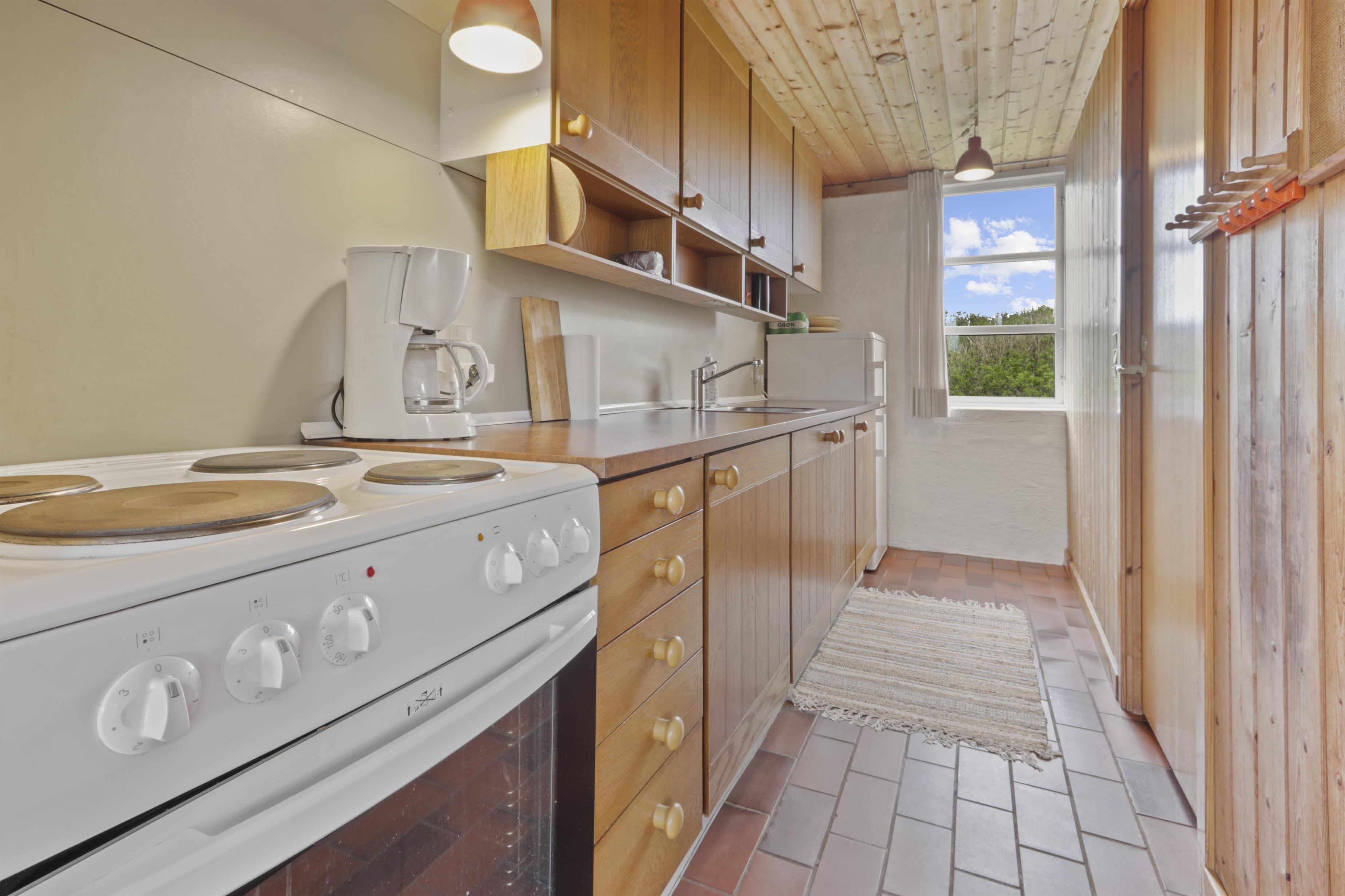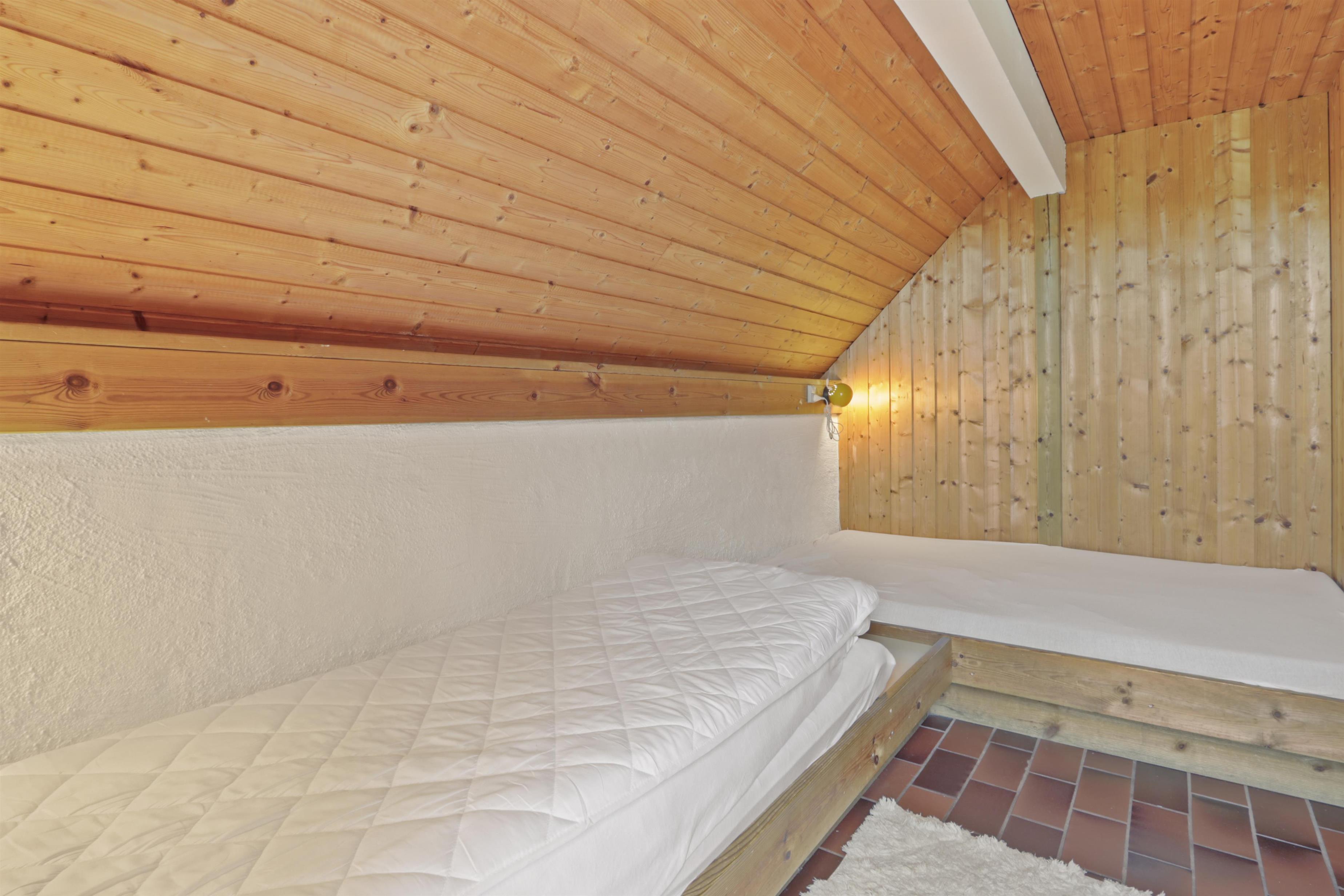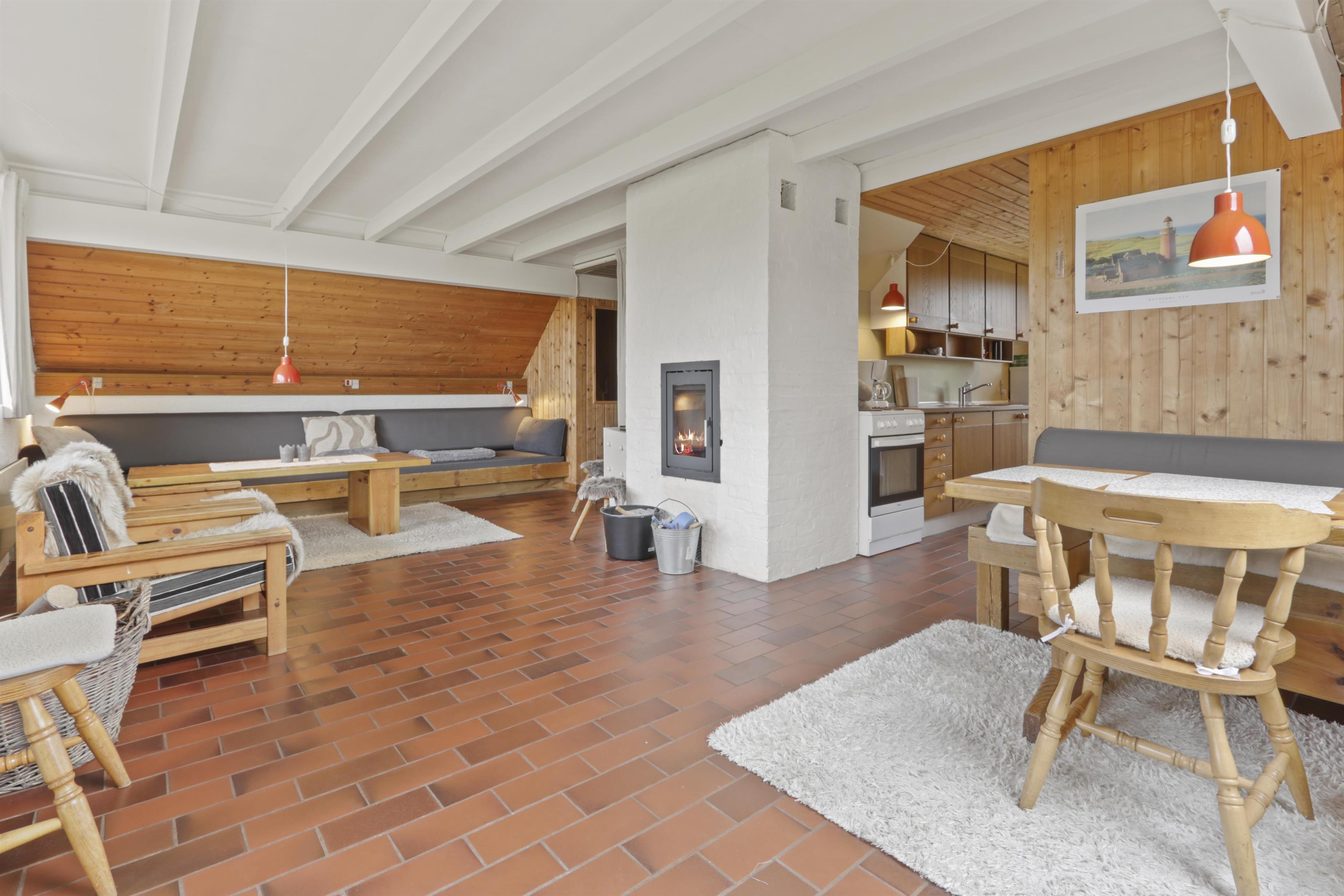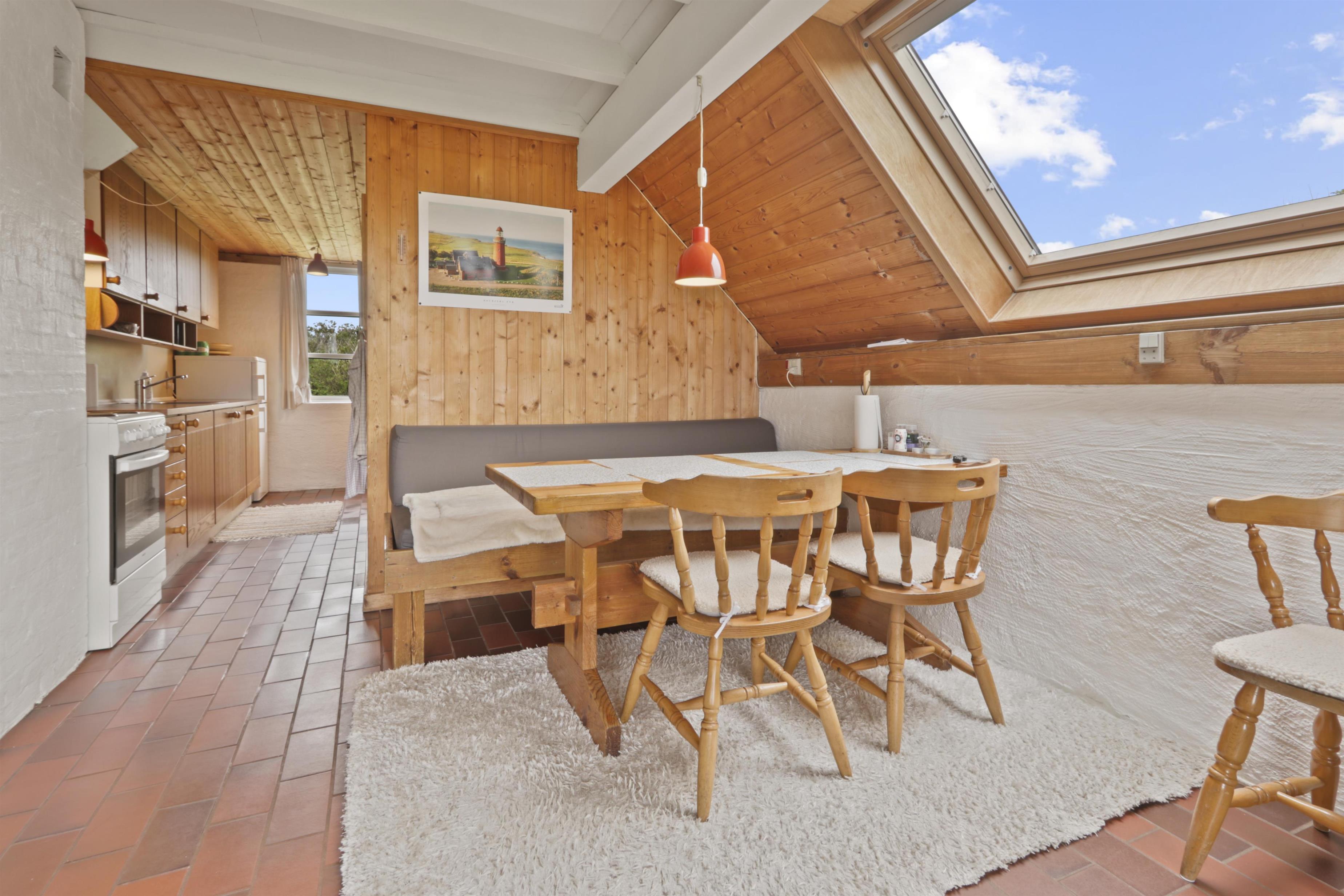 Rustikales Ferienhaus, 100 m² mit 2 Schlafräumen: 1DB + 4B. Im 1. Stock gibt es 2 offene Schlafräume mit 1 DB und 2B. Im Parterre gibt es eine Wohnraum mit 2E die über Eck stehen. Das Haus ist einfach eingerichtet mit Wohnraum mit Polstermöbeln, eine Feuerstätte, TV mit dänischen und deutschen Programmen. Einfache Küchenecke mit Herd mit 4 Kochplatten und Kühlschrank mit kleinem Eisfach. Badezimmer mit Toilette, Waschbecken und Dusche. Fliesenboden im Parterre mit Fussbodenheizung. 2 Haustiere erlaubt.