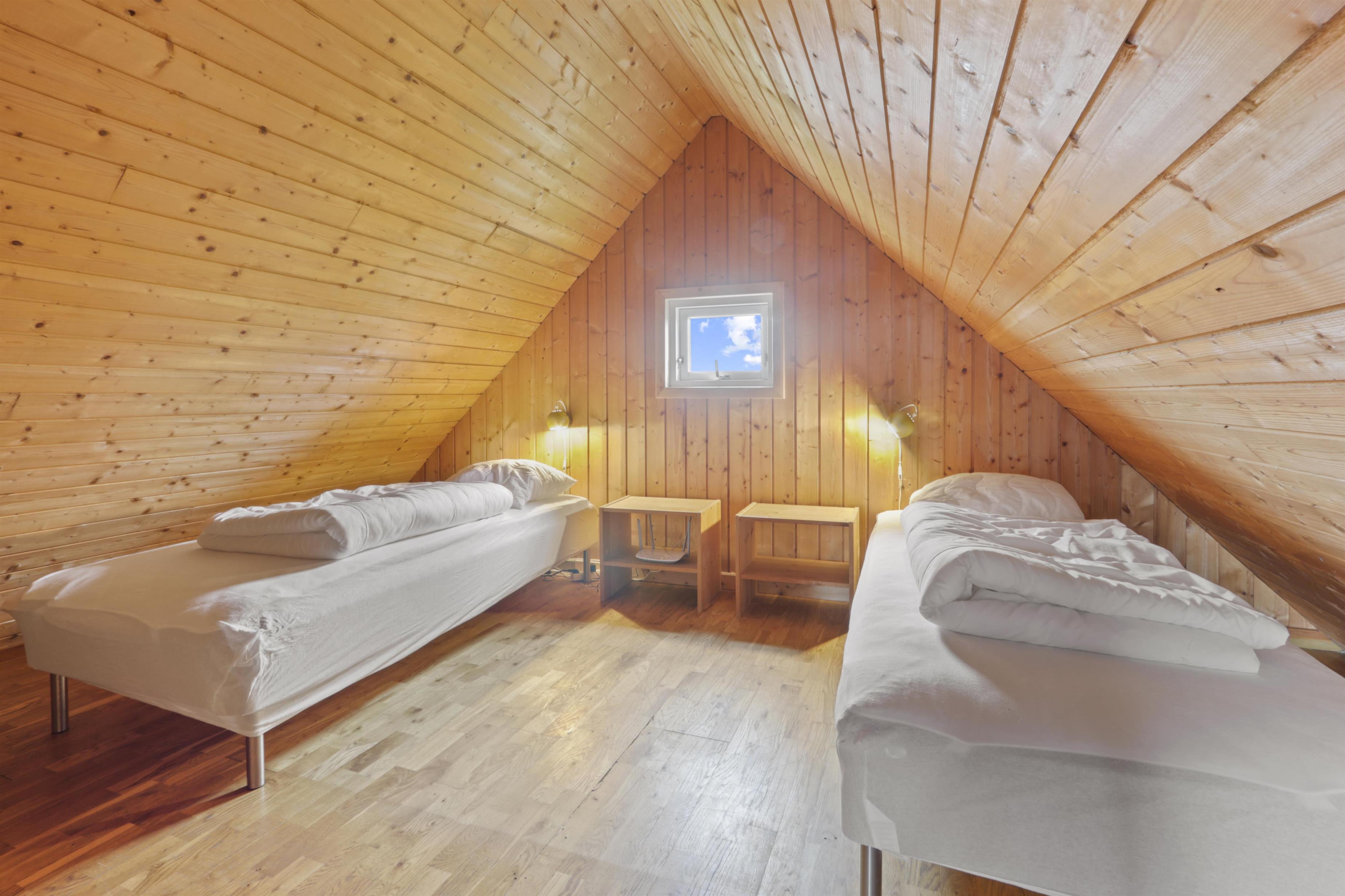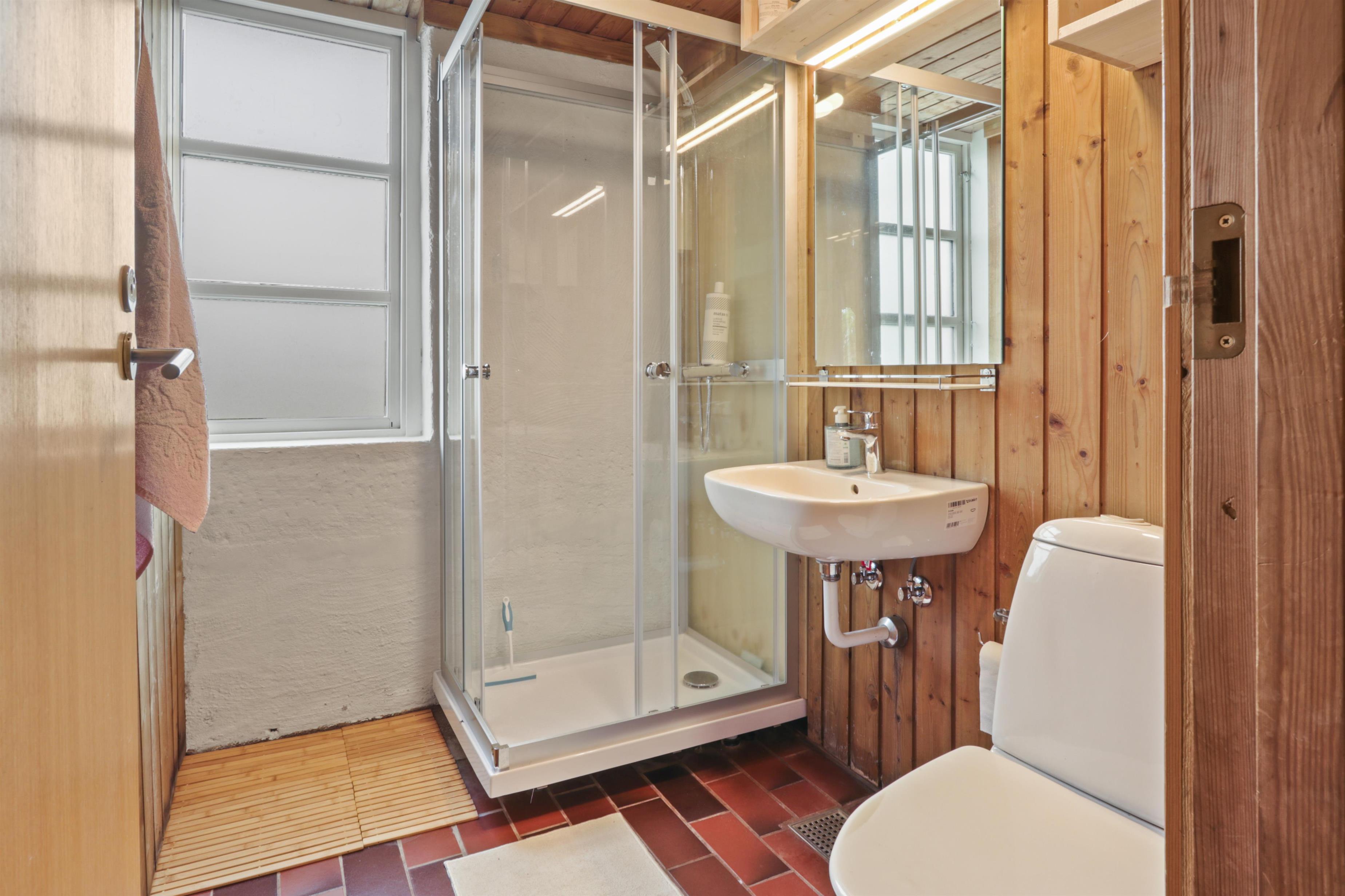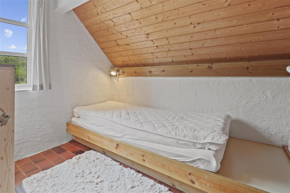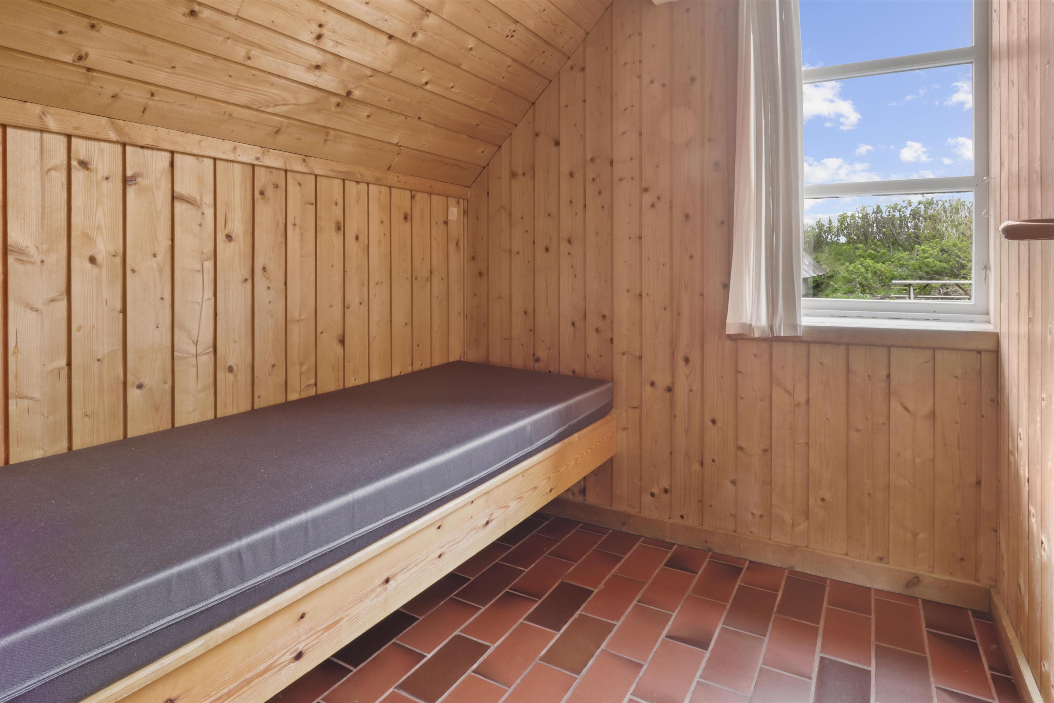 Rustikales Ferienhaus, 100 m² mit 2 Schlafräumen: 1DB + 4B. Im 1. Stock gibt es 2 offene Schlafräume mit 1 DB und 2B. Im Parterre gibt es eine Wohnraum mit 2E die über Eck stehen. Das Haus ist einfach eingerichtet mit Wohnraum mit Polstermöbeln, eine Feuerstätte, TV mit dänischen und deutschen Programmen. Einfache Küchenecke mit Herd mit 4 Kochplatten und Kühlschrank mit kleinem Eisfach. Badezimmer mit Toilette, Waschbecken und Dusche. Fliesenboden im Parterre mit Fussbodenheizung. 2 Haustiere erlaubt.