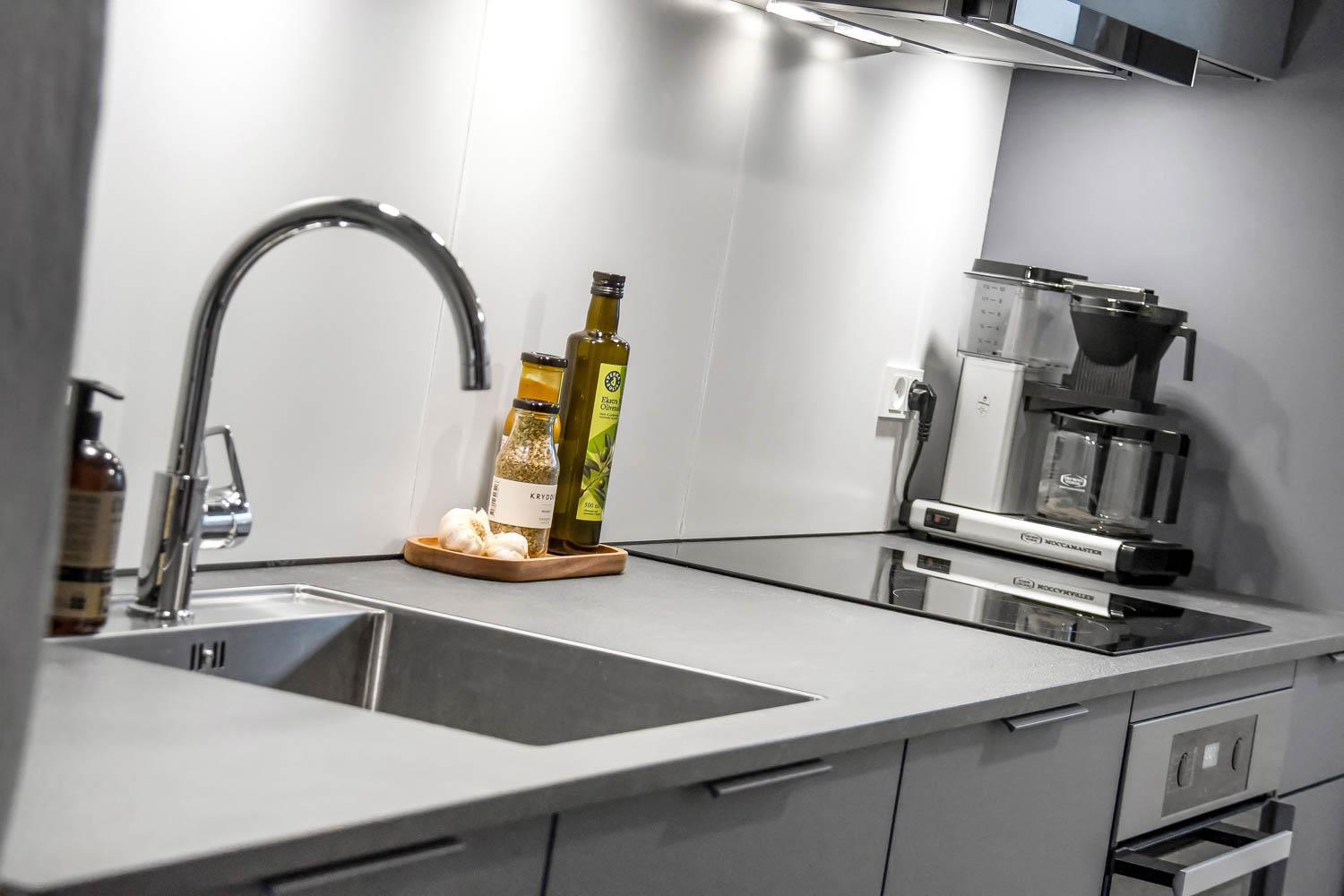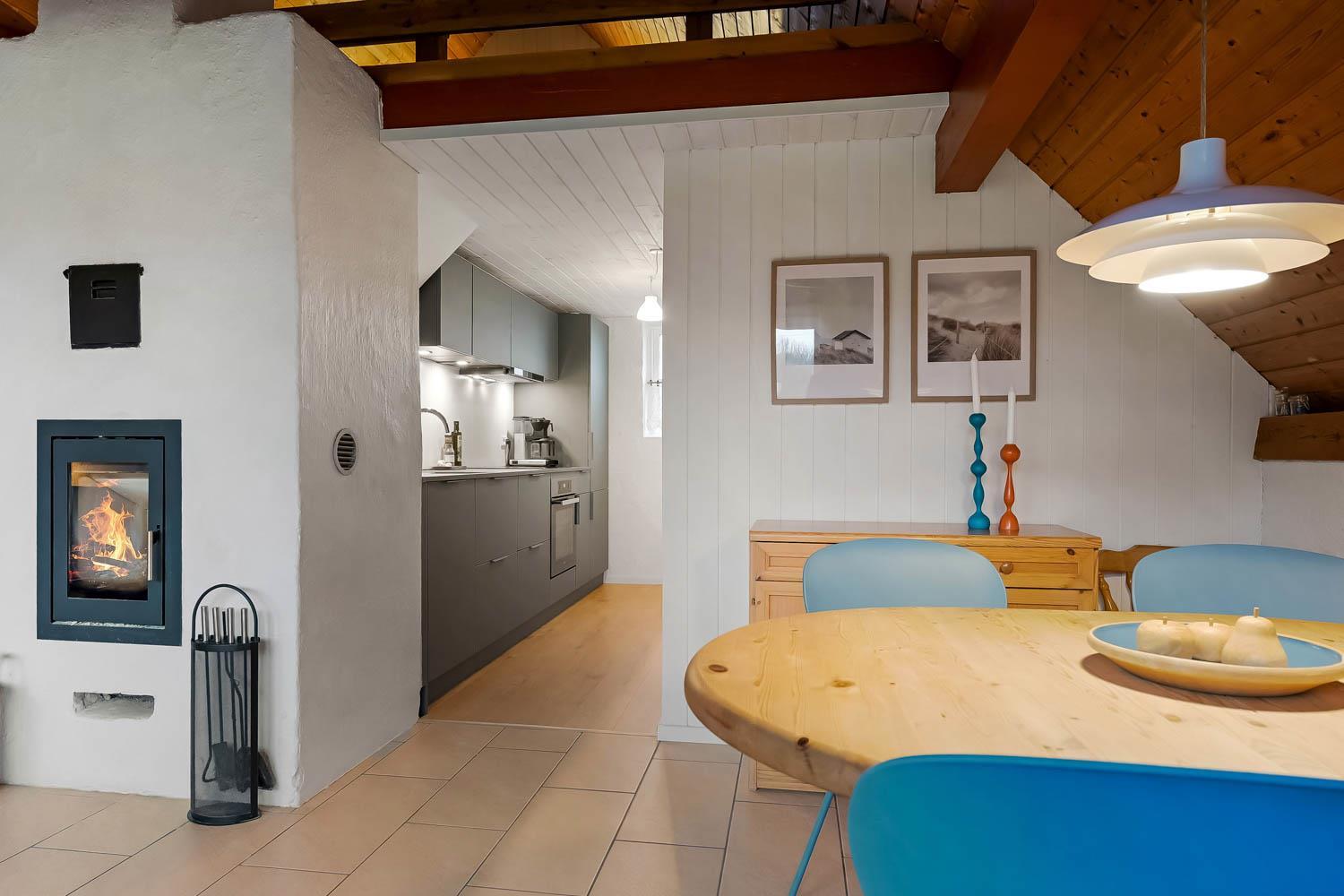 Die neu eingebaute Küche ist in gedeckten Blautönen gehalten und verfügt über die meisten modernen Annehmlichkeiten wie Kühl-/Gefrierschrank, Cerankochfeld, Backofen und Geschirrspüler. Für alle, die im Urlaub gerne kochen, bietet das Haus hervorragende Voraussetzungen.