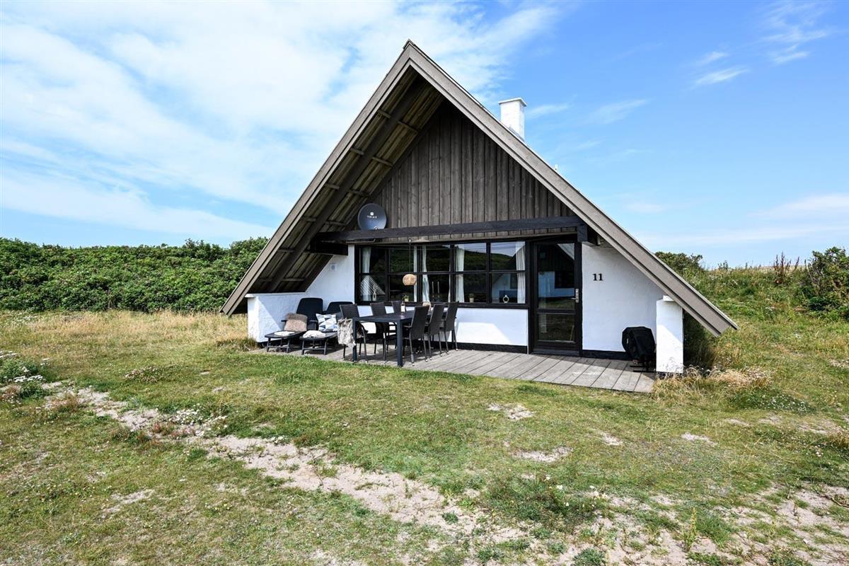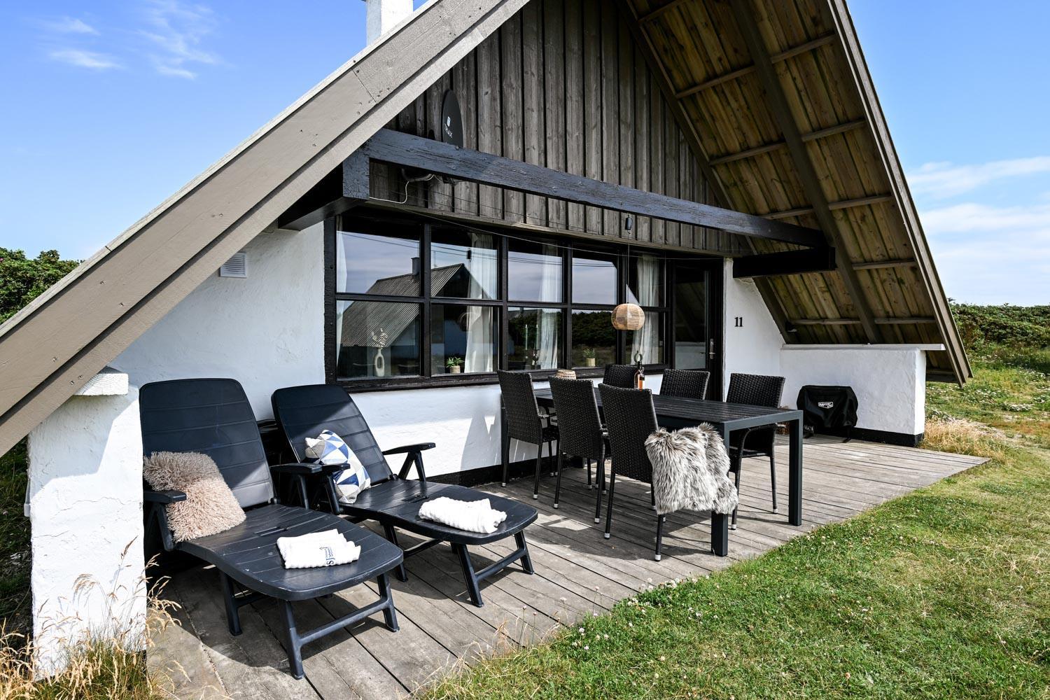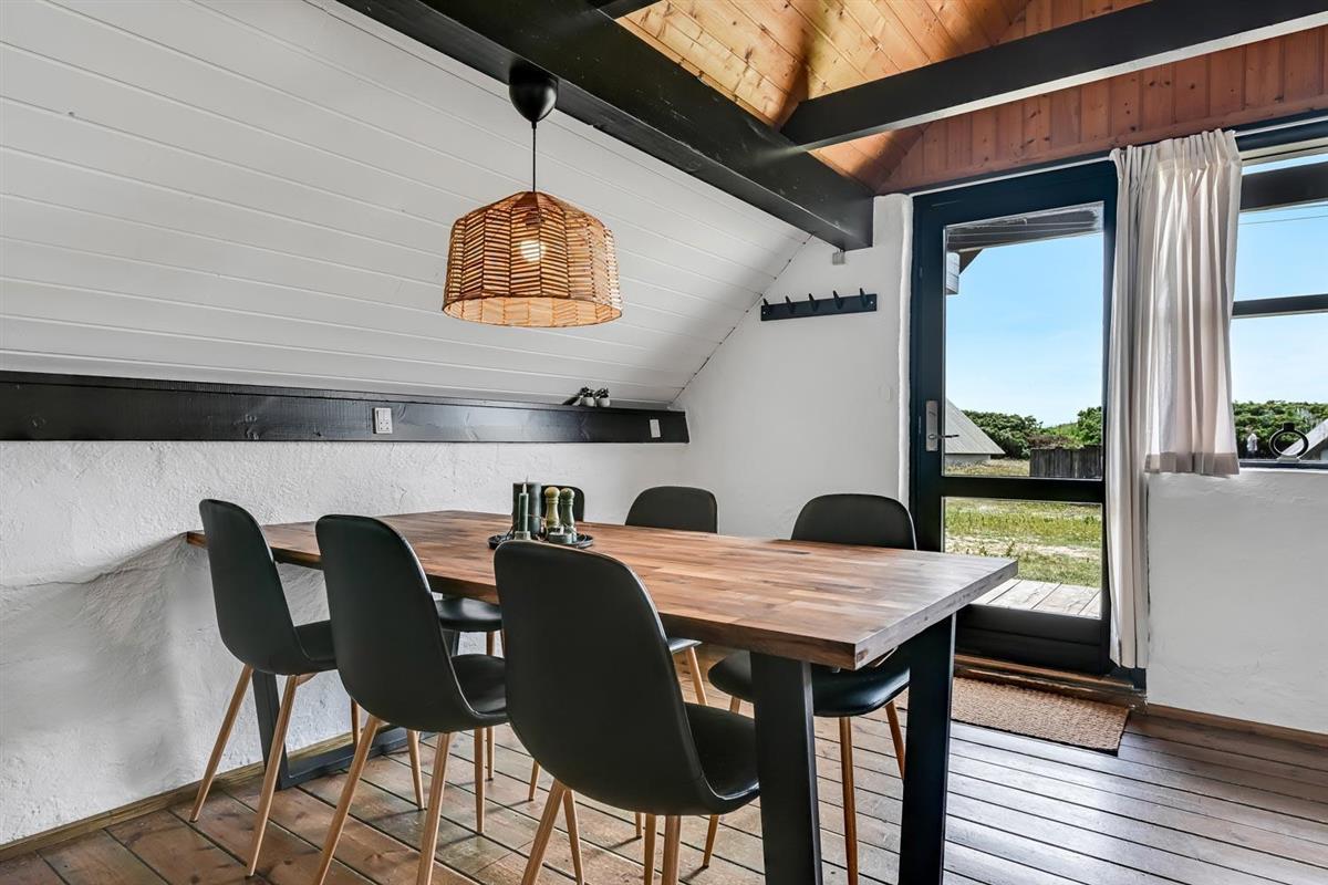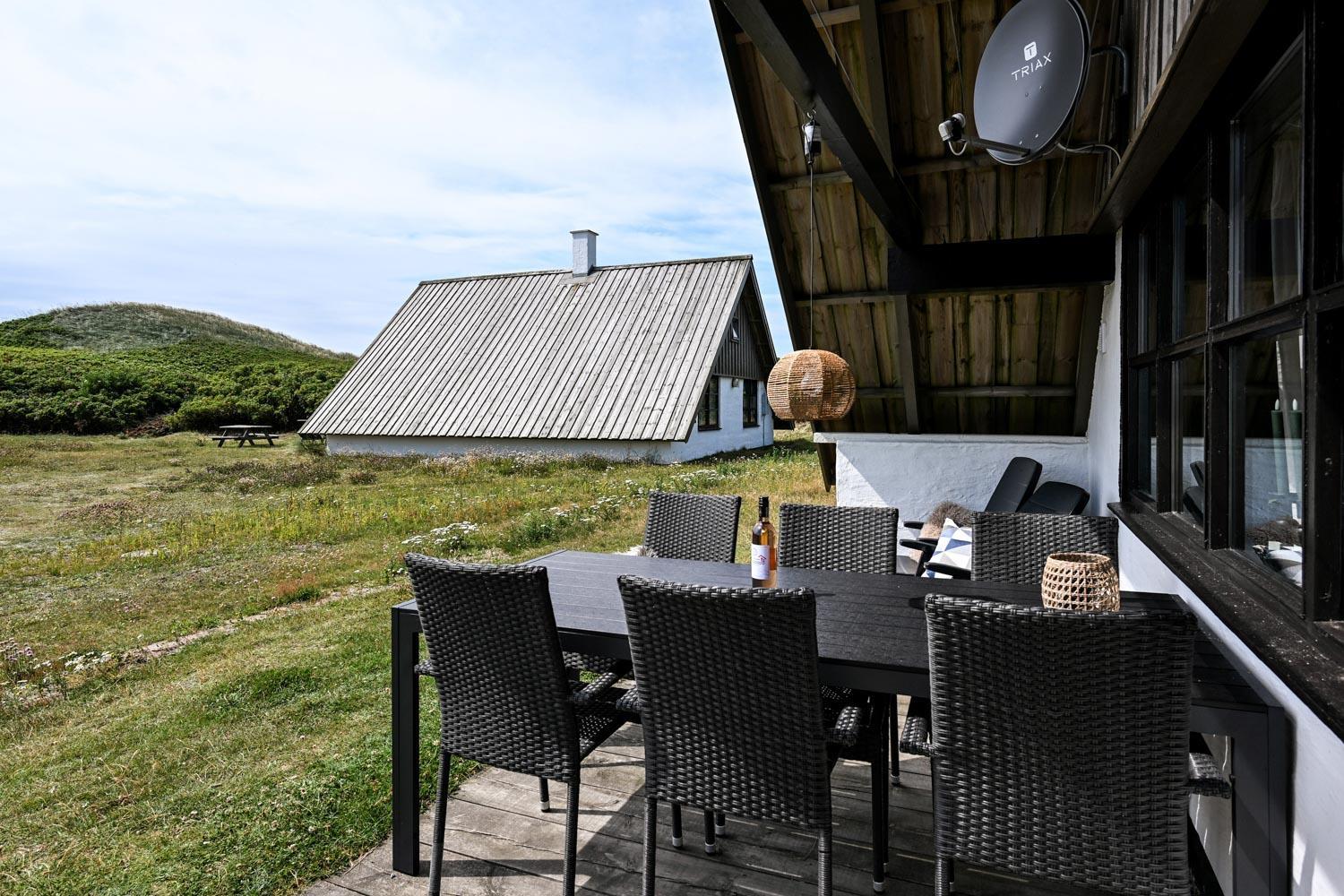 Vom Wohnraum ist ein Ausgang zur kleinen überdachten Terrasse mit Gartenmöbeln, 2 Sonnenliegen und einem Grill. Das Haus ist ein Teil von Fjaltring Ferieby , welches aus 25 ungefähr gleichen A-Häusern, die in 5 Zirkeln aufgeteilt sind. Die ganze Feriensiedlung liegt in einem schönen “Topf” im geschützen Dünenbereich, nur etwa 200 m von der Nordsee entfernt. Beim Gemeinschaftshaus ist Elektro-Auto-Auflader zur Verfügung. Geniessen Sie einen ökonomischen Urlaub in einem ganz einfachen Haus in einer einmaligen Lage. Parken Sie das Auto und Sie können den Urlaub geniessen. Den Strand erreichen Sie unter 5 Minuten zu Fuss. Erleben Sie die tosende Nordsee, die jeden Tag ganz neue Erlebnisse anbietet. Laufen Sie am Strand entlang , oder erkunden Sie die vielen anderen Möglichkeiten der Gegend.