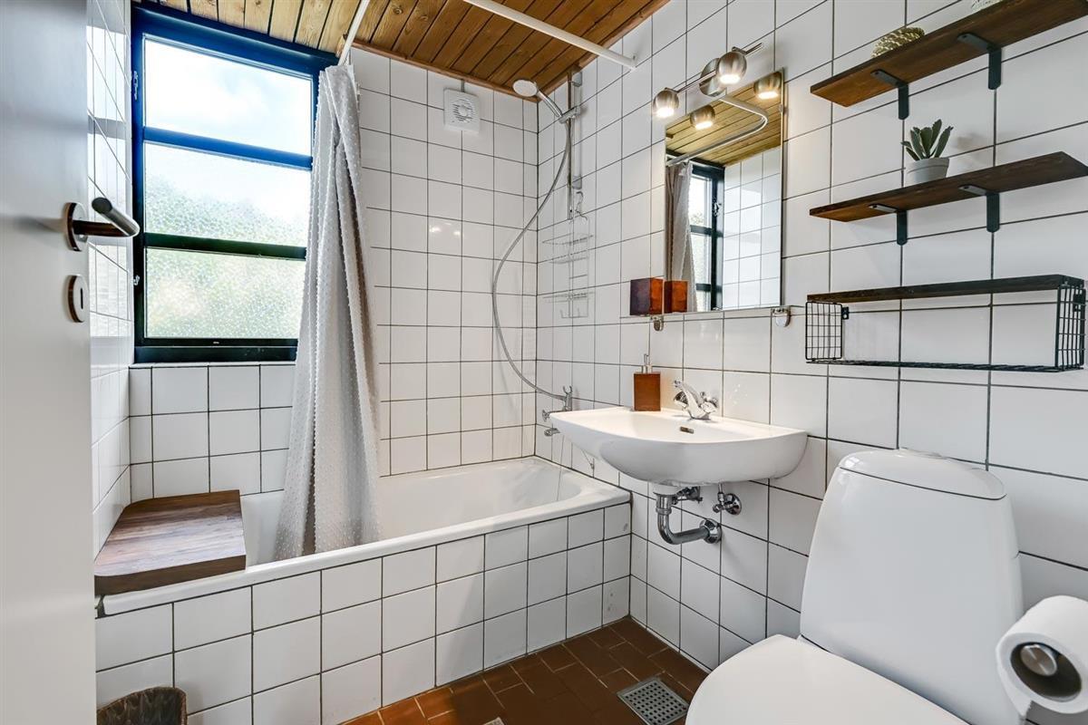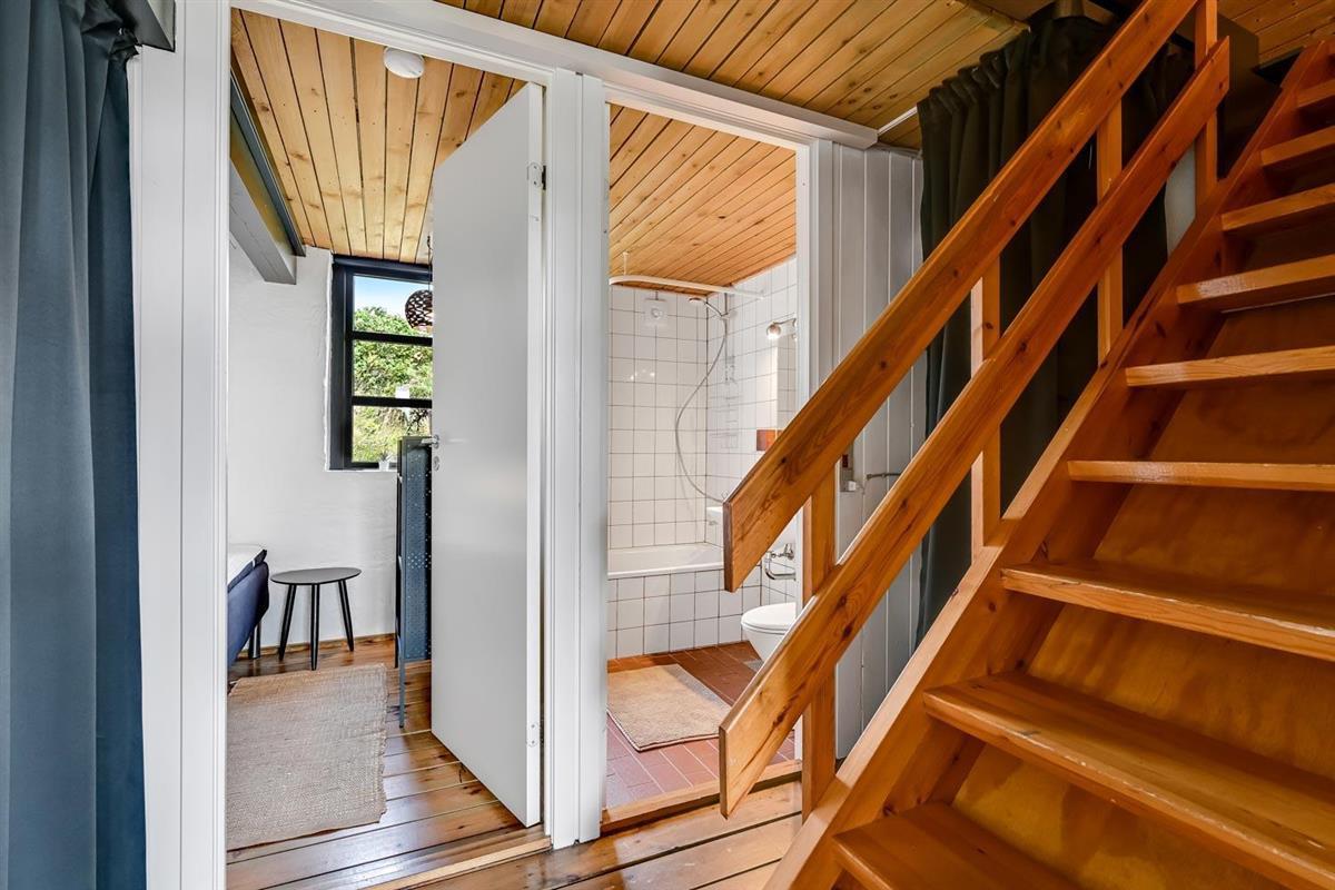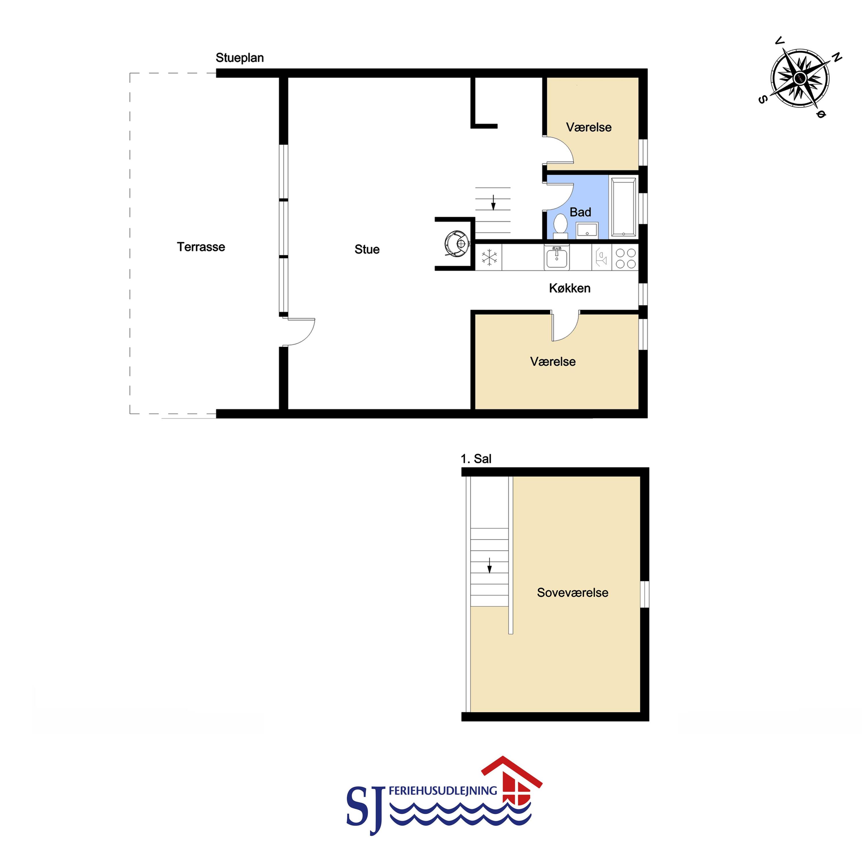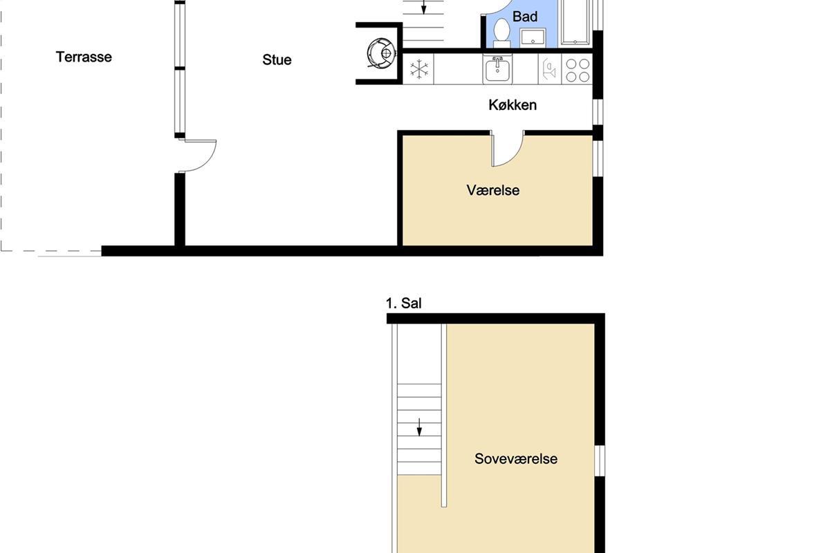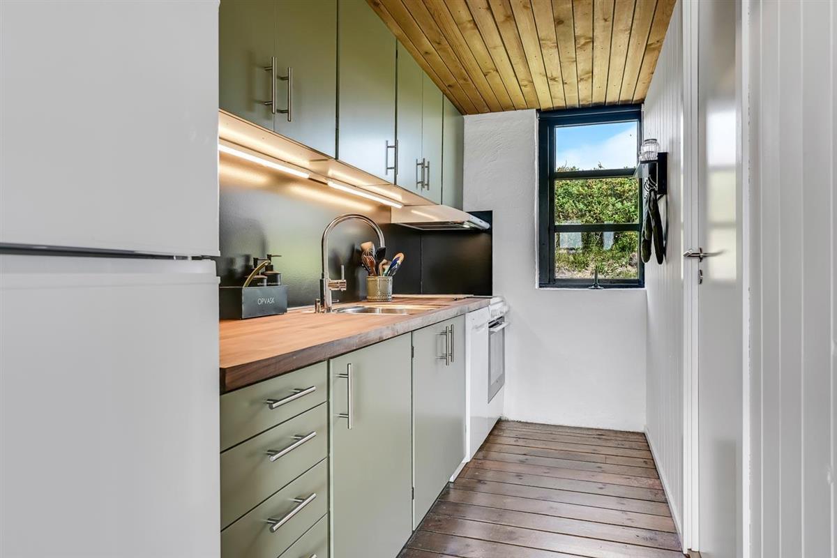Rustikales Ferienhaus, 90 m2 mit 2 Schlafräumen: 5B. Schlafraum im 1. Stock mit 2B. 2 Einzellbetten über Eck im Raum im Erdgeschoss und 1 Einzelbett im Wohnraum. Das Haus ist sehr einfach eingerichtet; ein Wohnraum mit Polstermöbeln, TV mit dänischen und deutschen Programmen und einer Feuerstätte. Einfache Küchenecke mit E-Herd mit 4 Kochplatten und ein Kühlschrank mit kleinem Gefrierfach. Badezimmer mit Toilette, Dusche und Waschbecken. 2 Haustiere erlaubt. Nichtraucher-haus