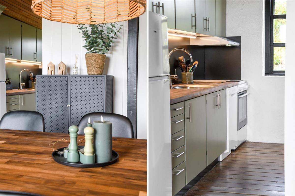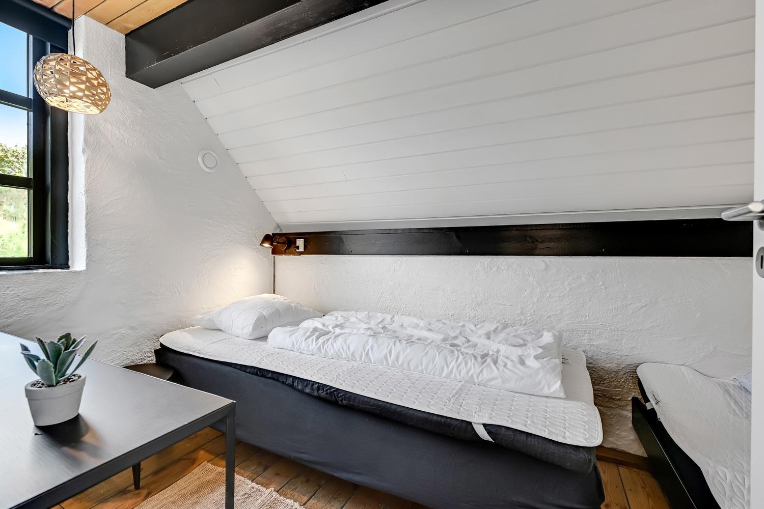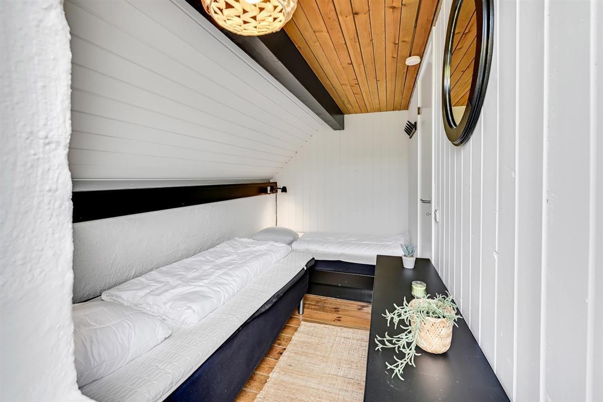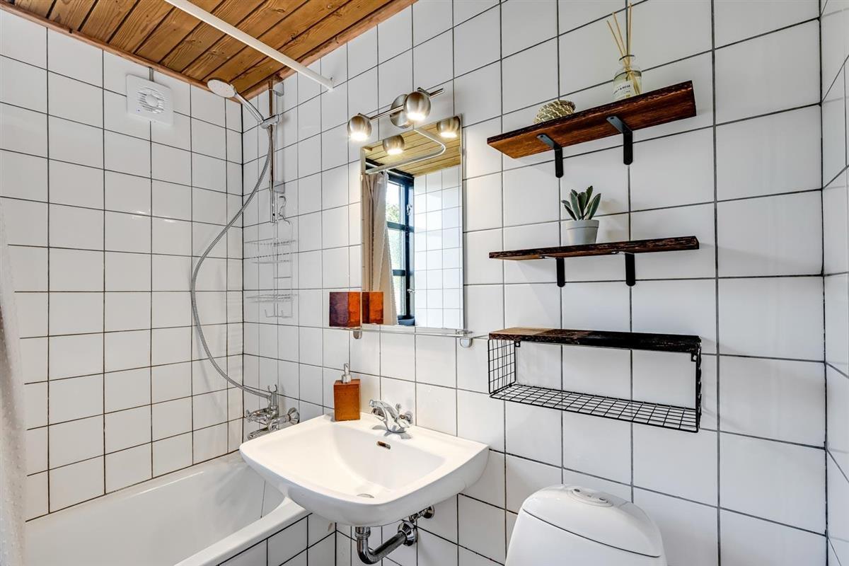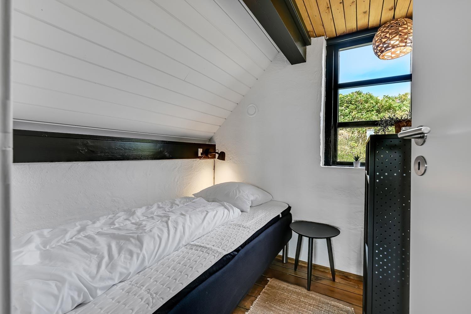 Rustikales Ferienhaus, 90 m2 mit 2 Schlafräumen: 5B. Schlafraum im 1. Stock mit 2B. 2 Einzellbetten über Eck im Raum im Erdgeschoss und 1 Einzelbett im Wohnraum. Das Haus ist sehr einfach eingerichtet; ein Wohnraum mit Polstermöbeln, TV mit dänischen und deutschen Programmen und einer Feuerstätte. Einfache Küchenecke mit E-Herd mit 4 Kochplatten und ein Kühlschrank mit kleinem Gefrierfach. Badezimmer mit Toilette, Dusche und Waschbecken. 2 Haustiere erlaubt. Nichtraucher-haus