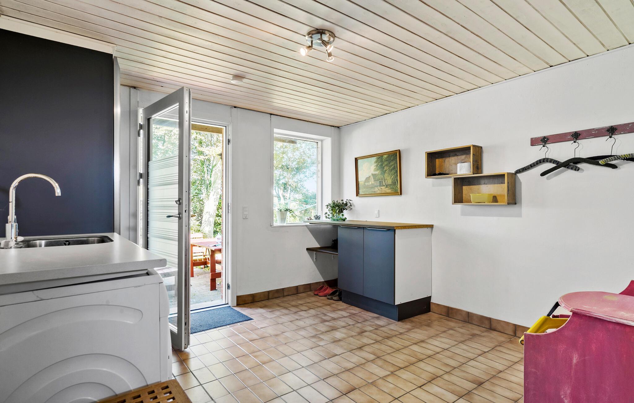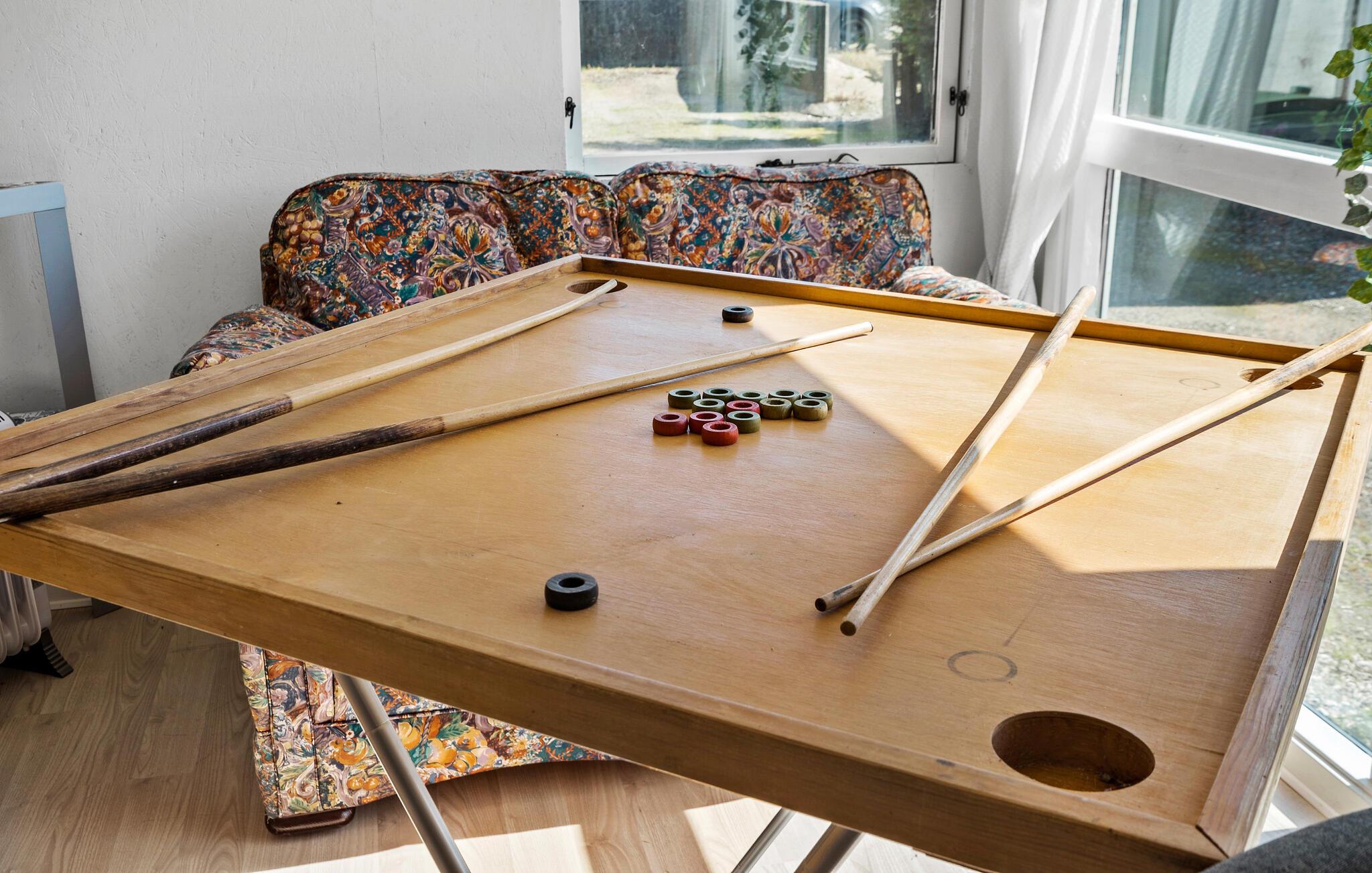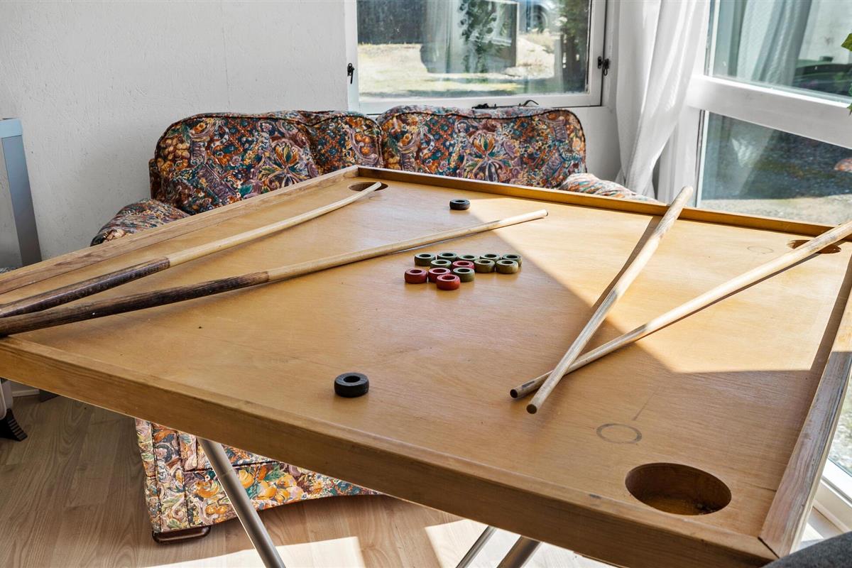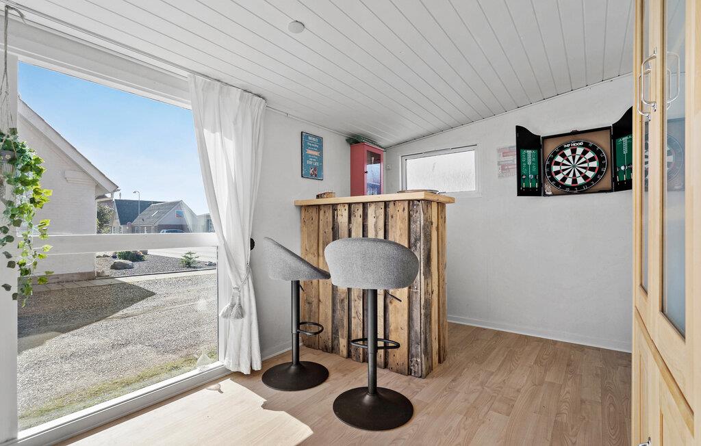 In je vakantiehuis in Bøvlingbjerg vind je een stijlvol ingerichte woonkamer met een comfortabele bank en een rustiek houten ontwerp en bakstenen elementen die een echte feel-good sfeer creëren. Gebruik de gezellige ruimte om een goed boek te lezen of leuke bordspellen te spelen. In de moderne eethoek kun je samen eten. Voor entertainment is er een aparte ruimte met een dartbord en een kleine bar waar je 's avonds een toernooitje kunt spelen.