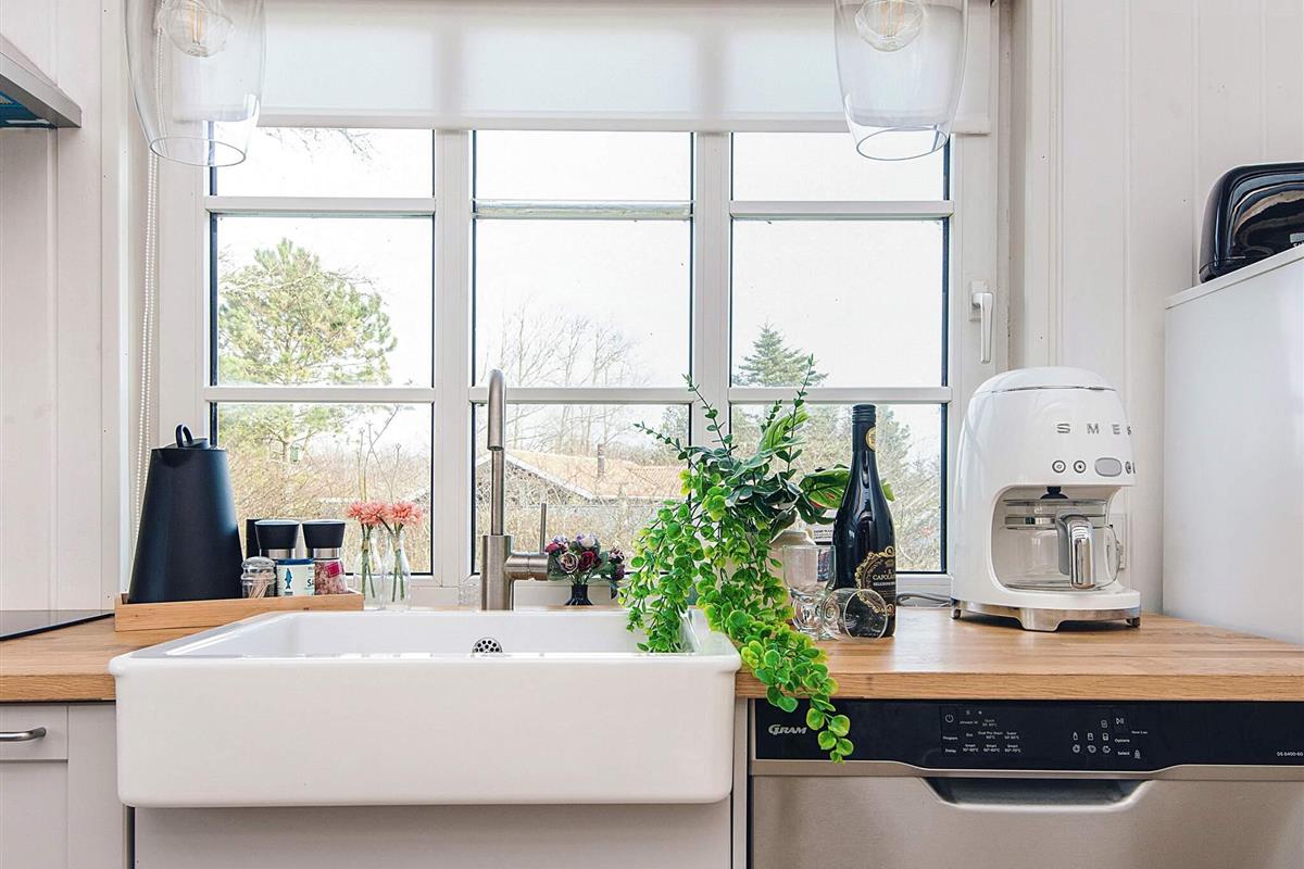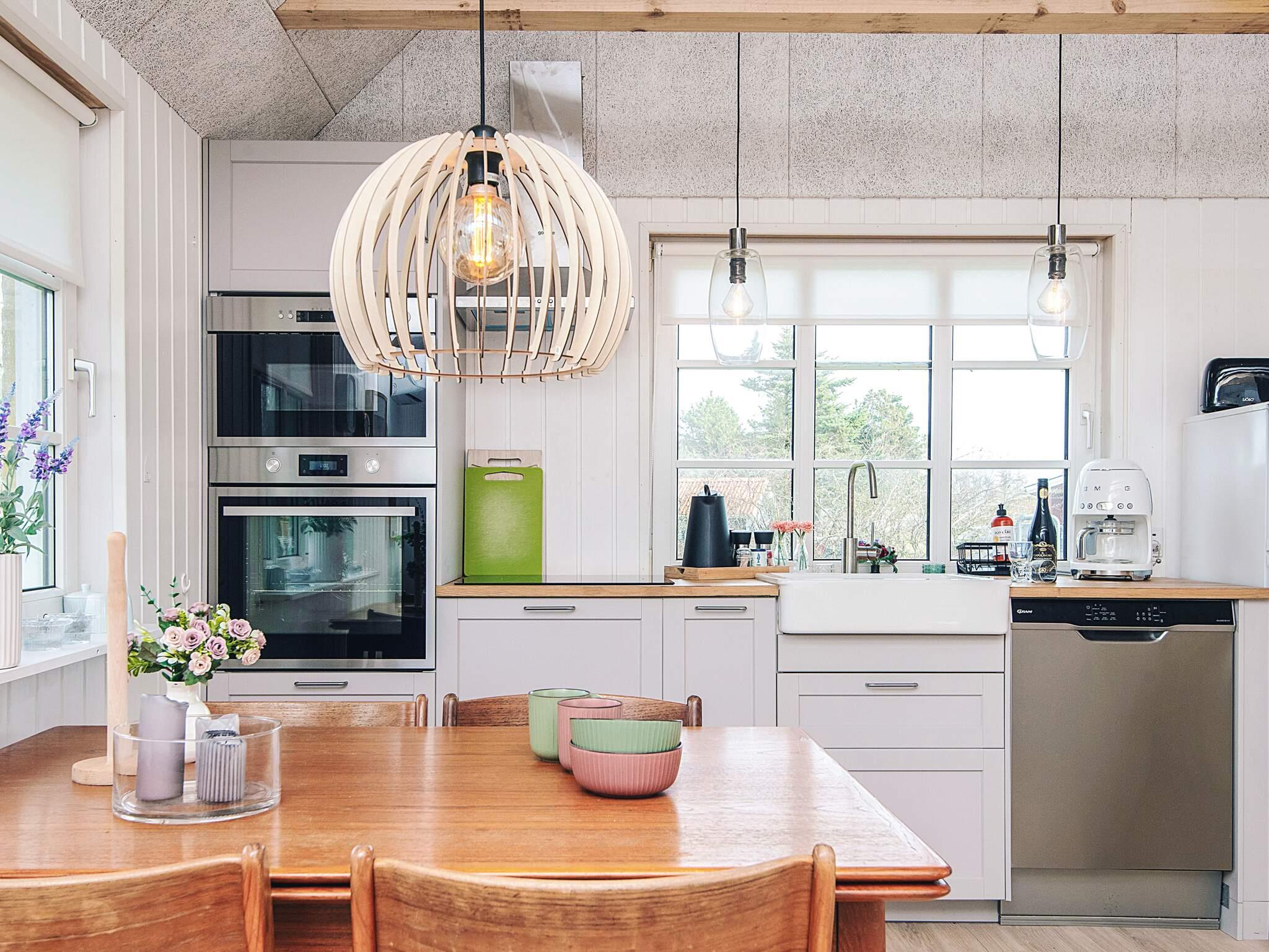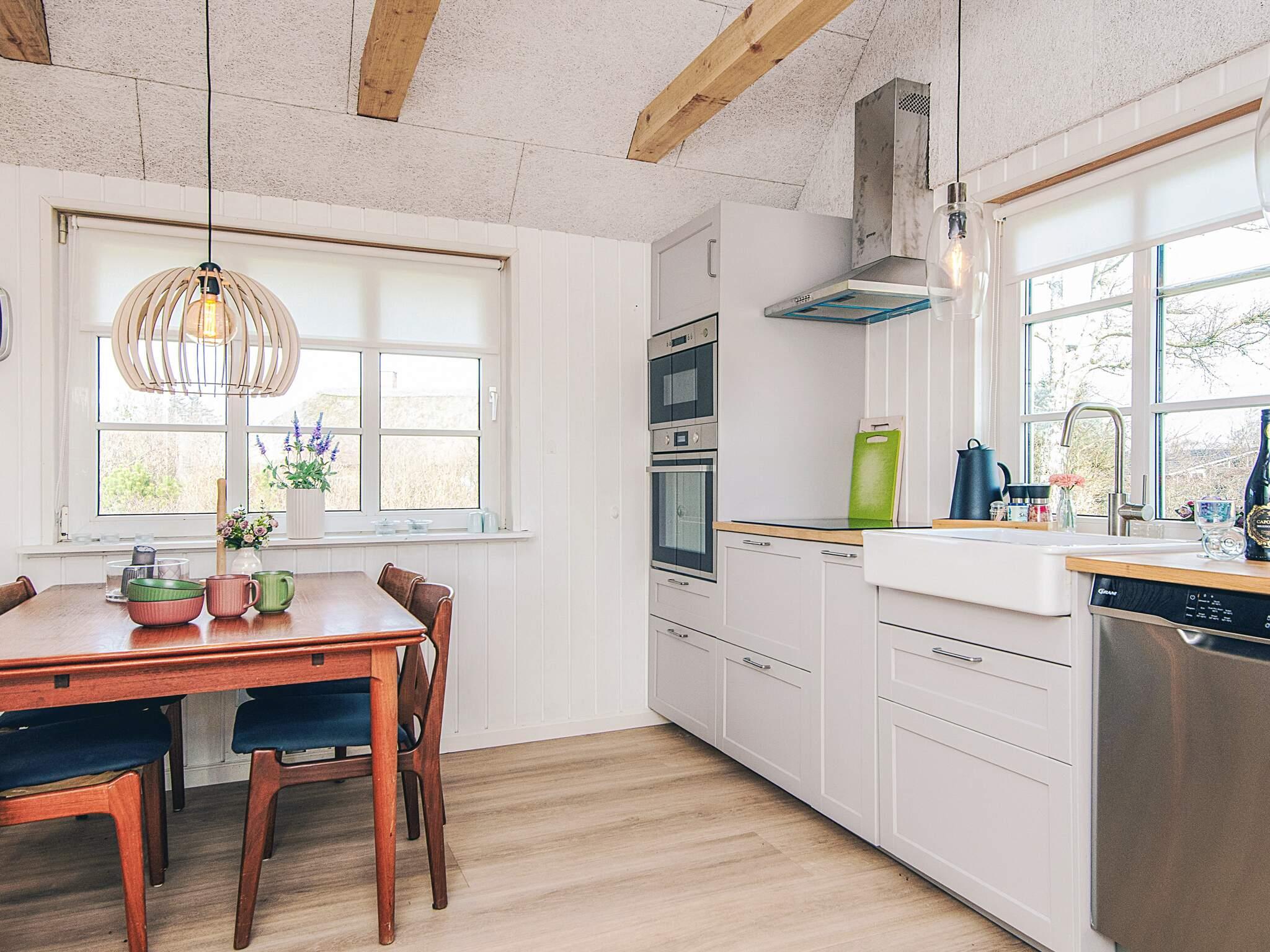 Innen wurde es gemütlich und mit persönlicher Note eingerichetet, inklusive vieler kleiner Details. Die gut ausgestattete Küche ist offen in den kombinierten Wohn- und Essbereich integriert, wo Sie an kühleren Abenden ein Feuer im Holzofen anzünden können. Neben einigen deutschen TV-Sendern und WLAN zum Surfen ist das Häuschen zudem mit einer energieeffizienten Wärmepumpe ausgestattet, die das ganze Haus erwärmen kann. Von einem kleinen Verbindungsflur aus haben Sie Zugang zum Badezimmer des Hauses mit Dusche sowie angenehmer Fußbodenheizung, Waschmaschine und Wäschetrockner. Vom Wohnzimmer aus haben Sie Zugang zu beiden Schlafzimmern des Hauses: eines mit Doppelbett, das andere mit zwei Einzelbetten.