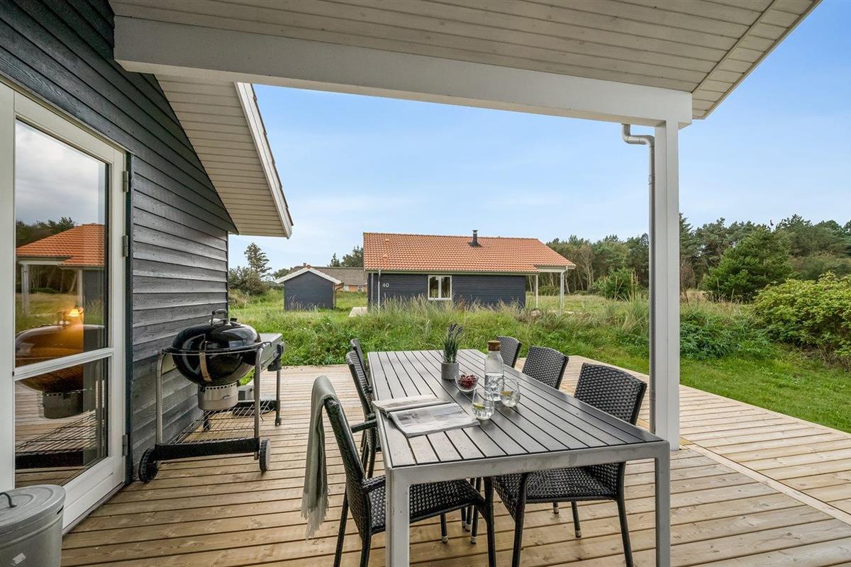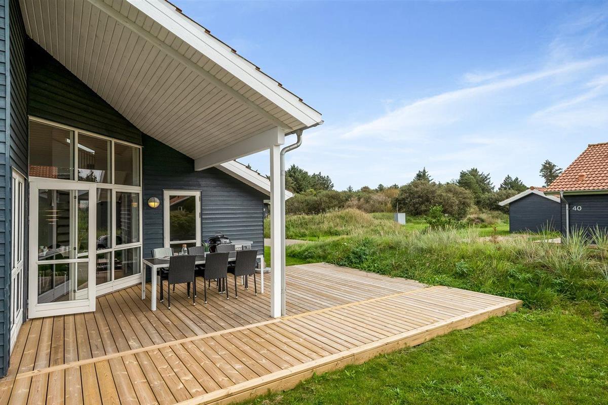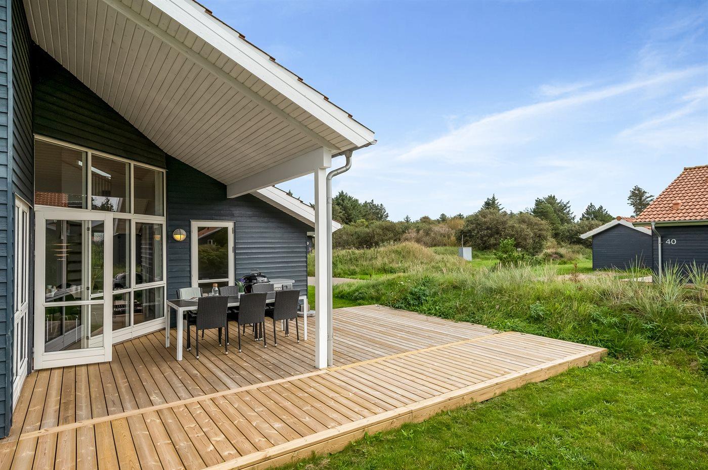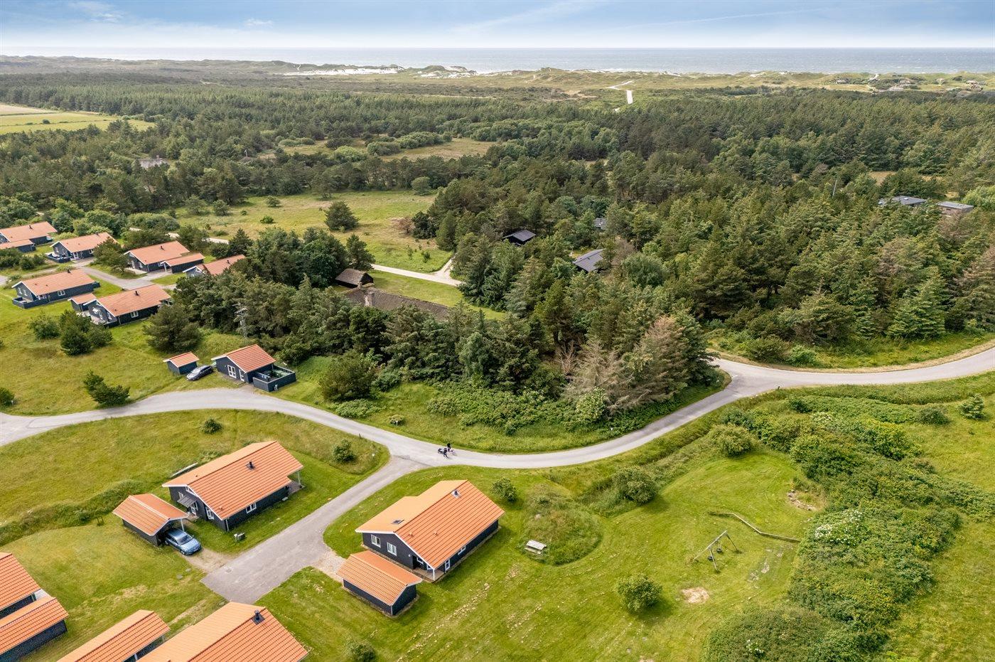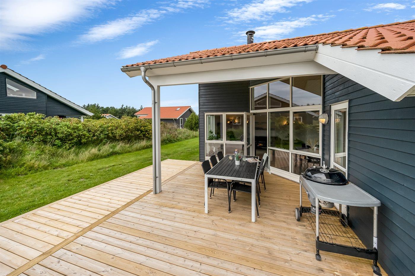 De vakantiewoning is gelegen op een 400 m² groot natuural grond. Afstand tot de zee 800 m. Afstand tot de fjord 1000 m. Dichtstbijzijnde winkel 3000 m. Er is een golfbaan op een afstand van 20000 m. Bij de vakantiewoning hoort terras. Daarnaast is er een overdekt terras. Afstand tot speelplaats 150 m. Barbecue. Carport ter beschikking. Parkeerplaats bij het huis.