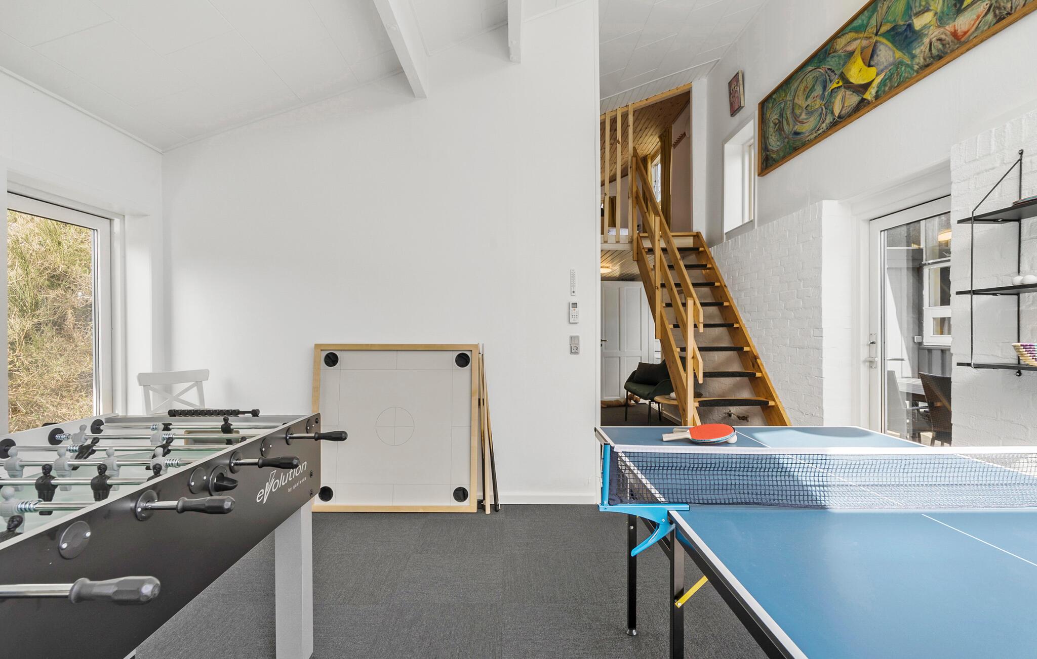 Omgeven door een bos, is dit huis de ideale plek om je terug te trekken uit het dagelijks leven. De liefdevol ingerichte, lichtovergoten woonkamer nodigt je uit om ontspannende uren door te brengen met kletsen, tv kijken of kaarten. Als je zin hebt in wat sportieve activiteiten, speel dan een potje tafeltennis of organiseer een kleine tafelvoetbalcompetitie.
