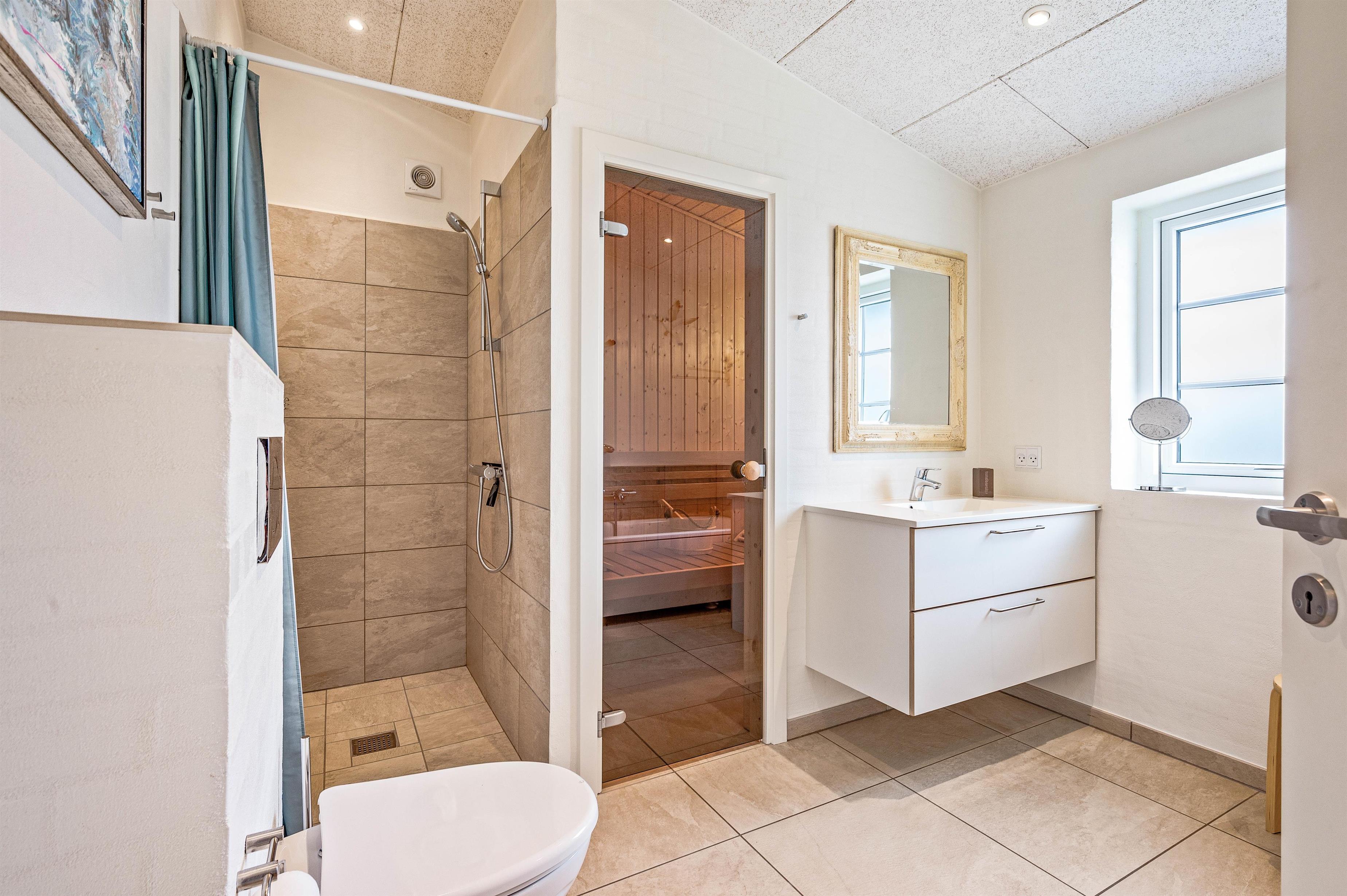 After a long day of adventures, you can retire to one of three bedrooms to recharge. Two bedrooms feature double beds, while the third offers twin beds. Perfect for families or friends, the holiday home's two bathrooms ensure no morning queues. One bathroom houses the private sauna and a large bathtub, providing soothing warmth and relaxation.