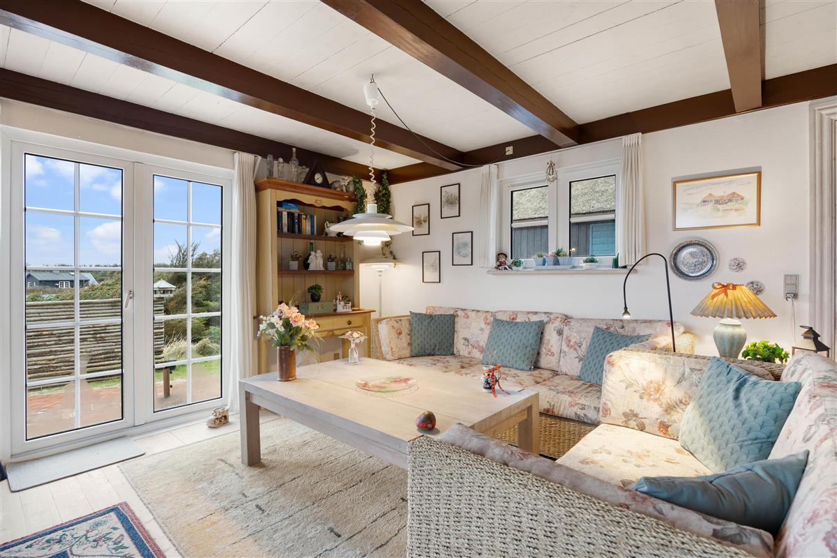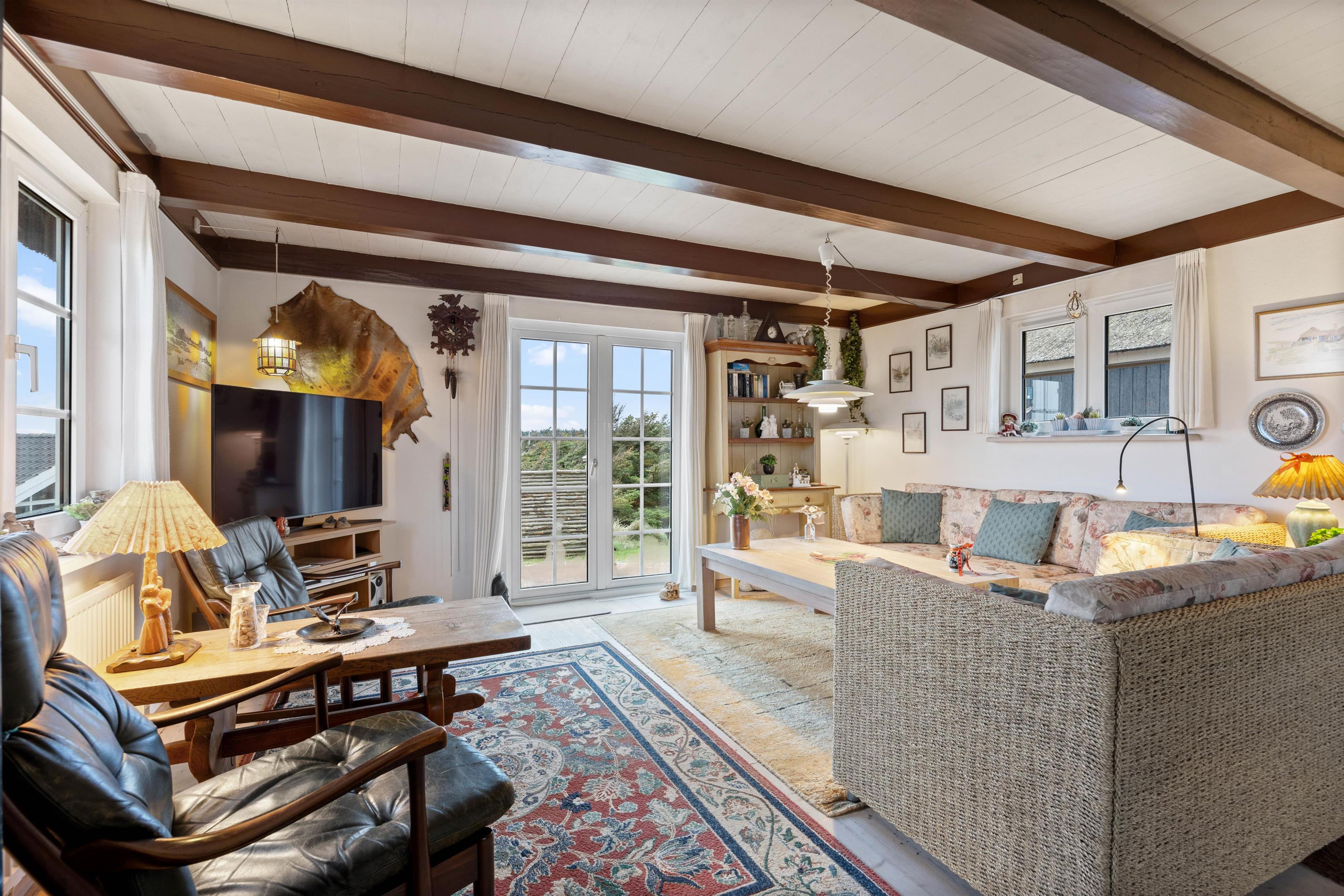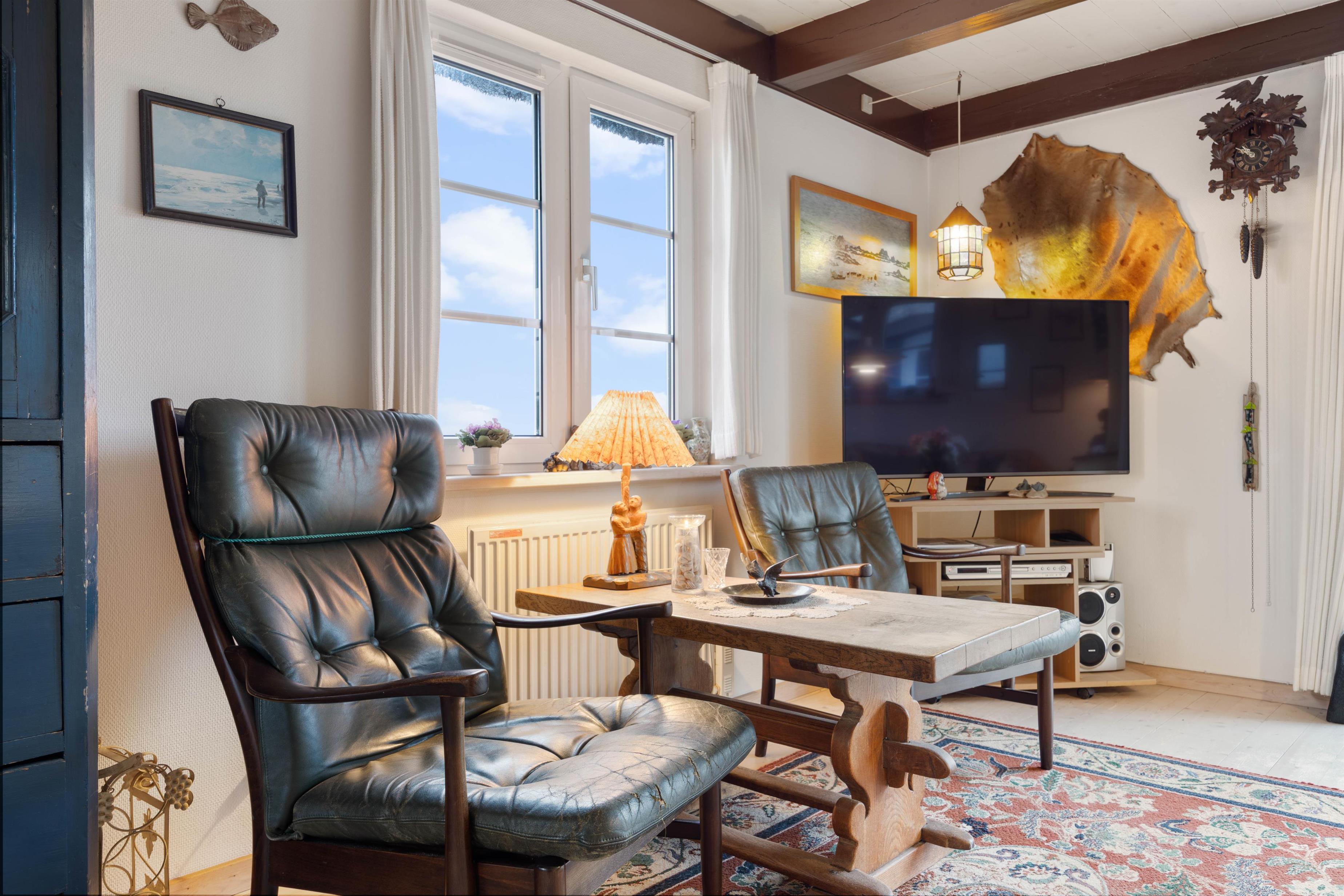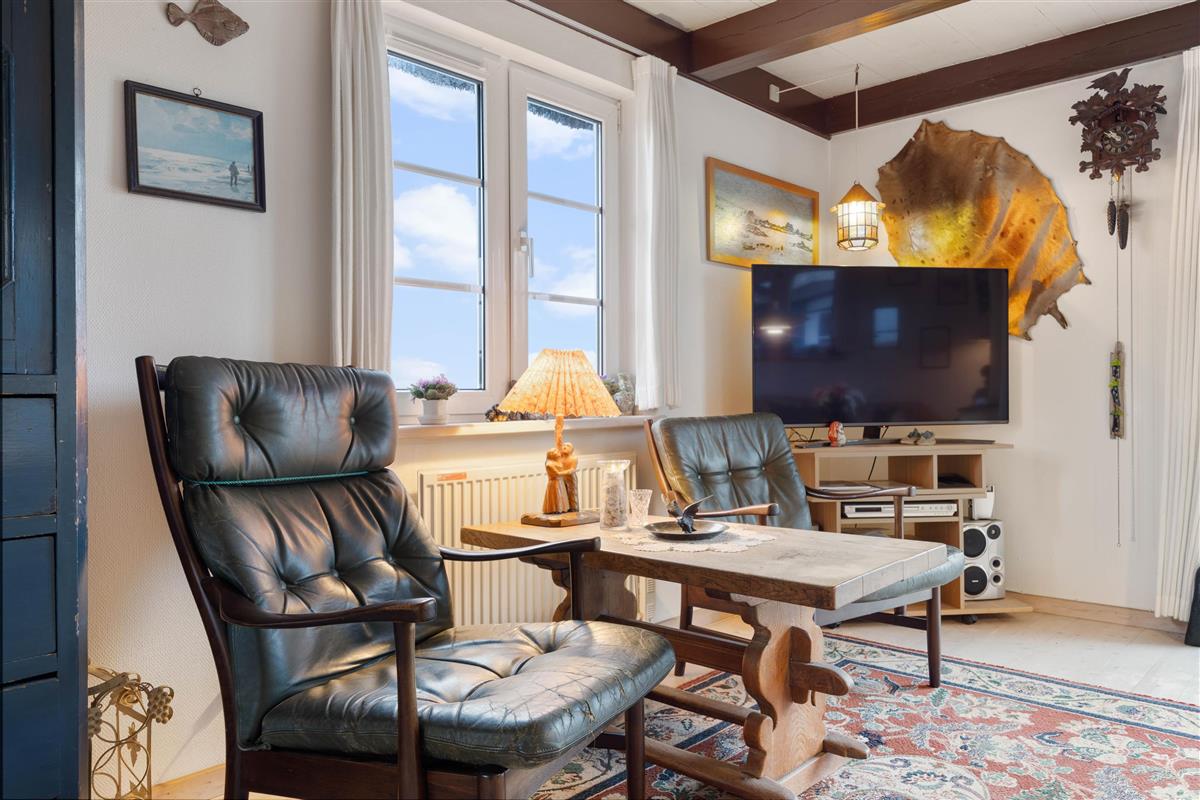 Upon entering the holiday home, you'll be greeted by the classic holiday cottage atmosphere. With its white wooden ceiling and darker wooden beams, the holiday home radiates cosiness, making you feel at home from the moment you arrive. The heart of the house is the living room with its dining area. Here you can enjoy meals together, plan your holiday activities, or relax watching a film on the flat-screen TV. The atmosphere becomes particularly cosy when you light the wood-burning stove in the living room and listen to the crackling flames while enjoying its welcoming warmth.