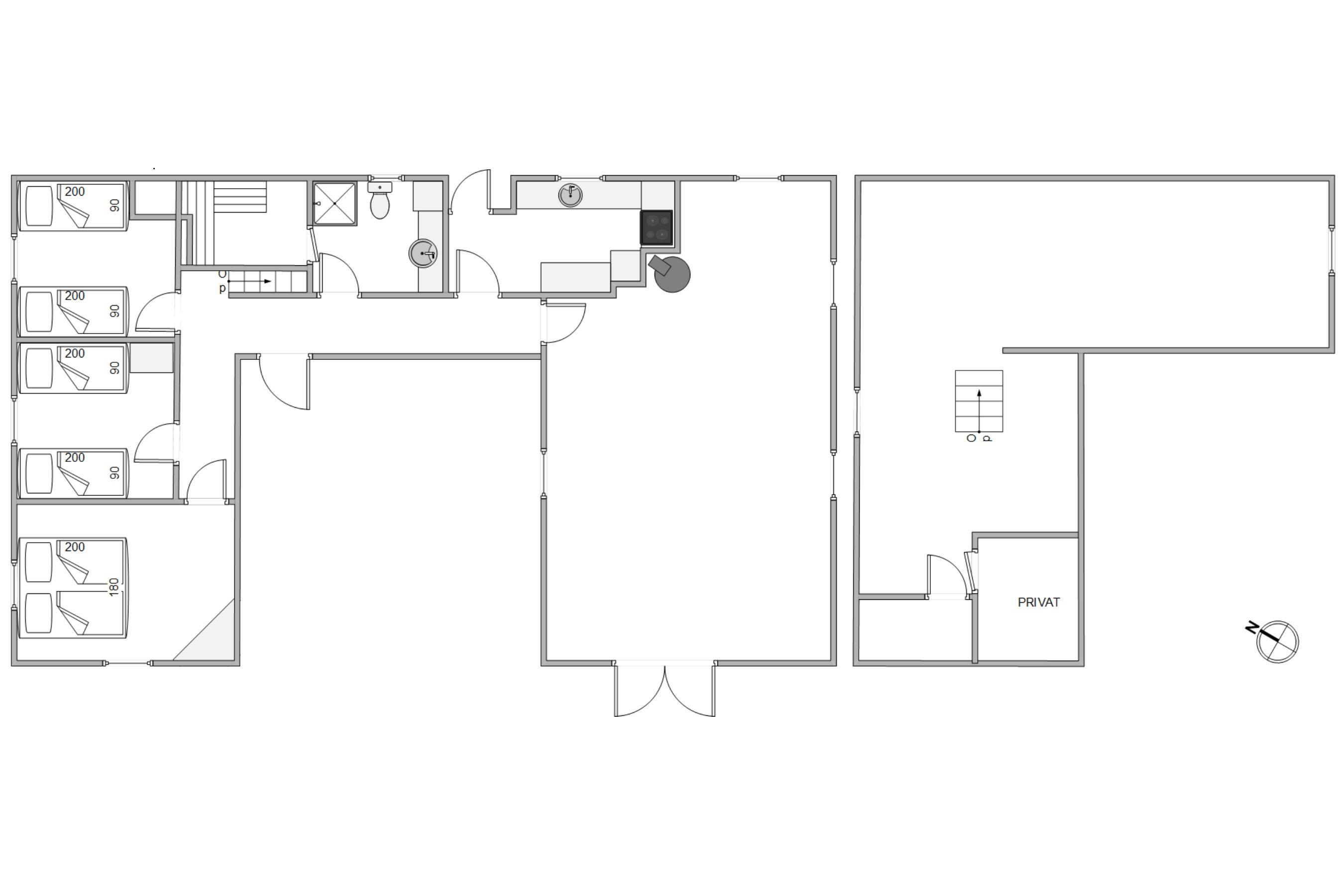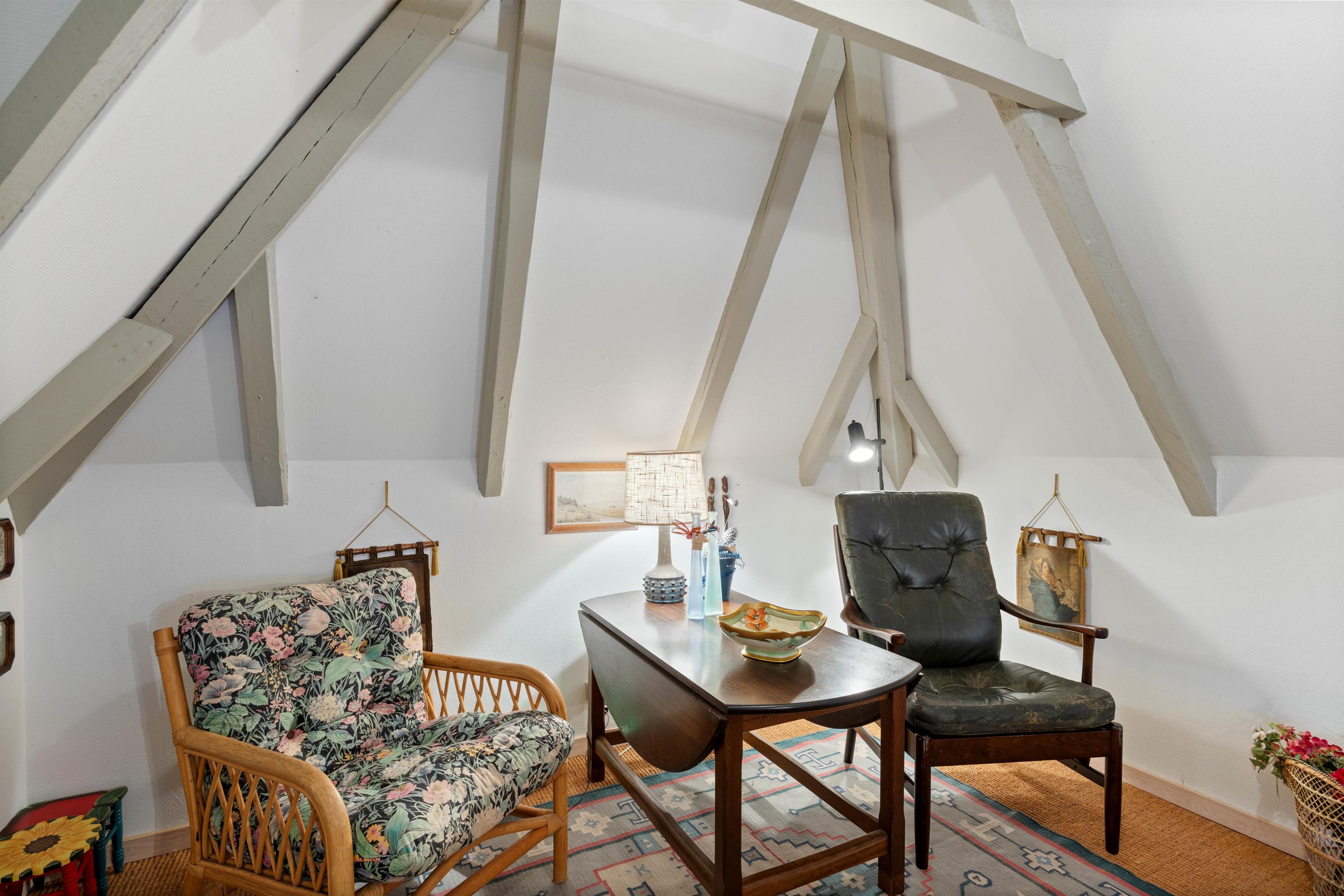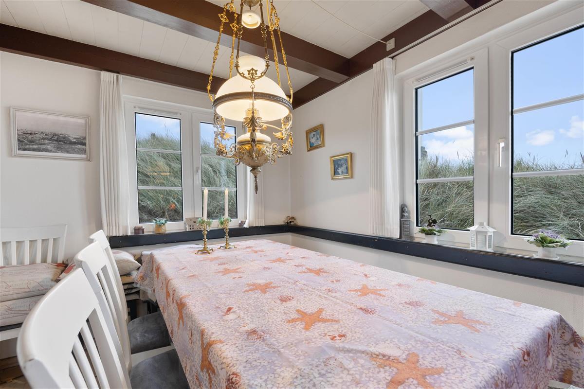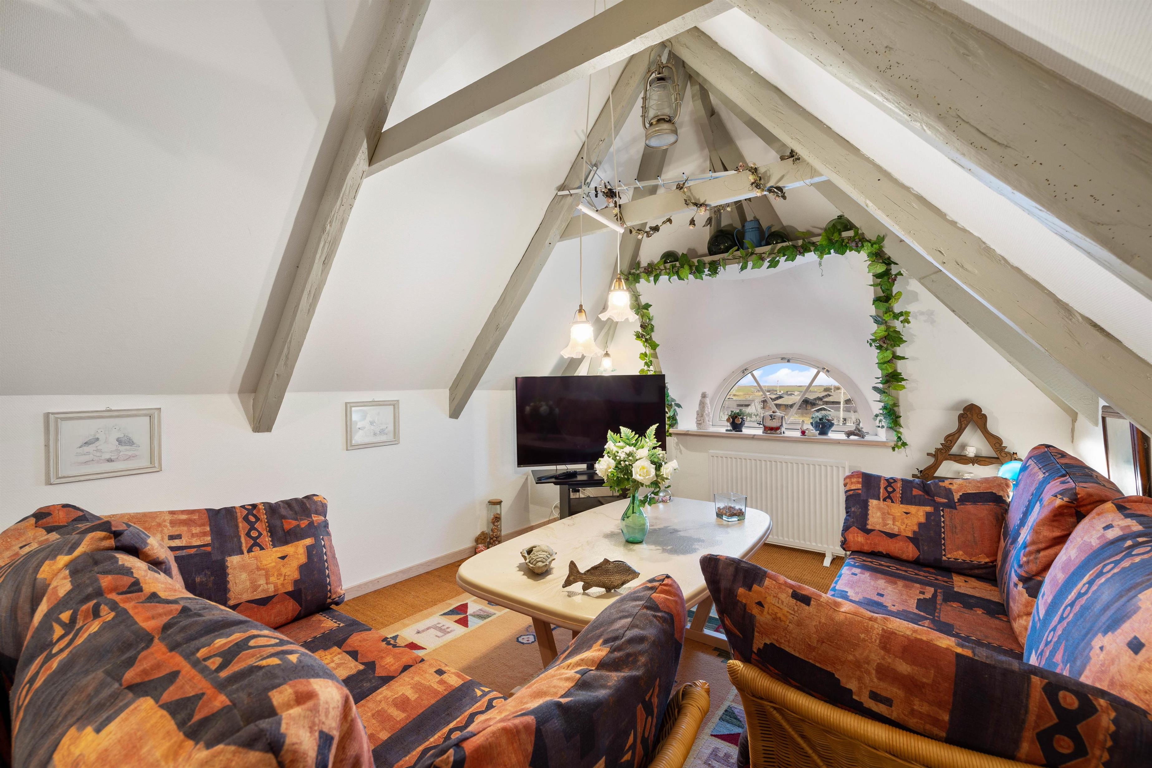 Upon entering the holiday home, you'll be greeted by the classic holiday cottage atmosphere. With its white wooden ceiling and darker wooden beams, the holiday home radiates cosiness, making you feel at home from the moment you arrive. The heart of the house is the living room with its dining area. Here you can enjoy meals together, plan your holiday activities, or relax watching a film on the flat-screen TV. The atmosphere becomes particularly cosy when you light the wood-burning stove in the living room and listen to the crackling flames while enjoying its welcoming warmth.