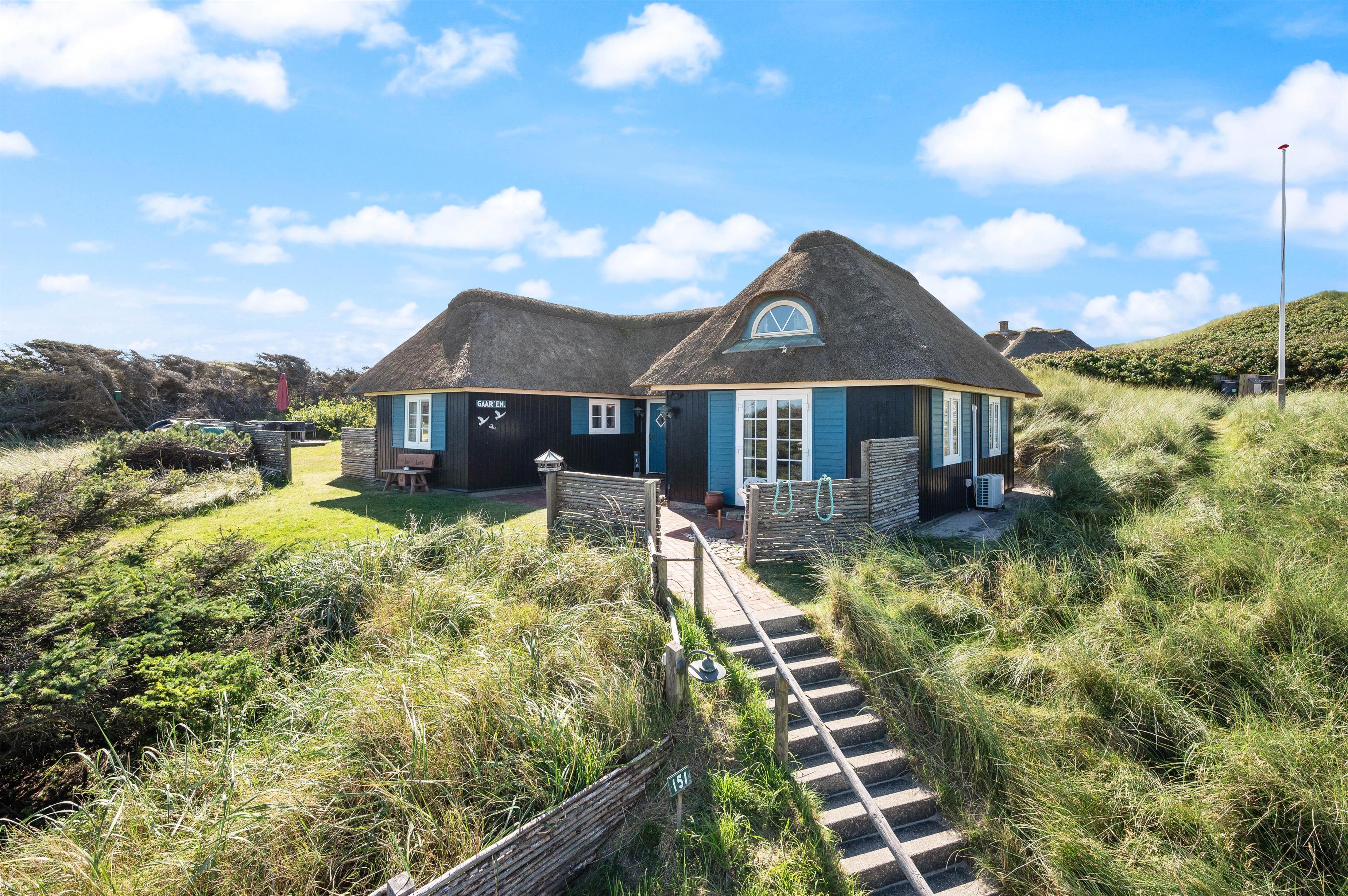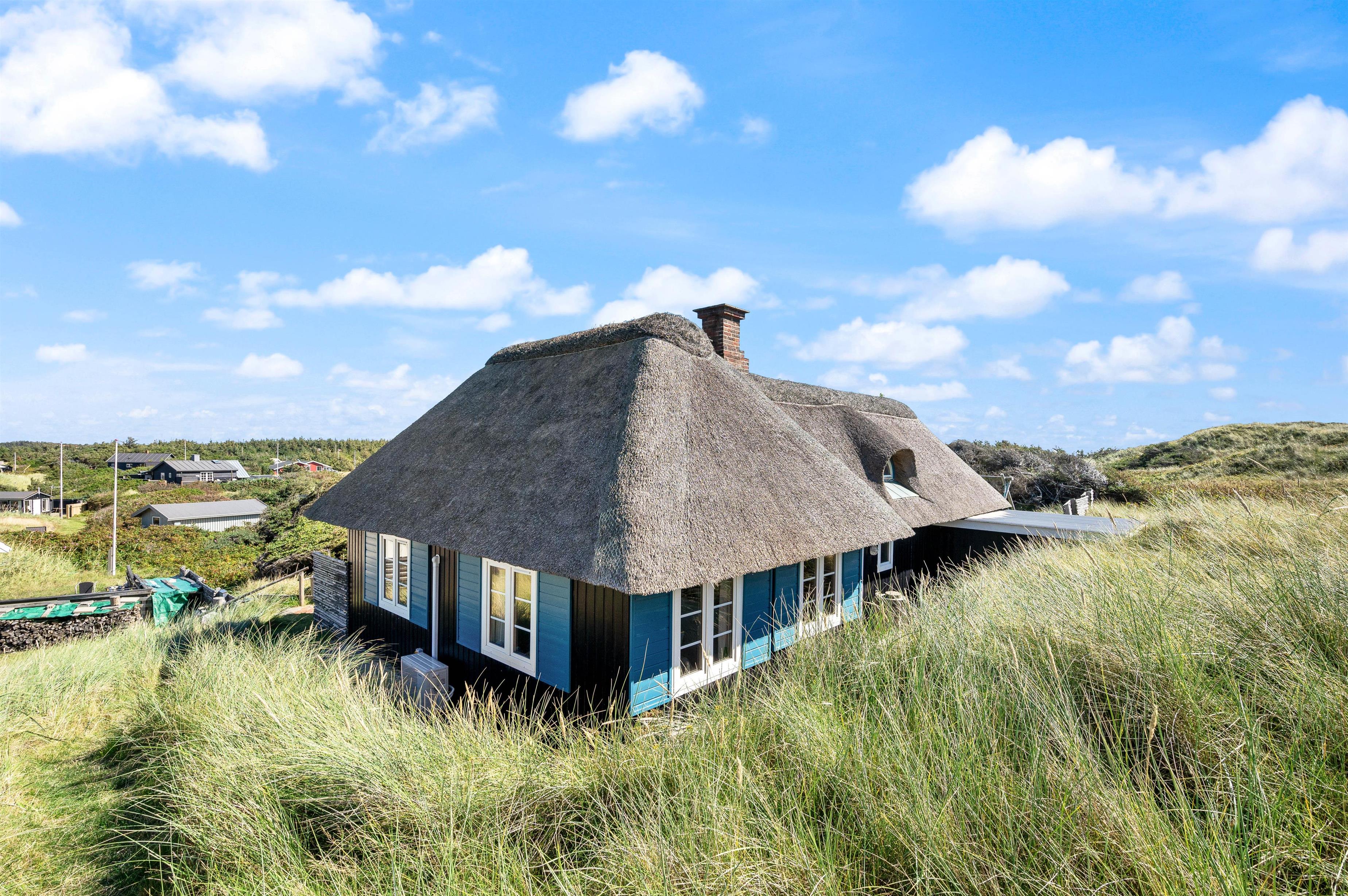 If you're looking for a cosy holiday home in the dunes of Fjand, this holiday home at Bjerghuse 151 is an excellent choice. The thatched holiday home accommodates up to 6 people and is situated in the peaceful holiday region of Fjand on a dune plot, just 100 metres from the Danish West Coast's miles-long beach. After a long beach walk, you can warm up in the private sauna, while the wood-burning stove adds an extra touch of comfort.