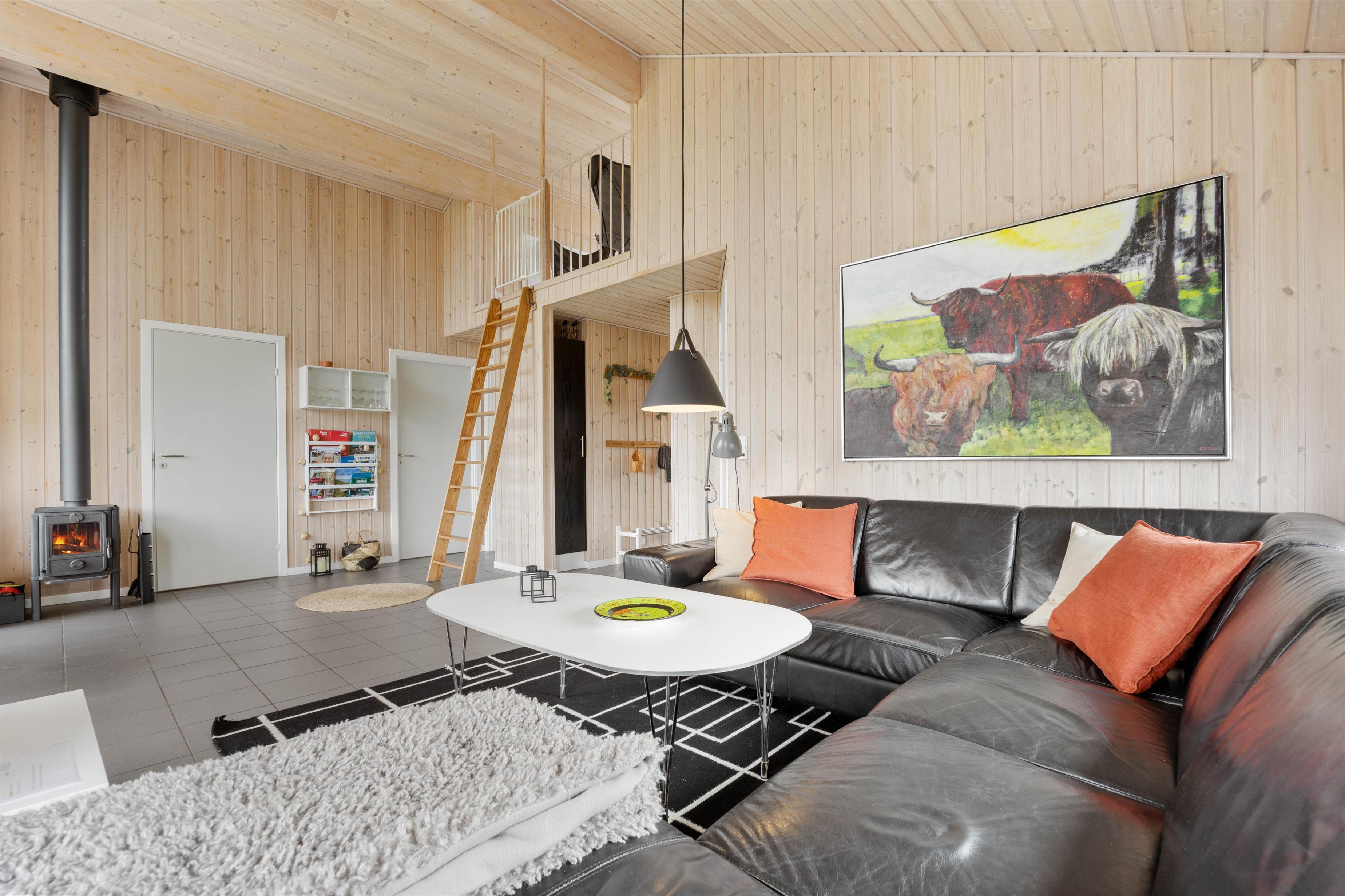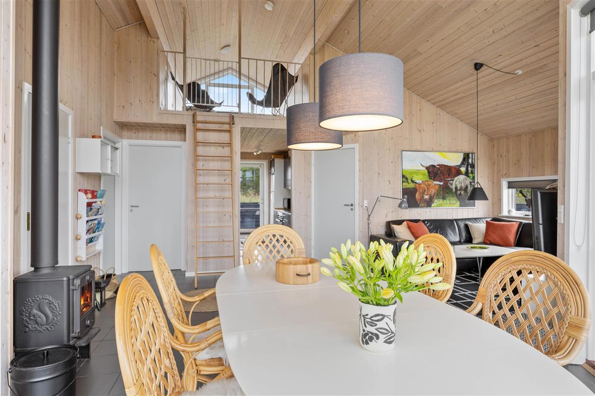 The holiday home at Fjand Strand 52 is comprehensively equipped. The cosy living room, which connects to the kitchen and dining area, naturally includes a wood-burning stove. You can choose between a crackling fire or the energy-efficient heat pump for warmth and comfort. On particularly stormy days when the wood-burner might be temperamental, you can simply rely on the heat pump.