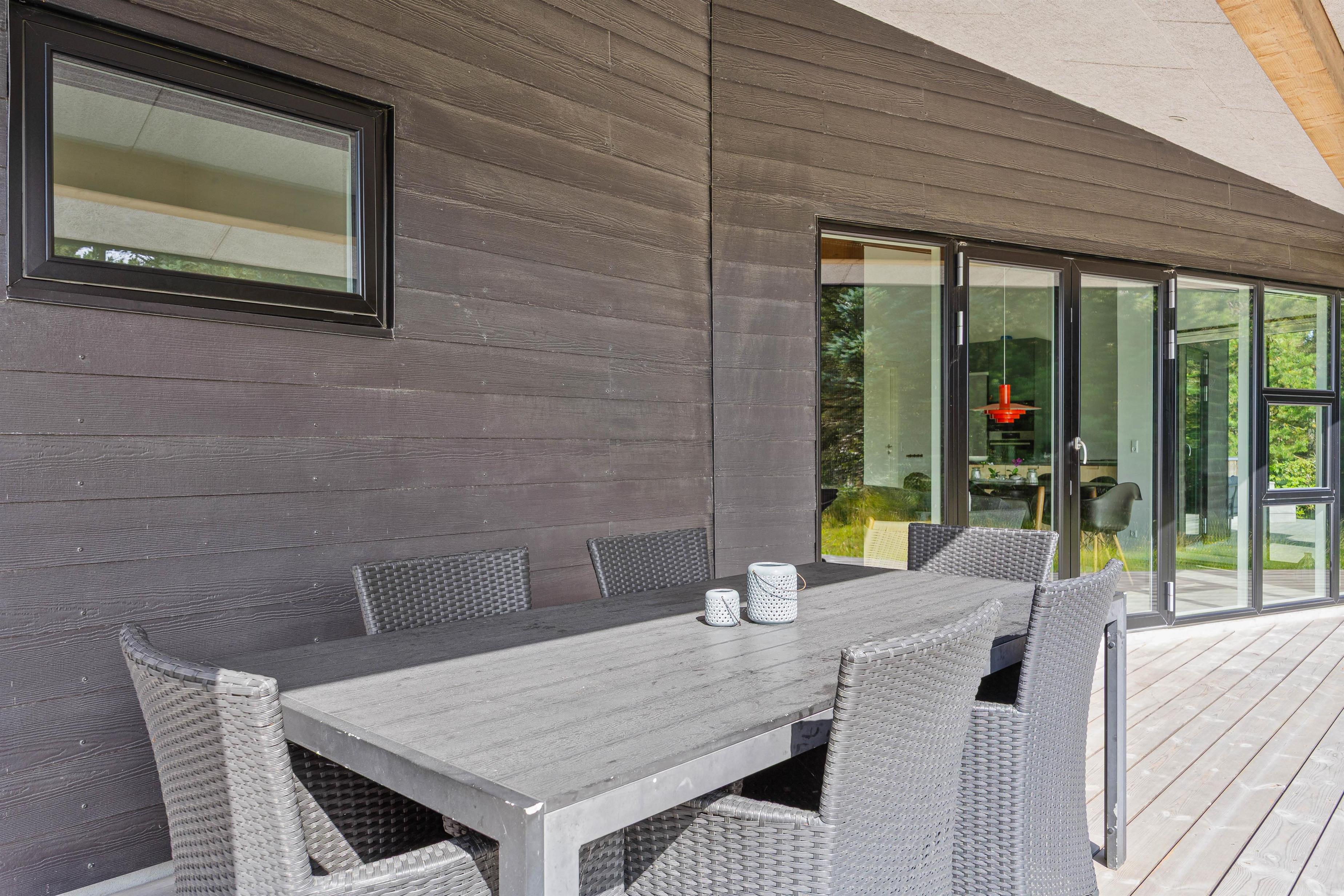 On the 1200 m² natural plot, you will find a beautiful terrace, a whirlpool and an outdoor sauna. Here you can relax and unwind from the stresses of everyday life. The terrace is partly covered and has been tastefully decorated with garden furniture and sun loungers. Nothing stands in the way of a barbecue evening or extensive sunbathing. The sofa modules for the outdoor sofa can be converted into deck chairs, providing even more seating space.