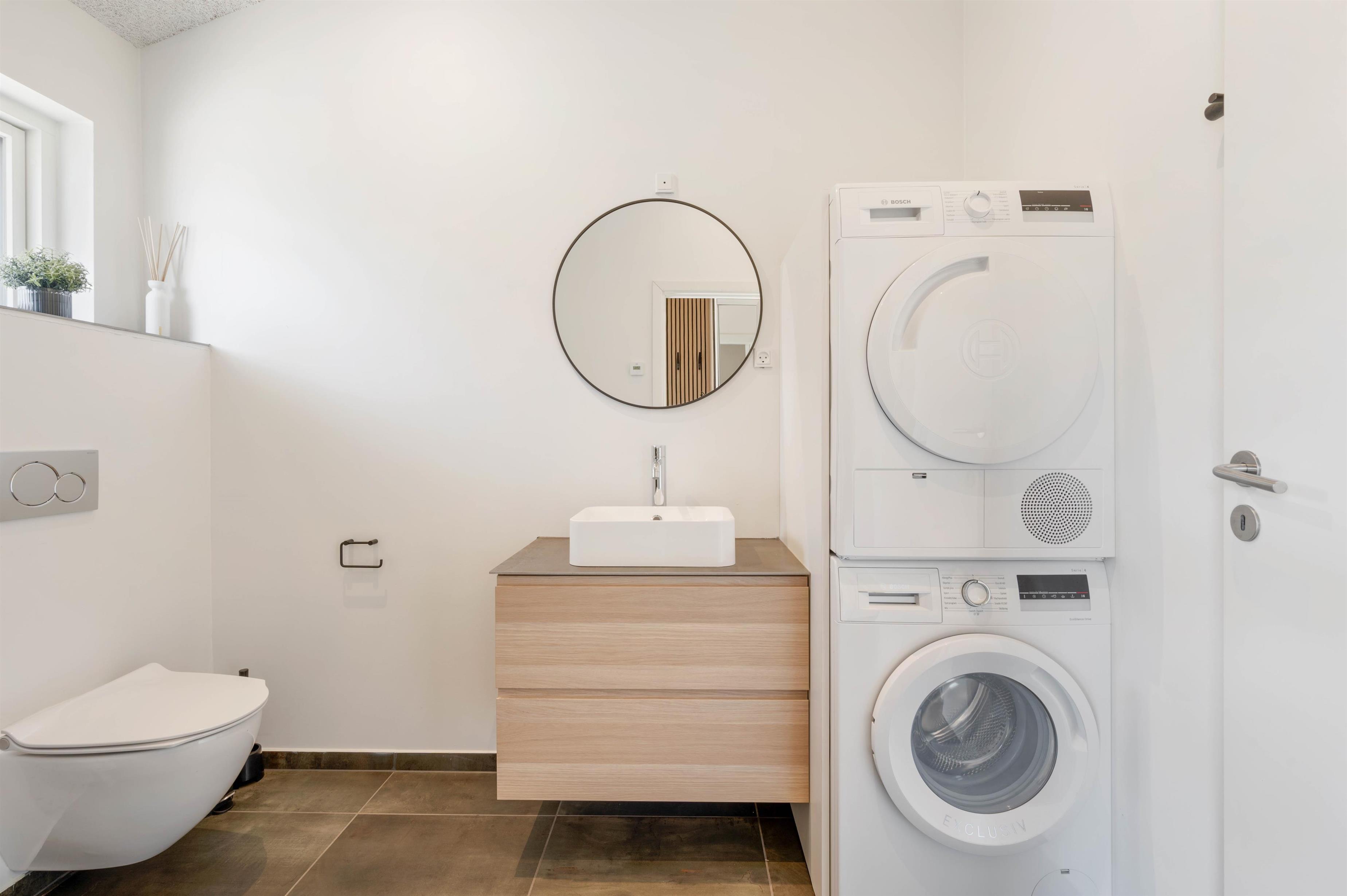 The vacation home has 2 modern bathrooms, both of which are equipped with underfloor heating. It is ideal for 2 families vacationing together, as each family can have their own bathroom. One bathroom has a washing machine and tumble dryer. There are 2 double beds and 2 single beds divided into 3 bedrooms.