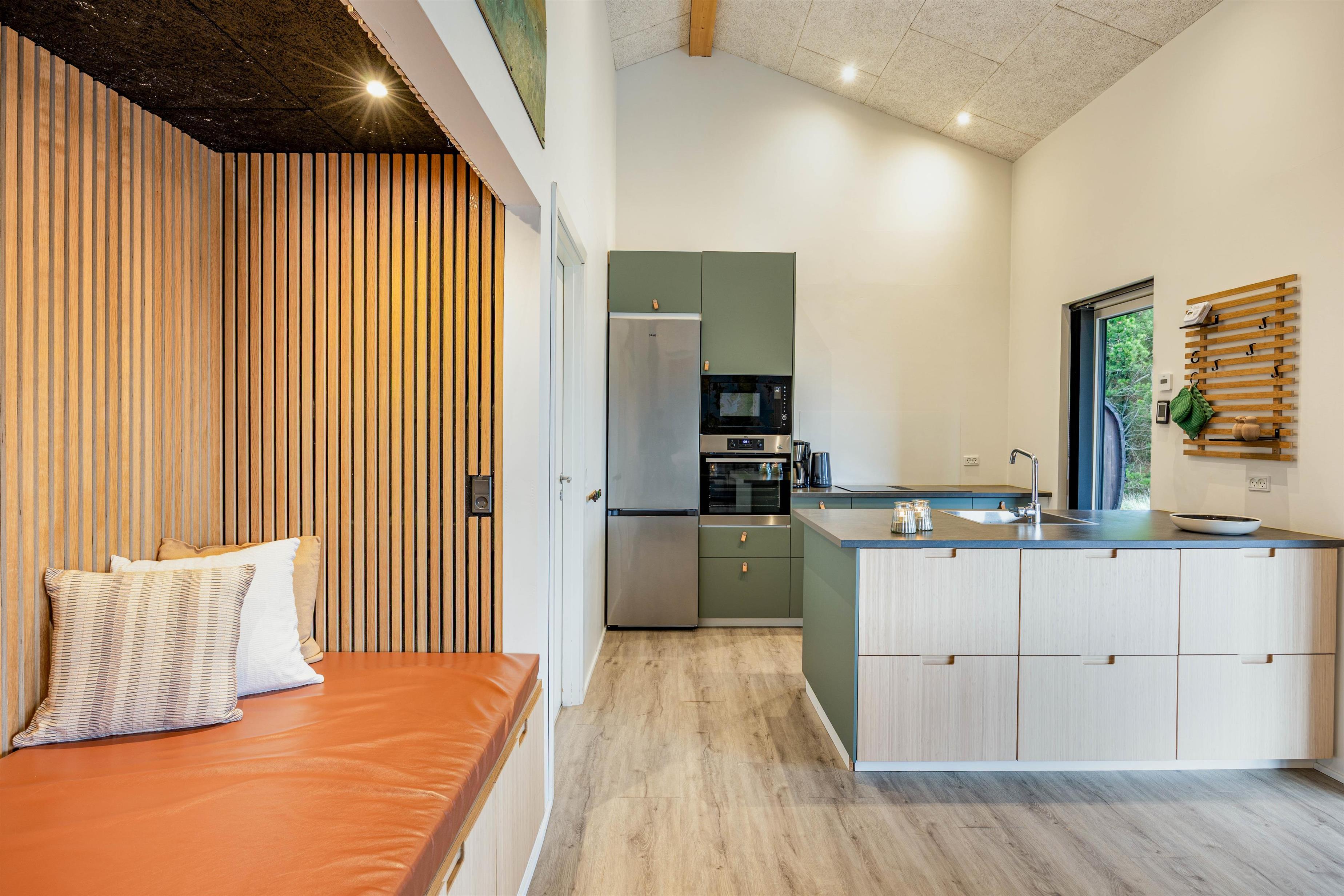 The heart of the vacation home is the open-plan living and dining area with adjoining open kitchen. This is where everyone can get together and spend many pleasant hours together. The living area is flooded with light, with a beautiful view and has a cozy sofa and a nice dining table. When it slowly gets darker and cooler outside, it is particularly worth lighting a fire in the fireplace and enjoying the special atmosphere. There is also a cozy and well-lit alcove where you can retreat to read a good book. The living area is equipped with underfloor heating and a noise-suppressing floor. In addition, the energy-saving air-to-water heat pump ensures pleasant temperatures.