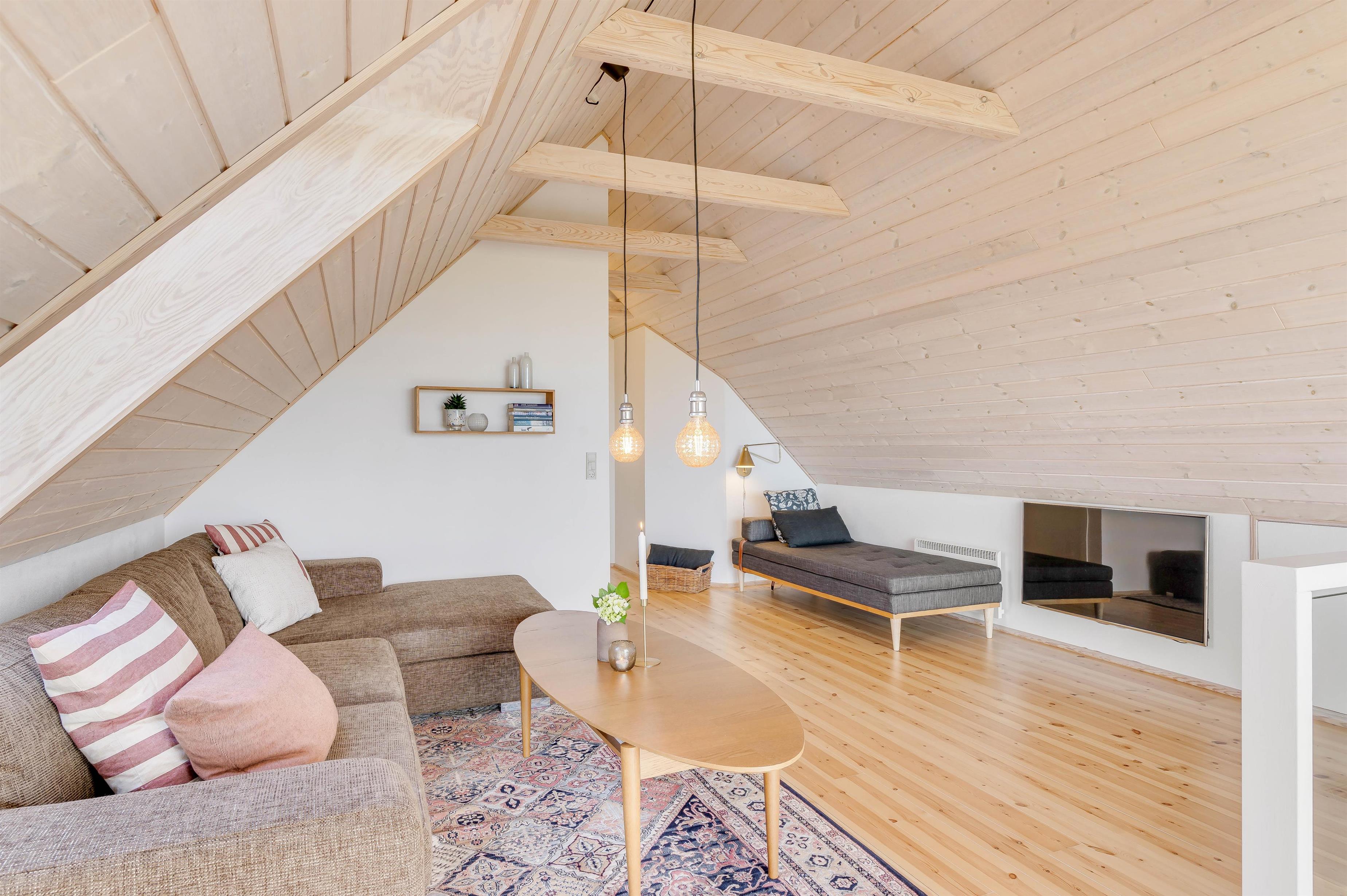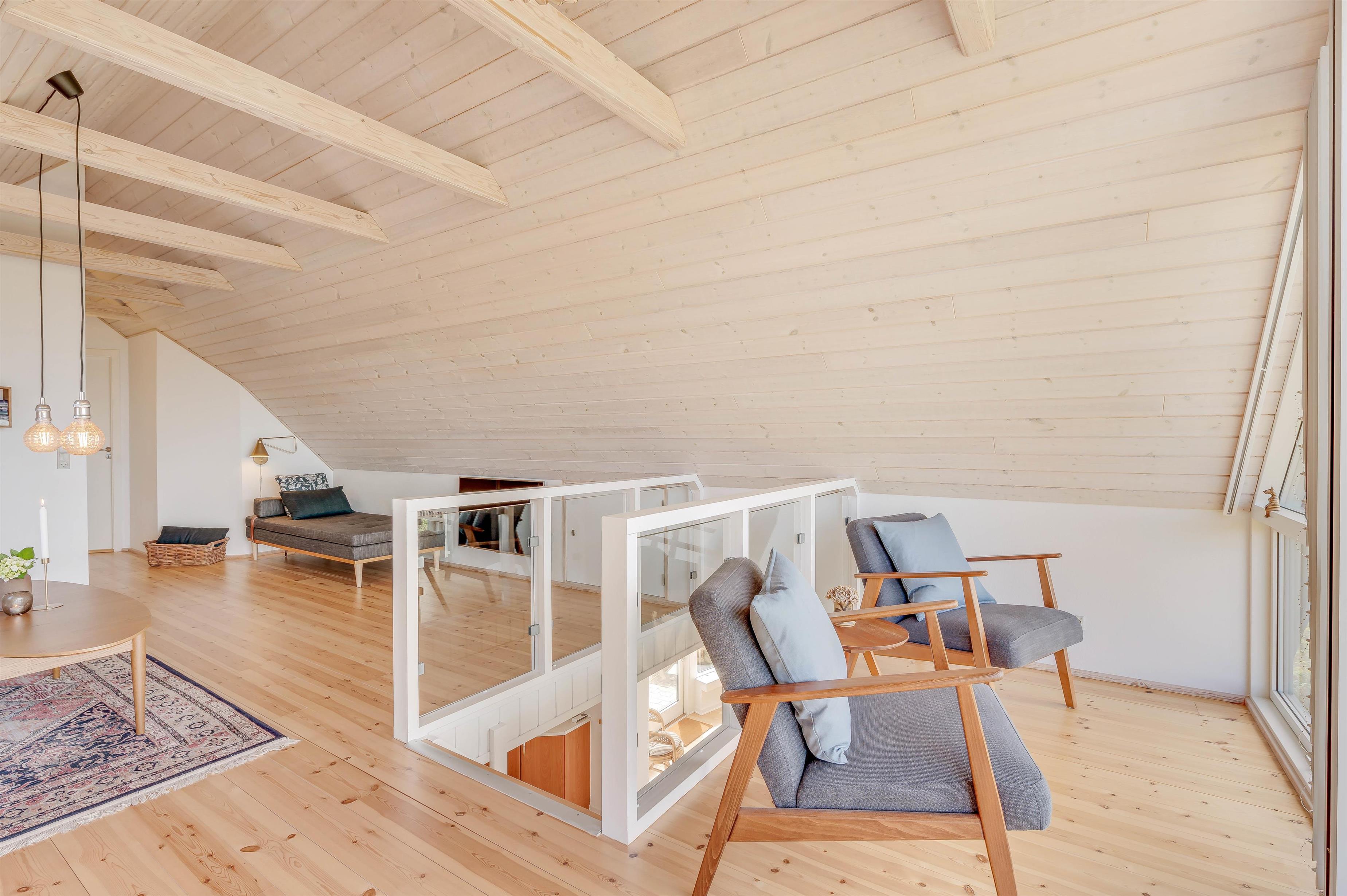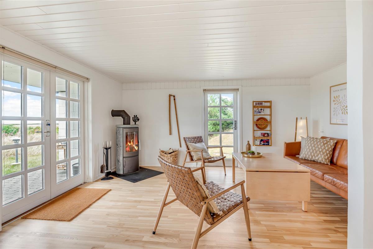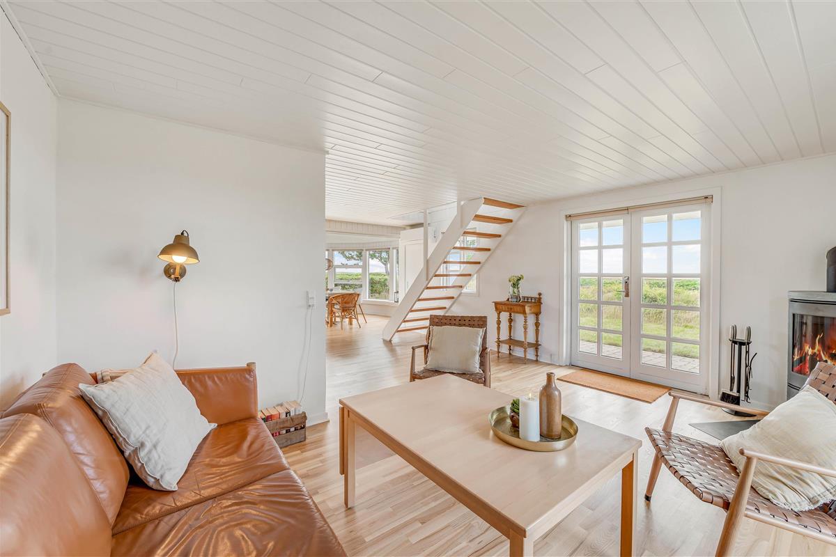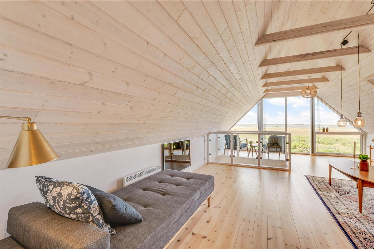 The remaining two bedrooms are located on the first floor. One bedroom features a double bed, while the other has a single bed. The first floor also includes a comfortable TV room offering stunning views over Nissum Fjord, plus a guest toilet.