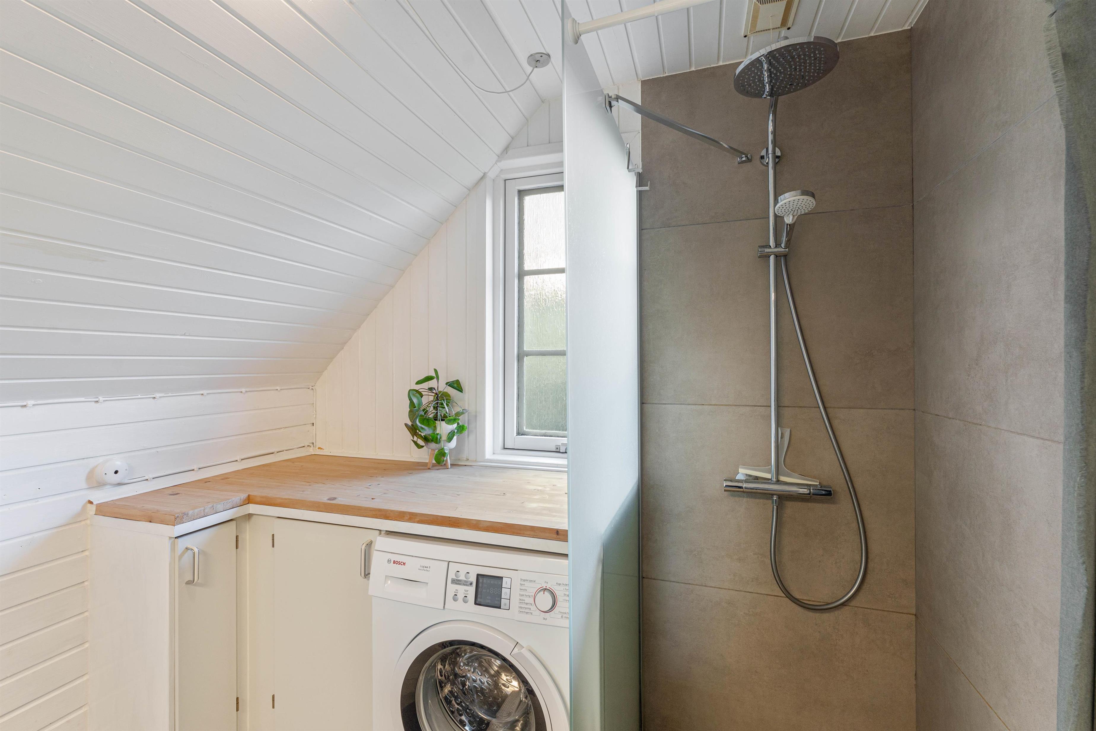 The naturally-lit bathroom features a shower enclosure and a washing machine. So there's no need to worry if you can't fit all your clothes in the car.
