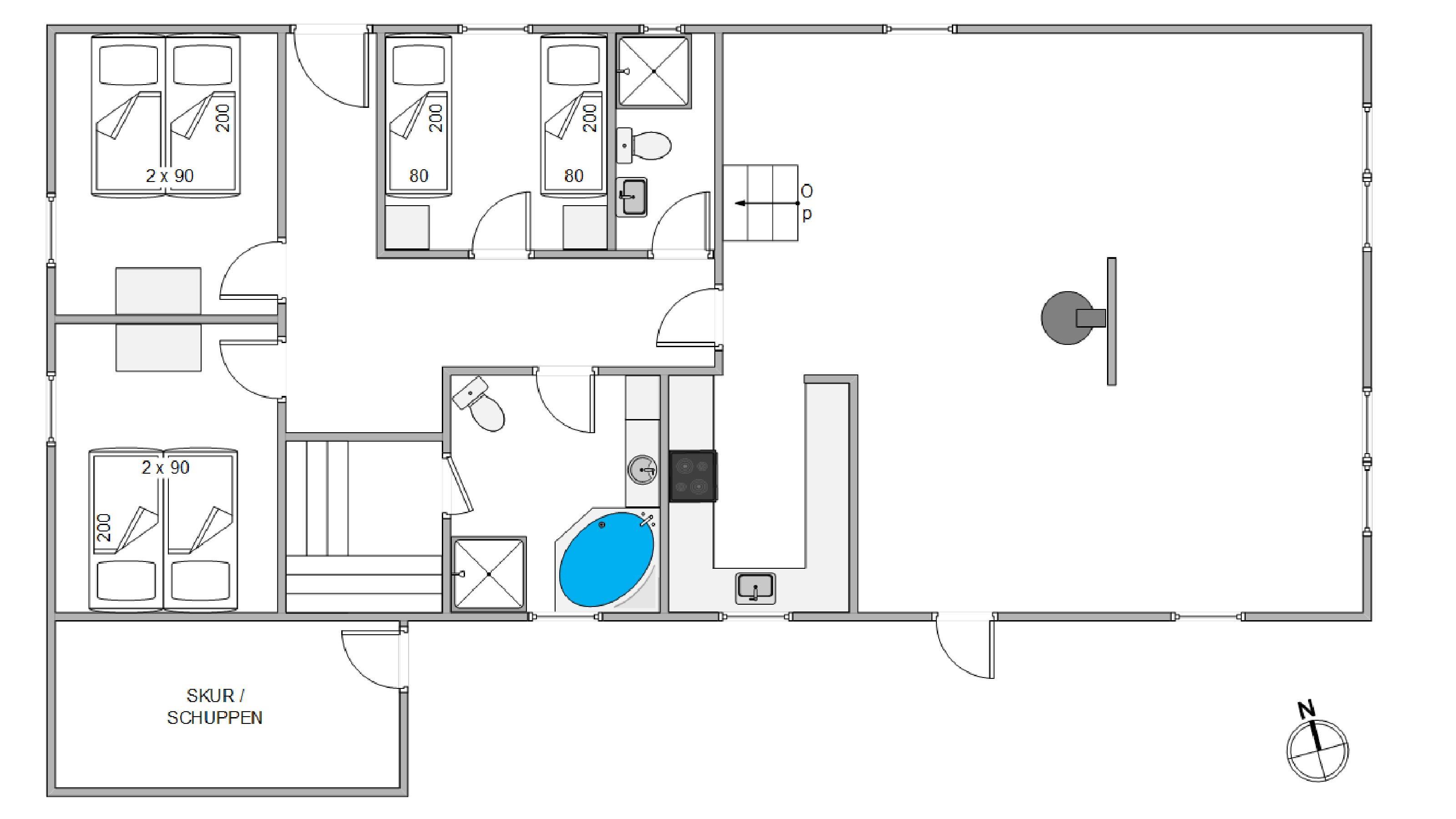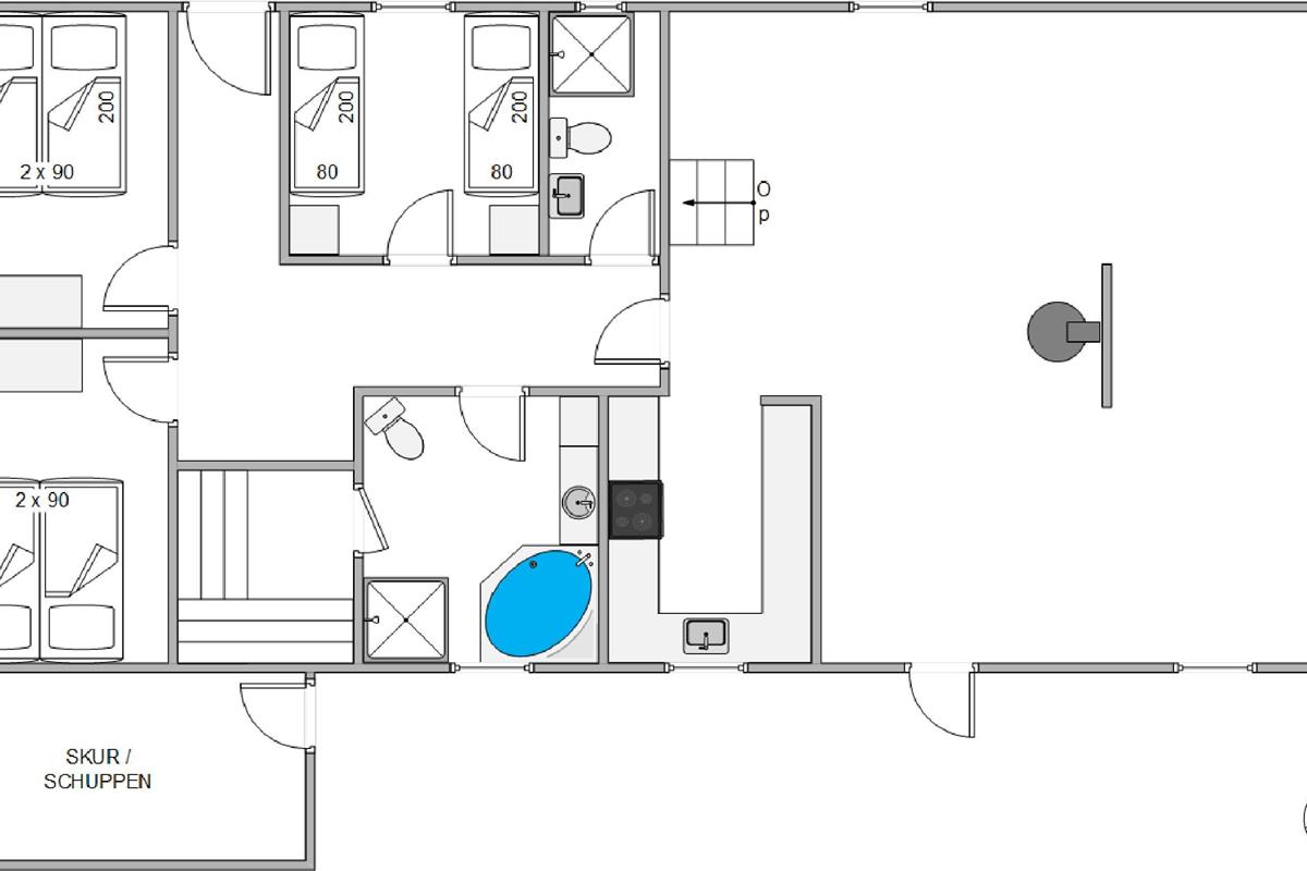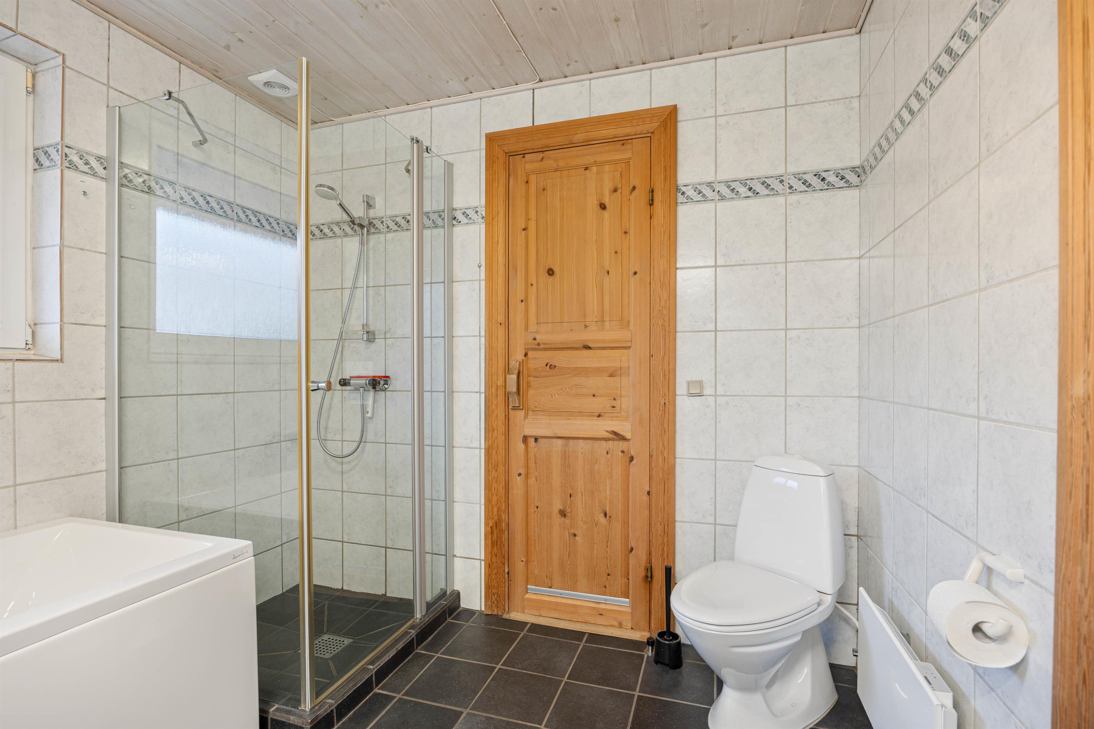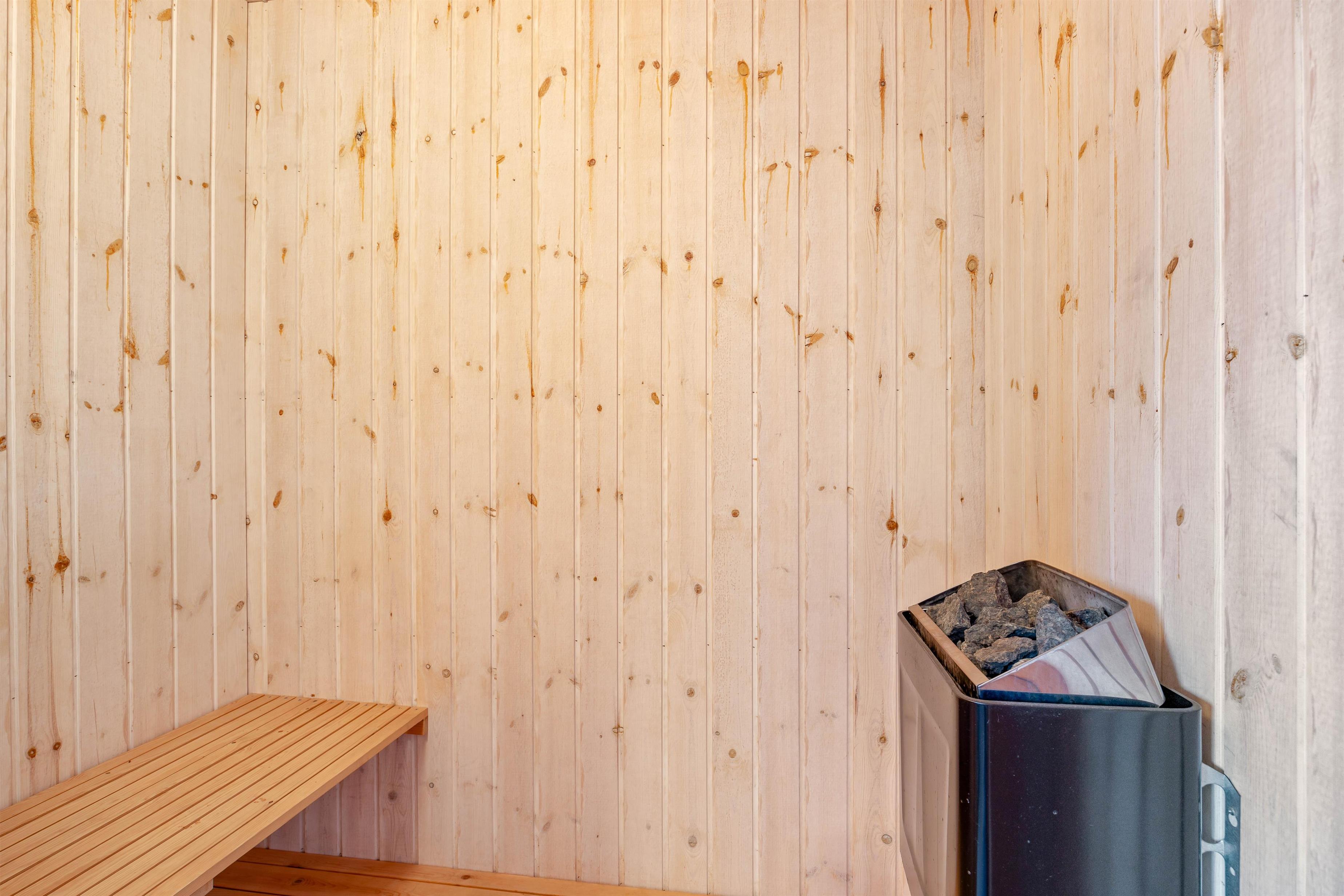 Here you can recharge after a long day. The hallway also leads to the holiday home's two bathrooms, perfect for maintaining privacy when holidaying with friends. After a long beach walk, you can warm up and unwind in the house's own sauna and hot tub.